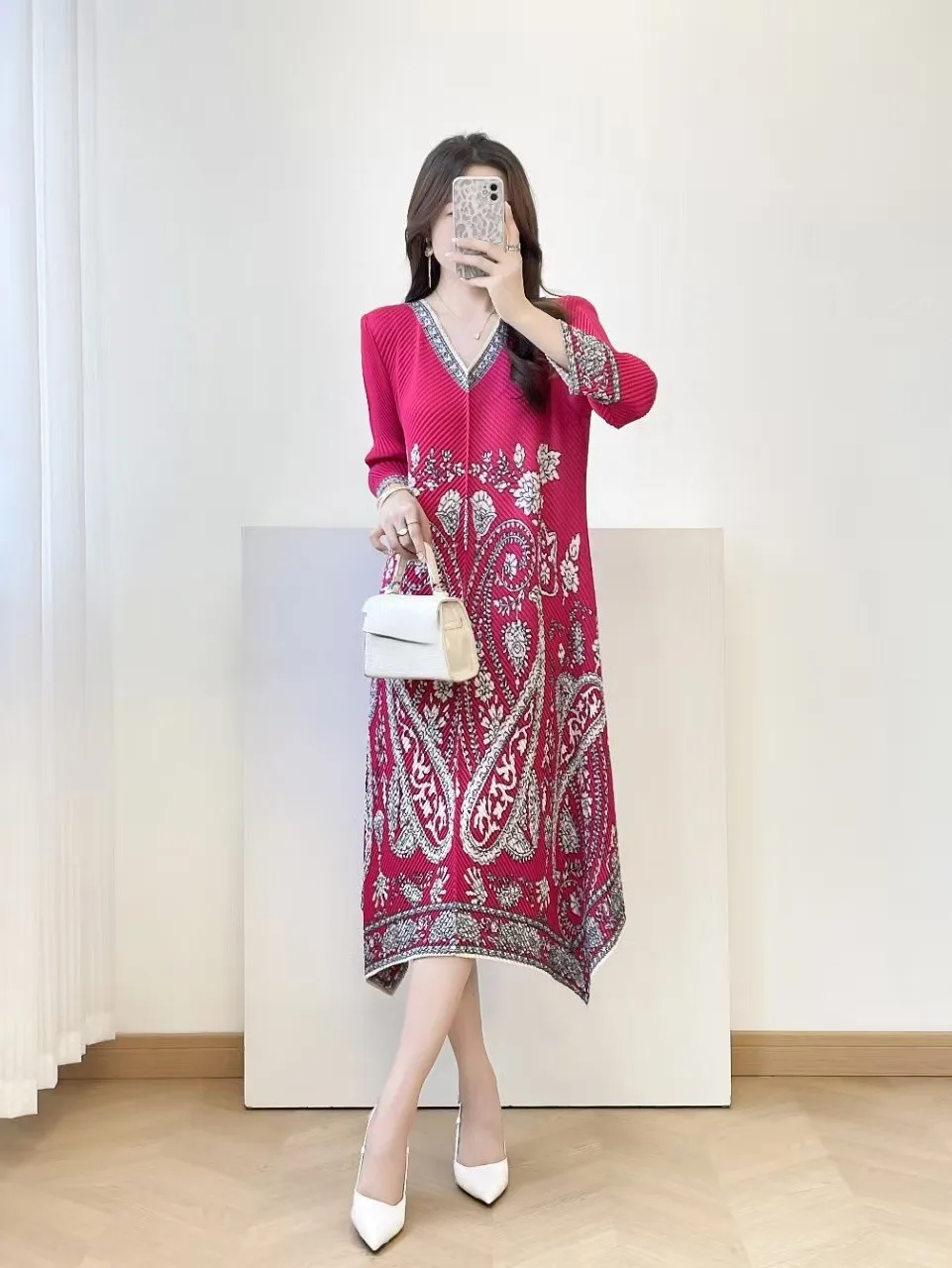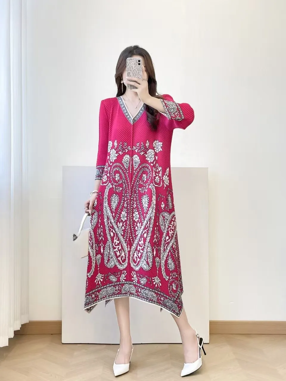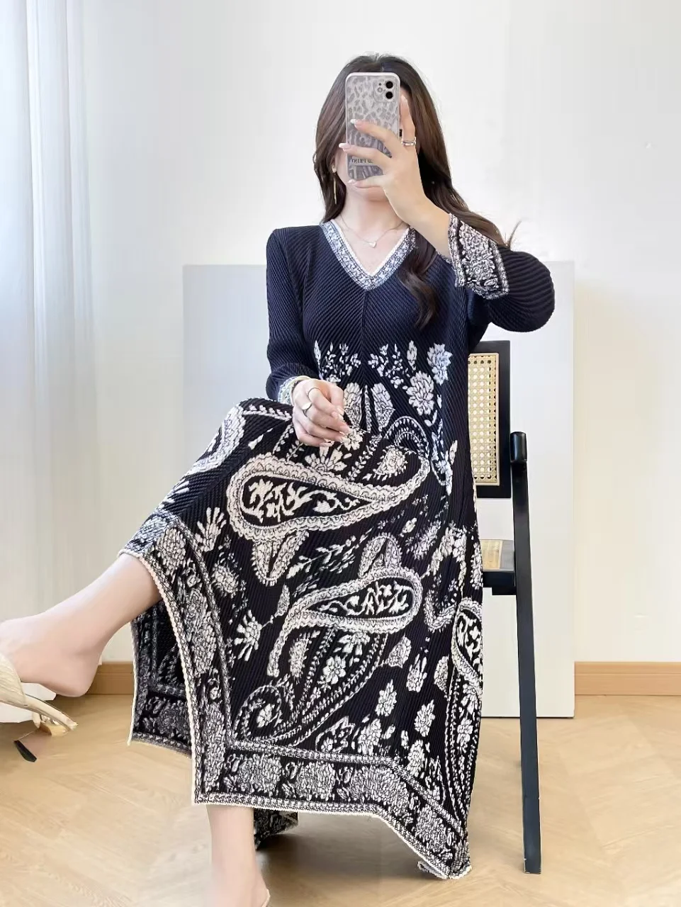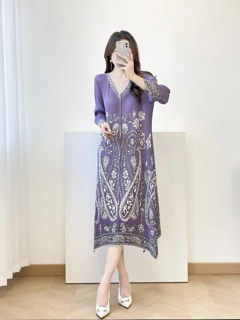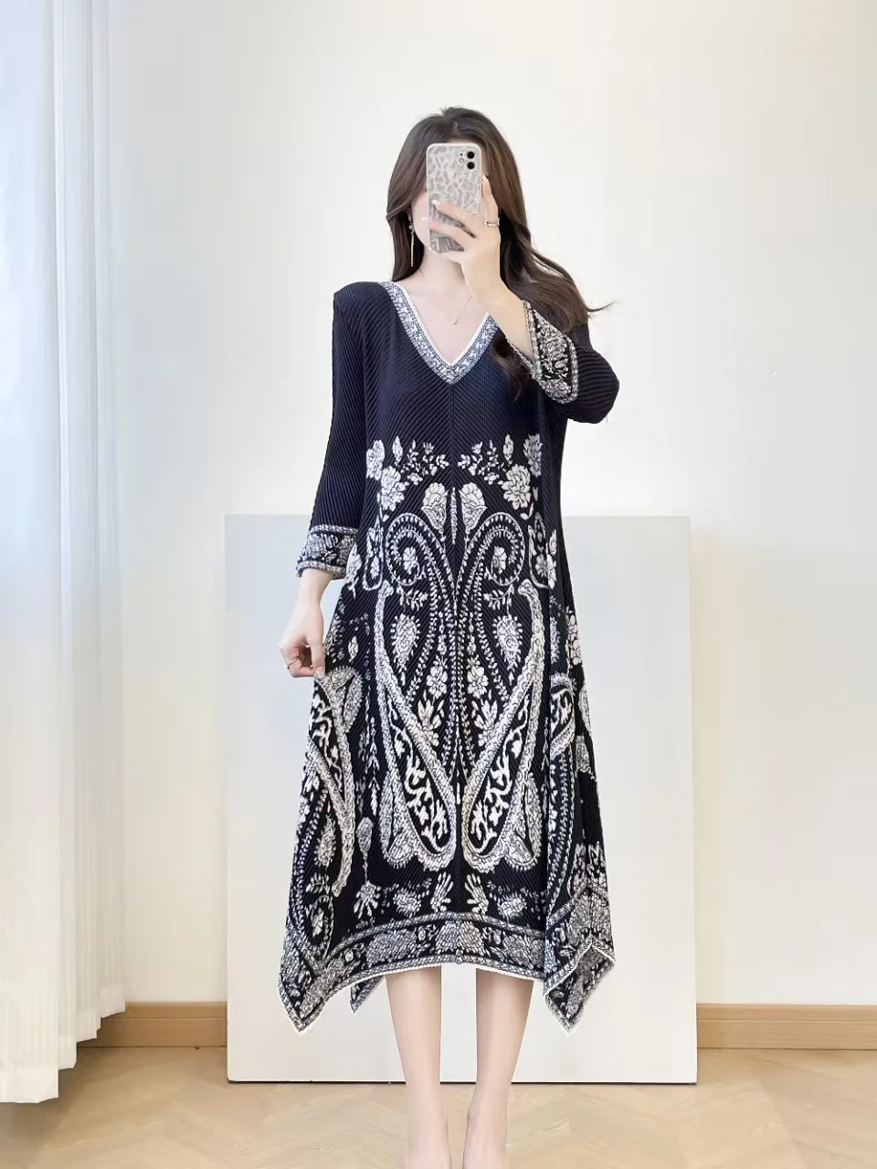Display the Special Sale Women's Printed Pleated Dress in a Loose Fit with a V-neck and Long Sleeves for Casual Wear