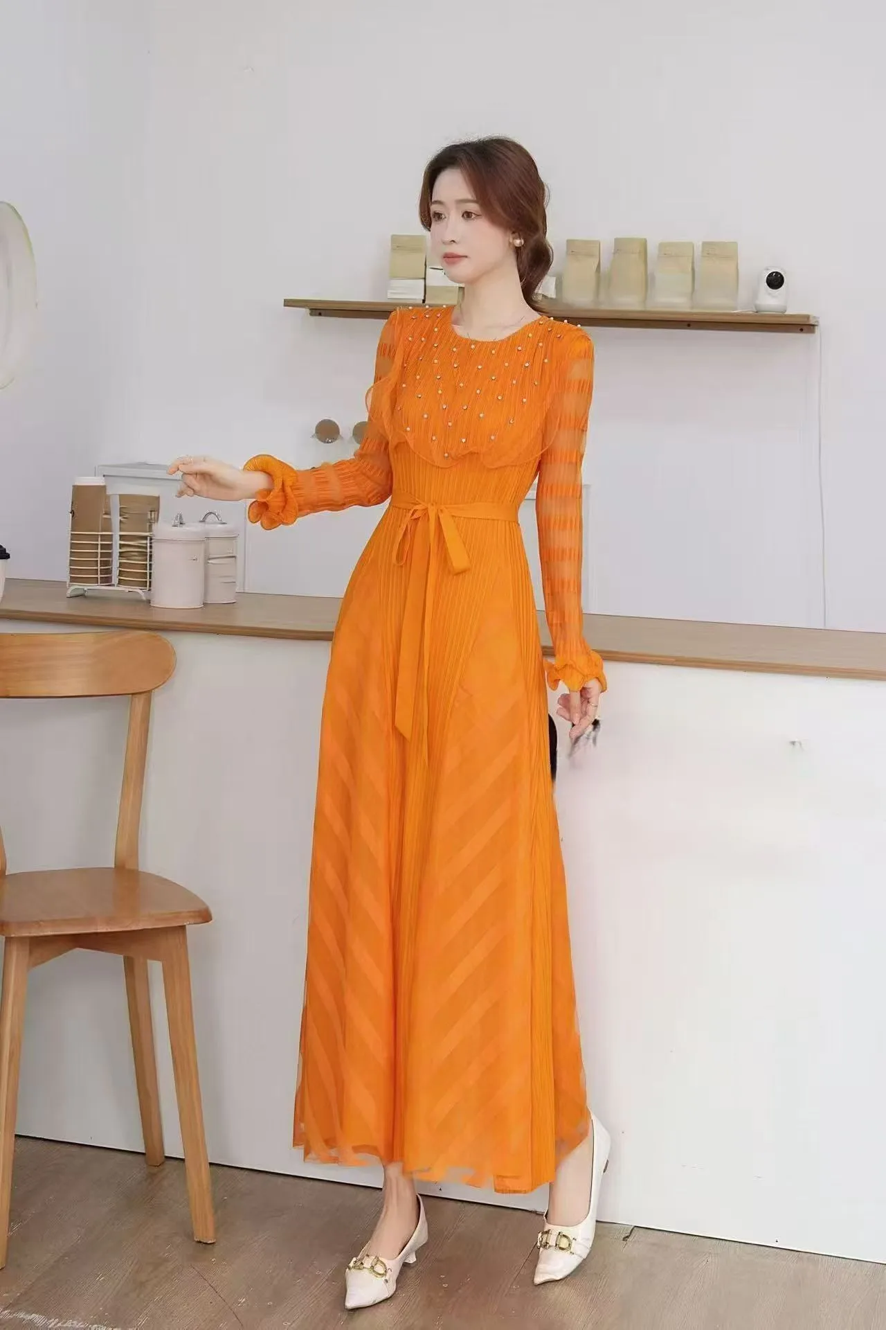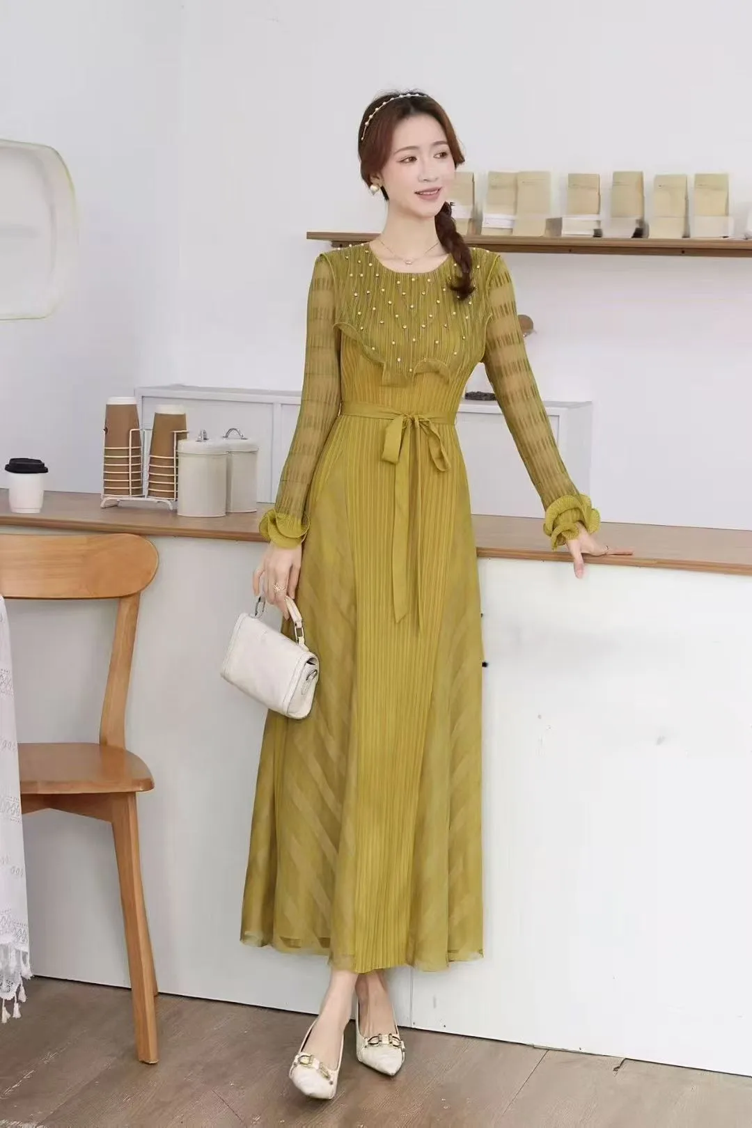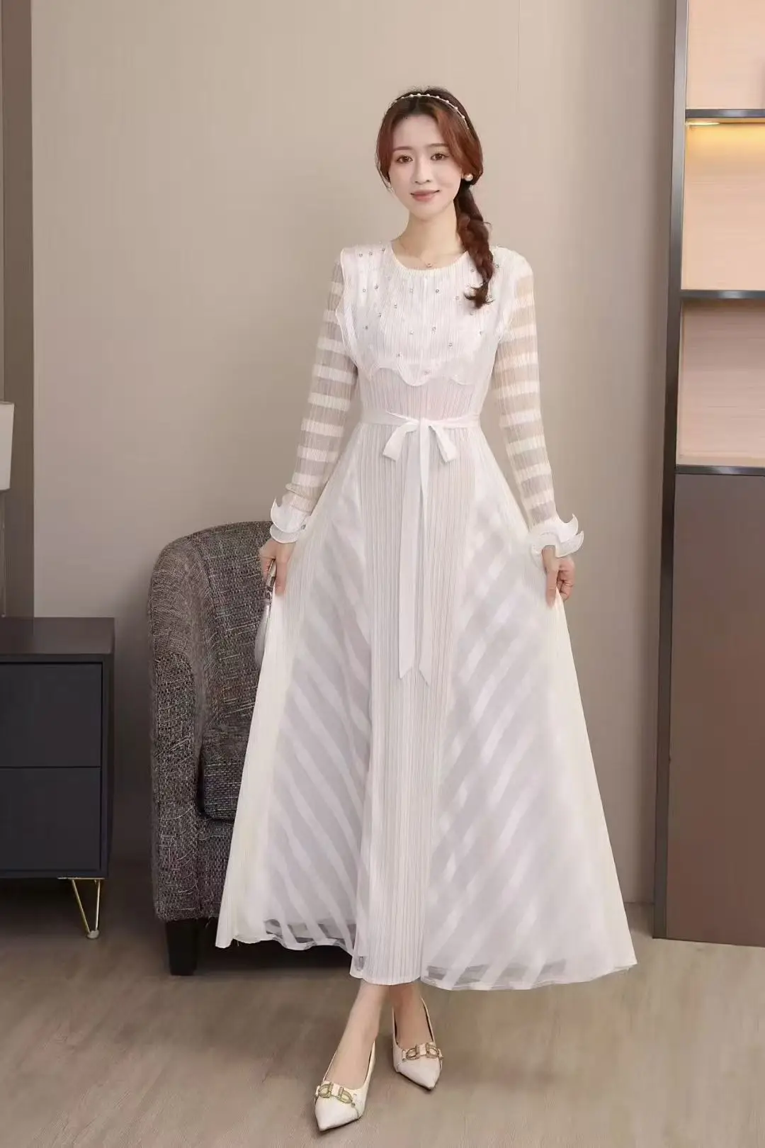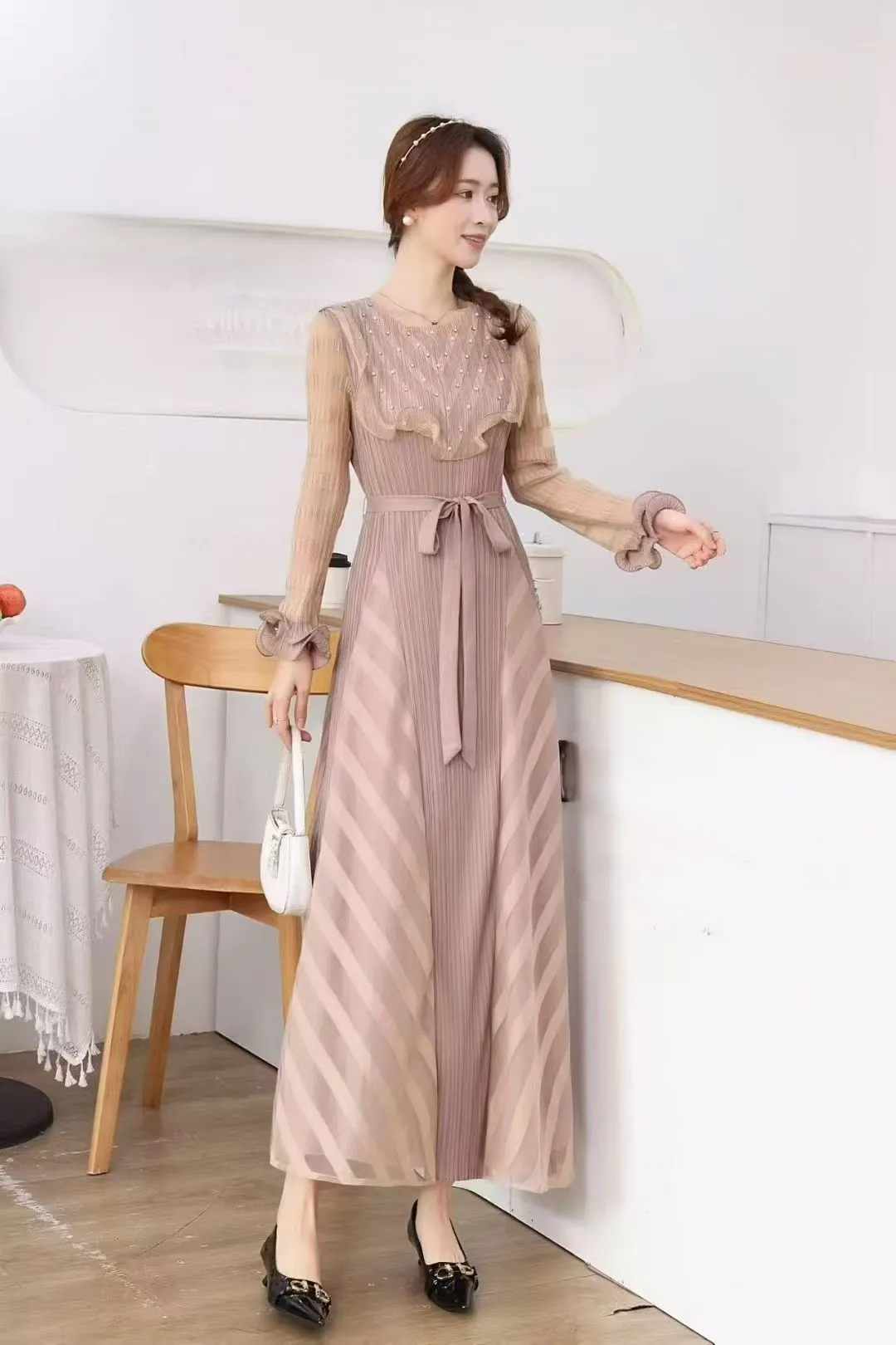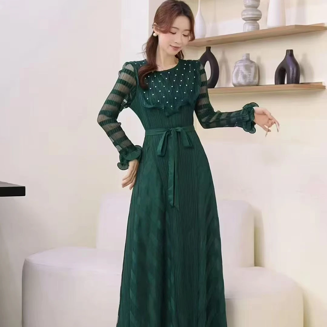 Women's High-end and Elegant Plus-size Dress with Comfortable Round-neck Long Sleeves and Beaded Design Featuring Pleated Dress