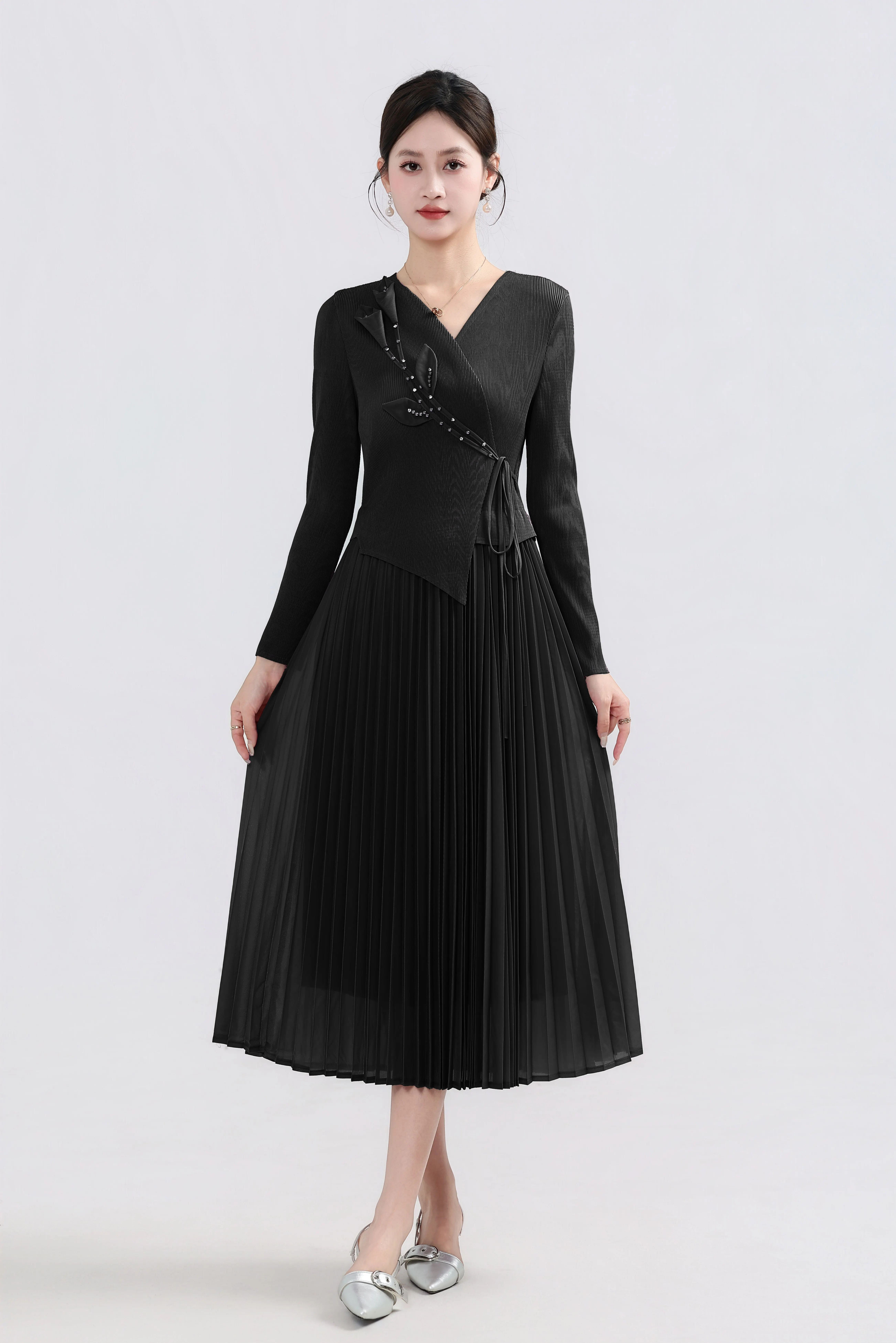 Elegant Pleated Midi Dress for Women - V-Neck Long Sleeve Knitted Top with Chiffon Skirt