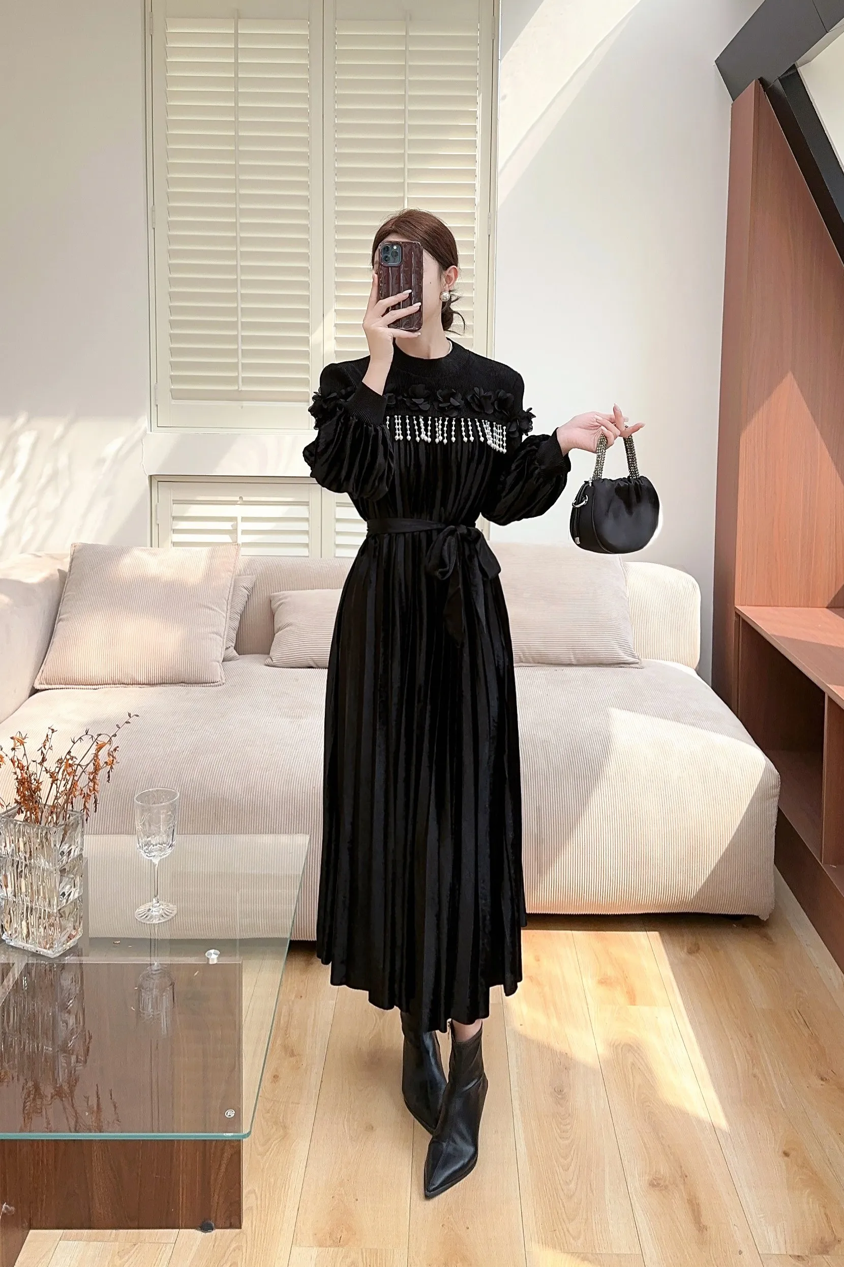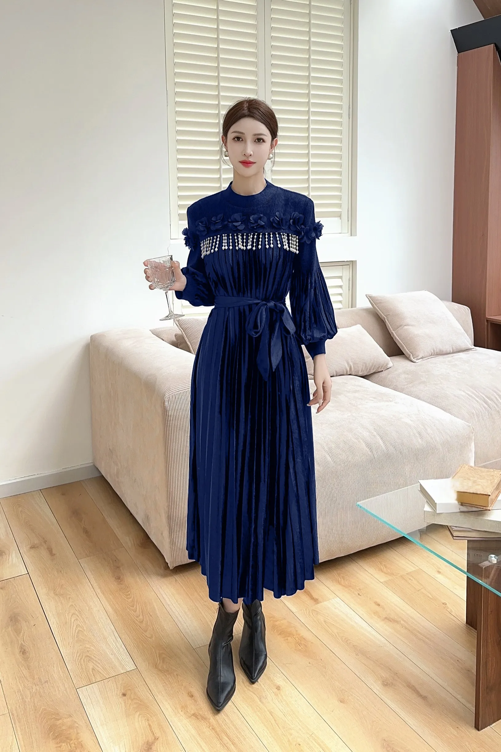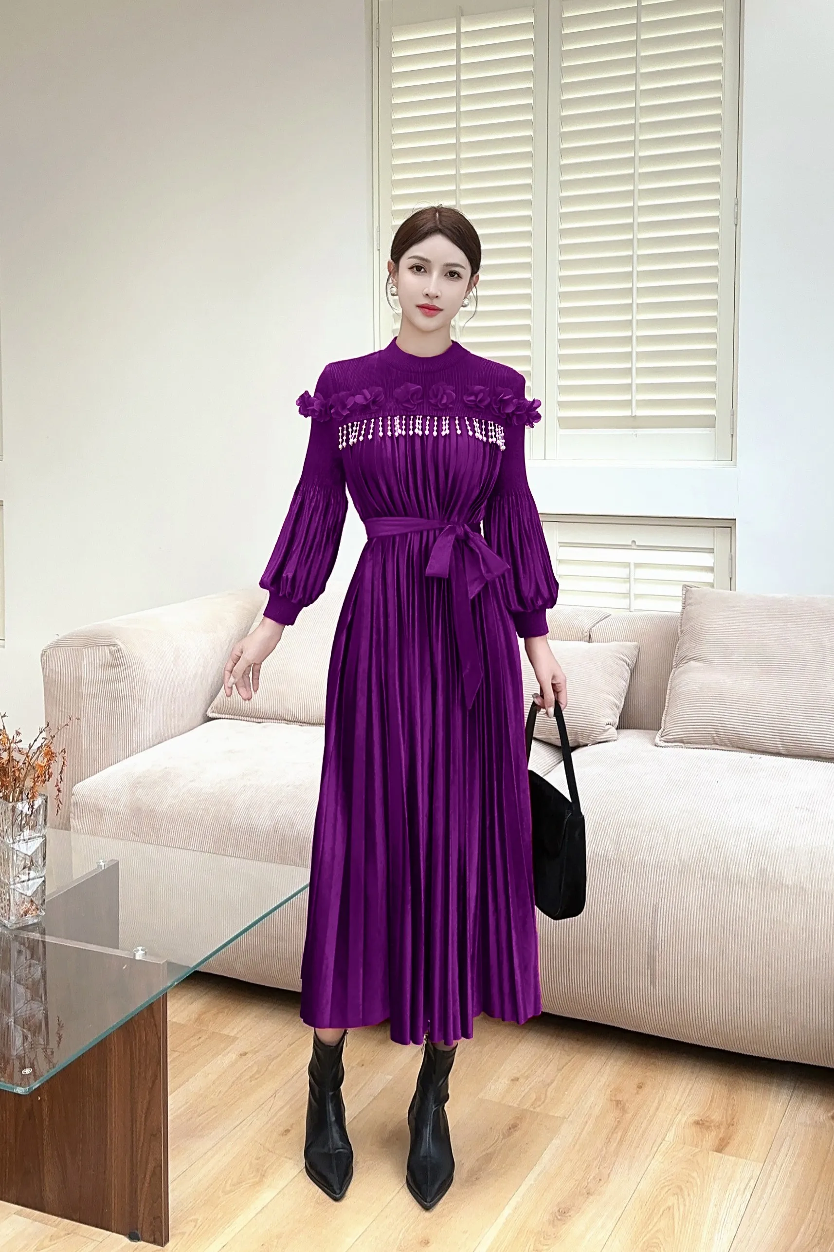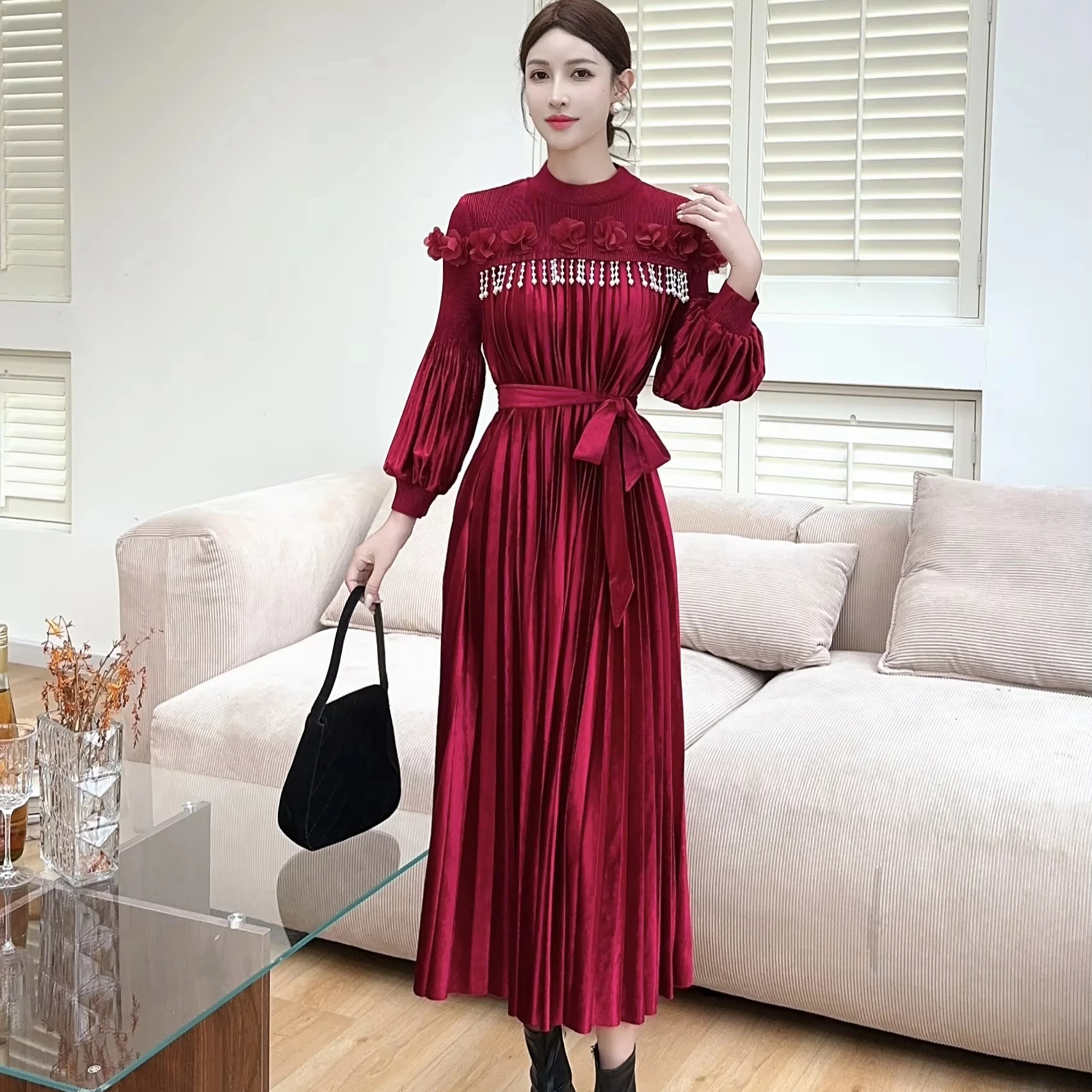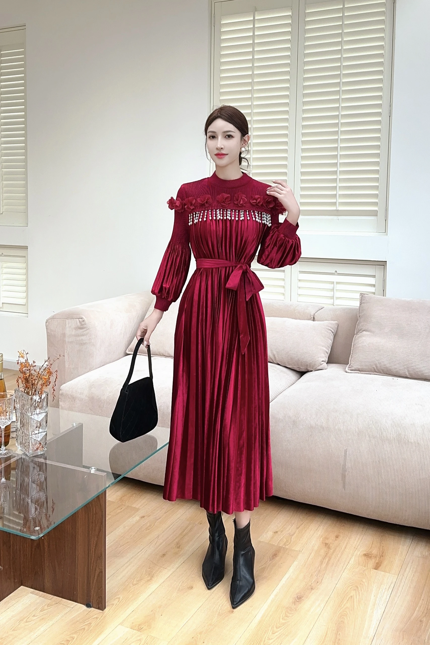 High-quality Velvet Dress with Beaded Ruffled Sleeves, Elegant Mid-length Miyake Pleated Dress