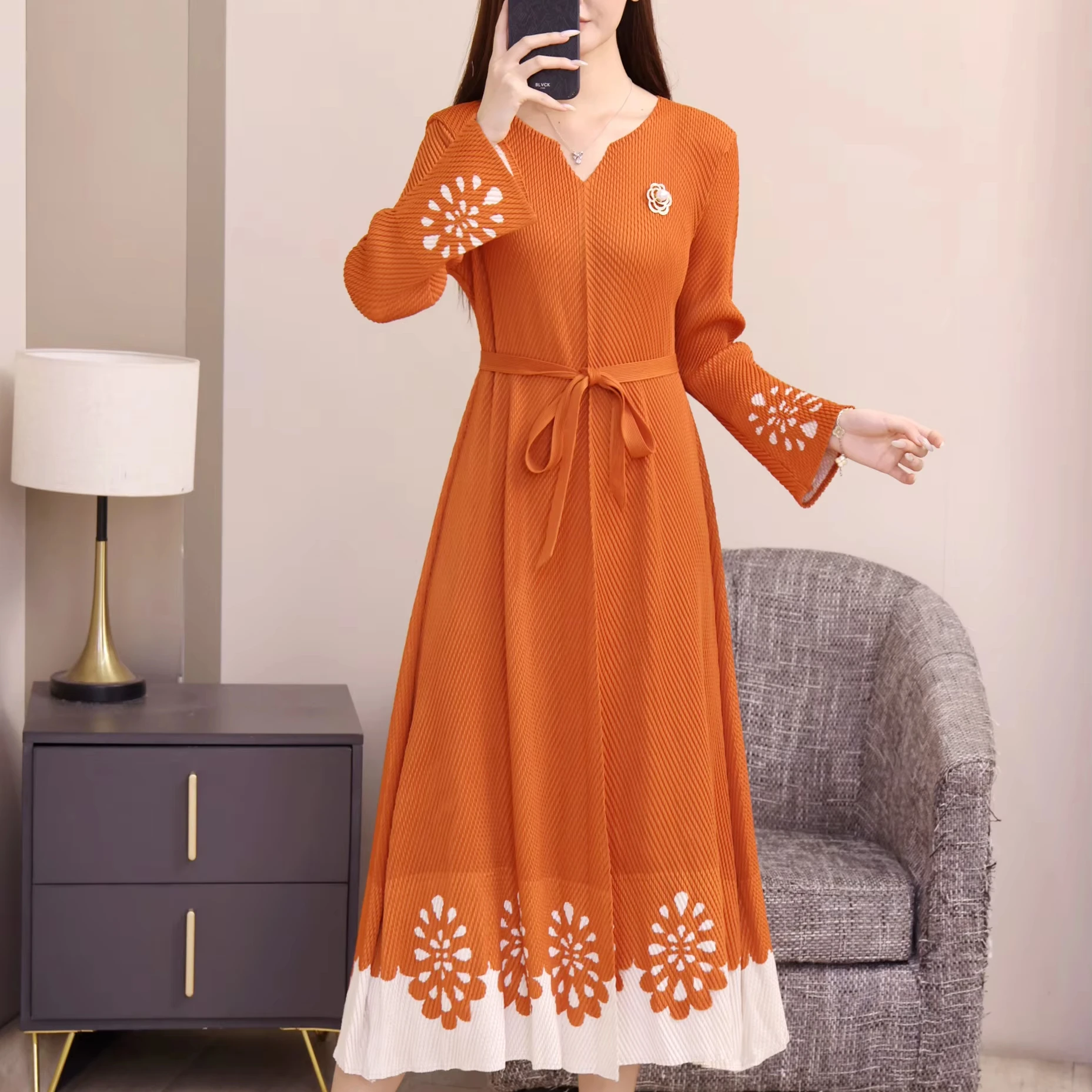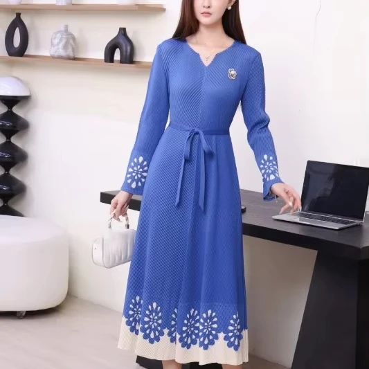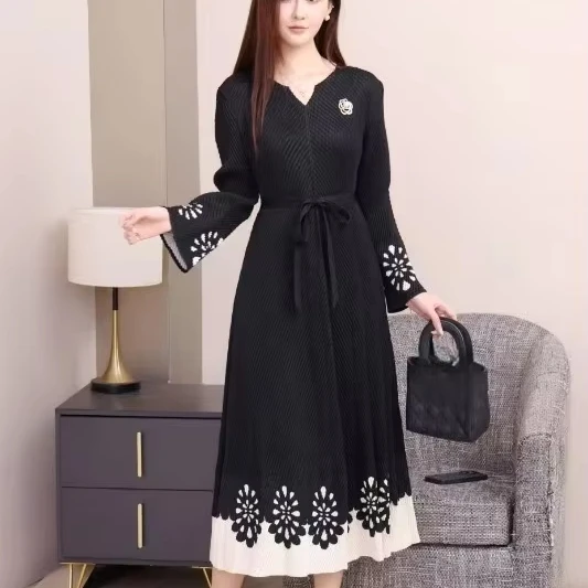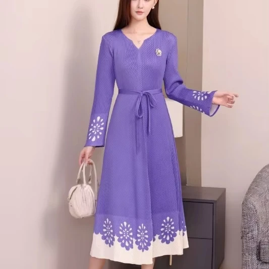 Long and Mid-length Casual Oversized Dress with Long Sleeves and a Belt, Elegant and Pleated Dress with a Graceful Style