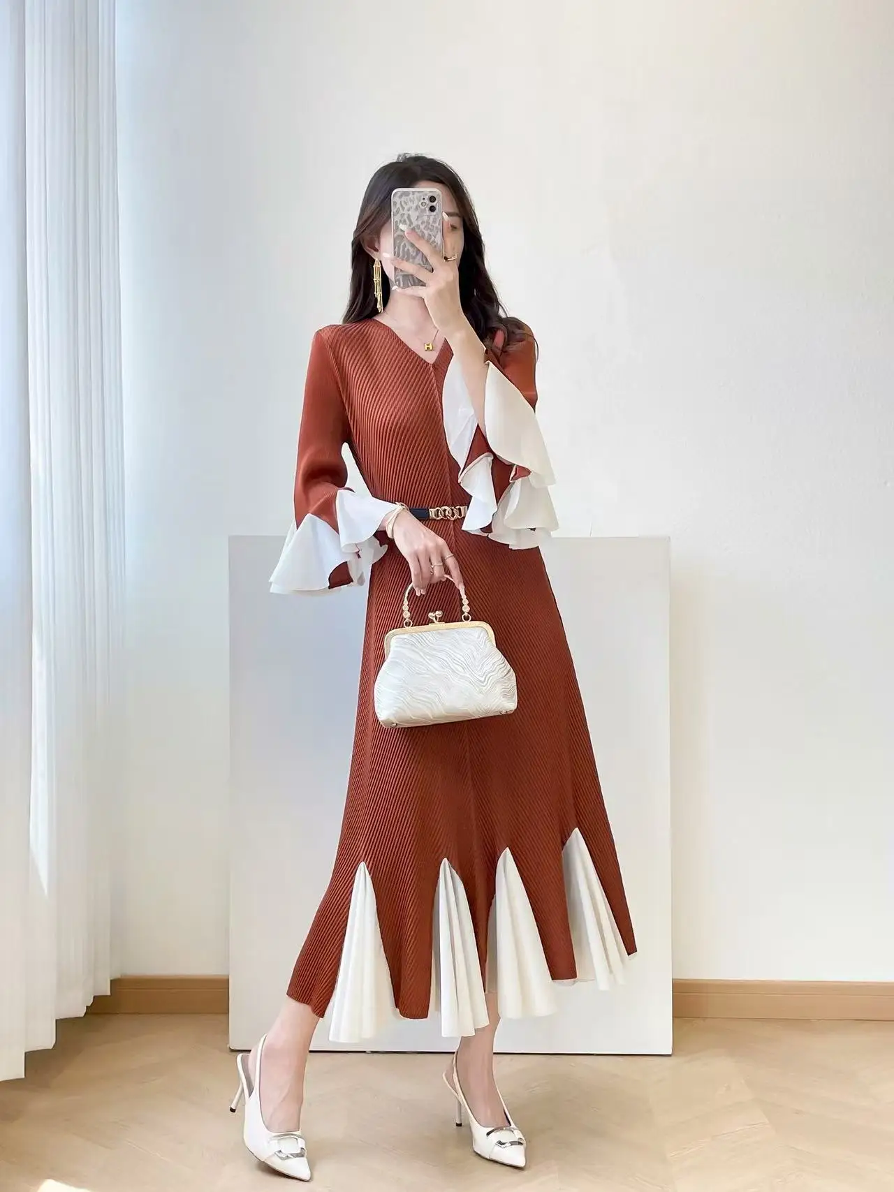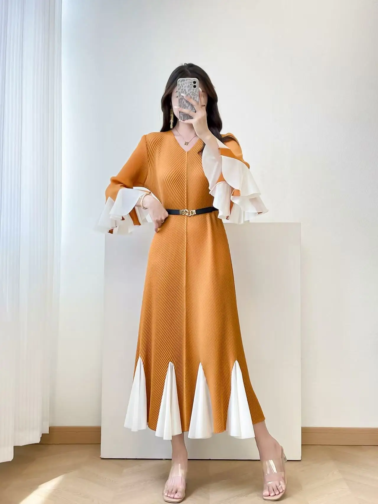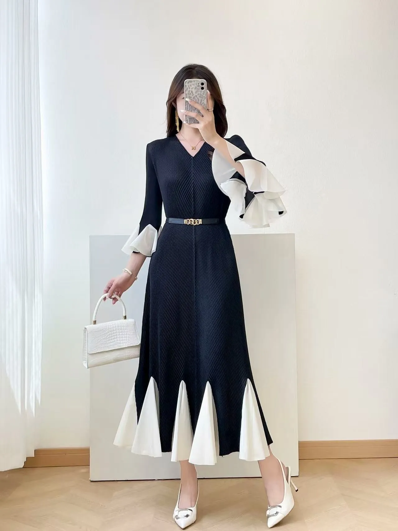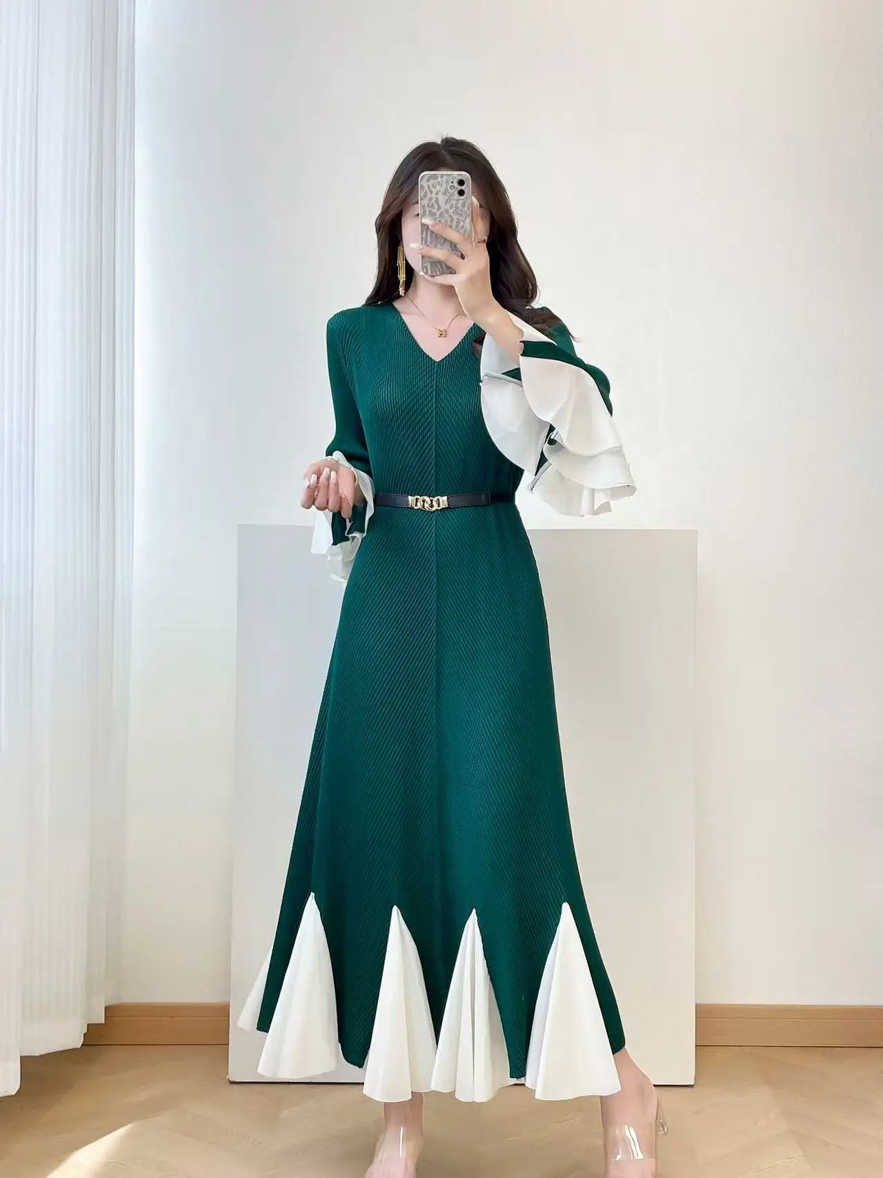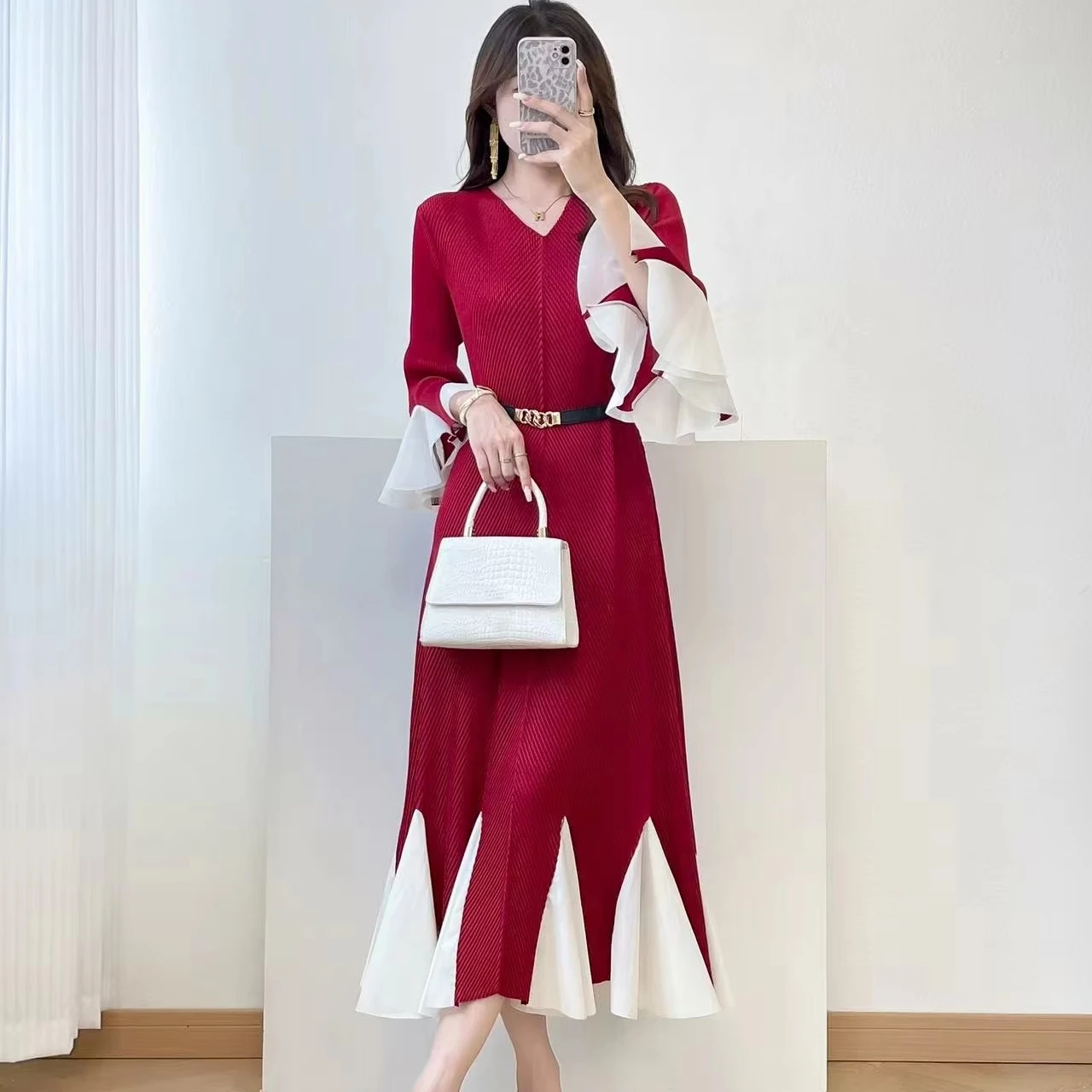 2025 New Women's Elegant Pleated Midi Dress, V-Neck Ruffle Sleeves, Color-Block Hem Belt