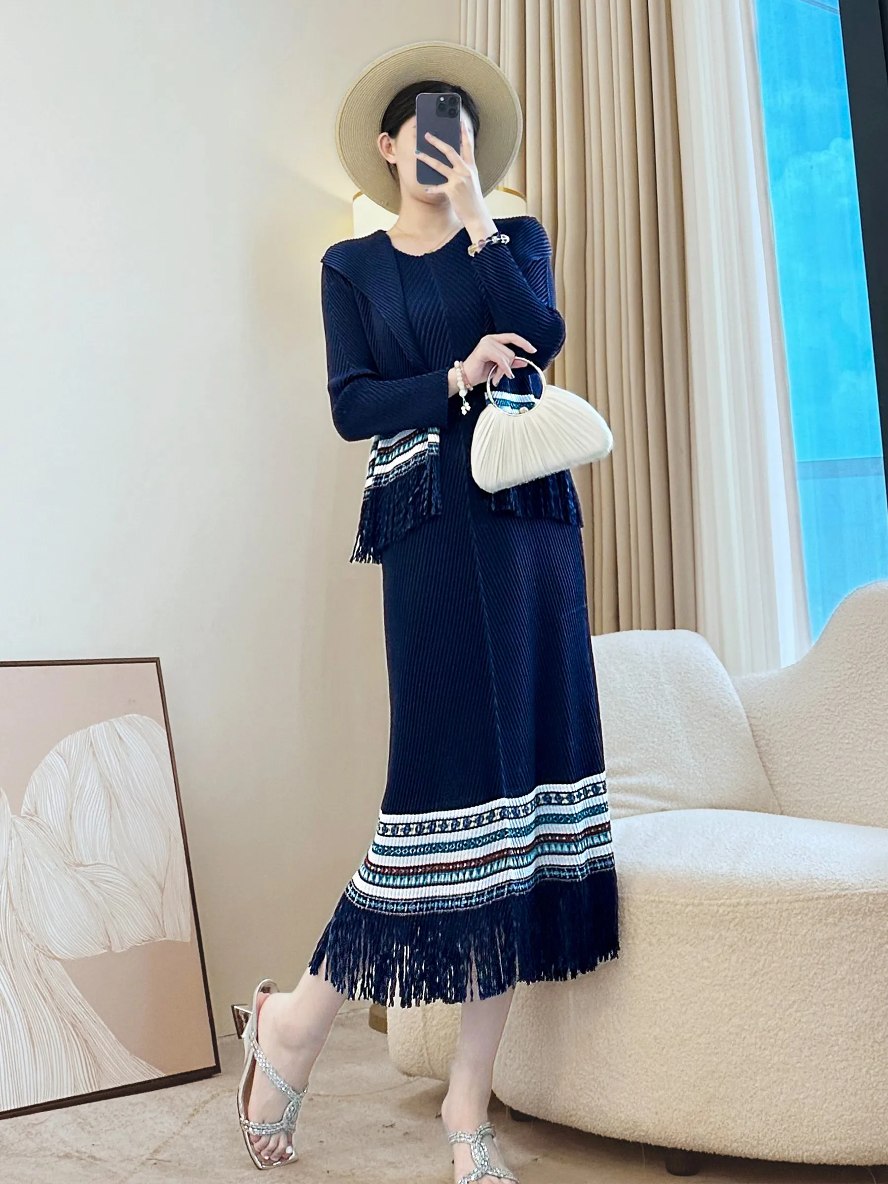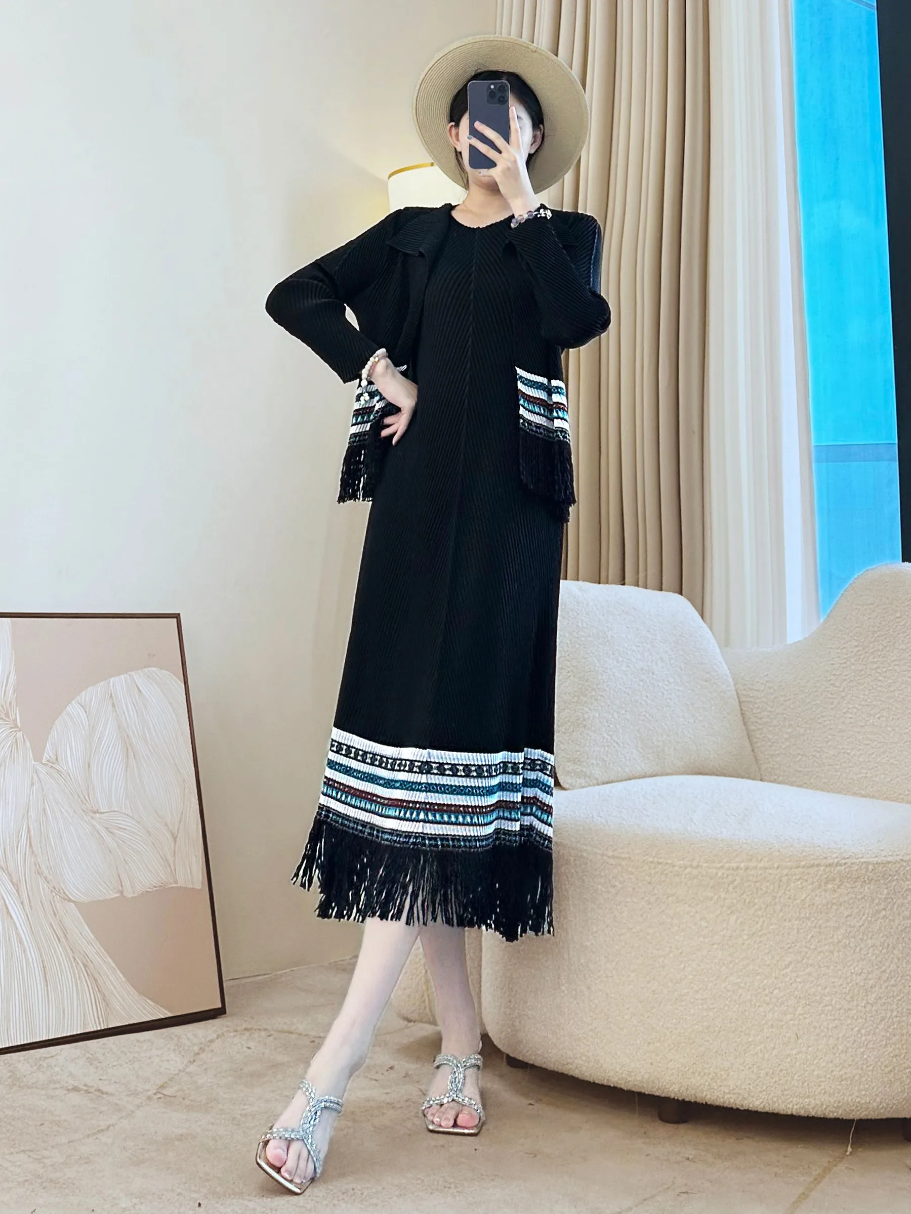Fashionable Printed Women's Pleated Suit for Autumn Outfit - Dress Paired with a Small Coat