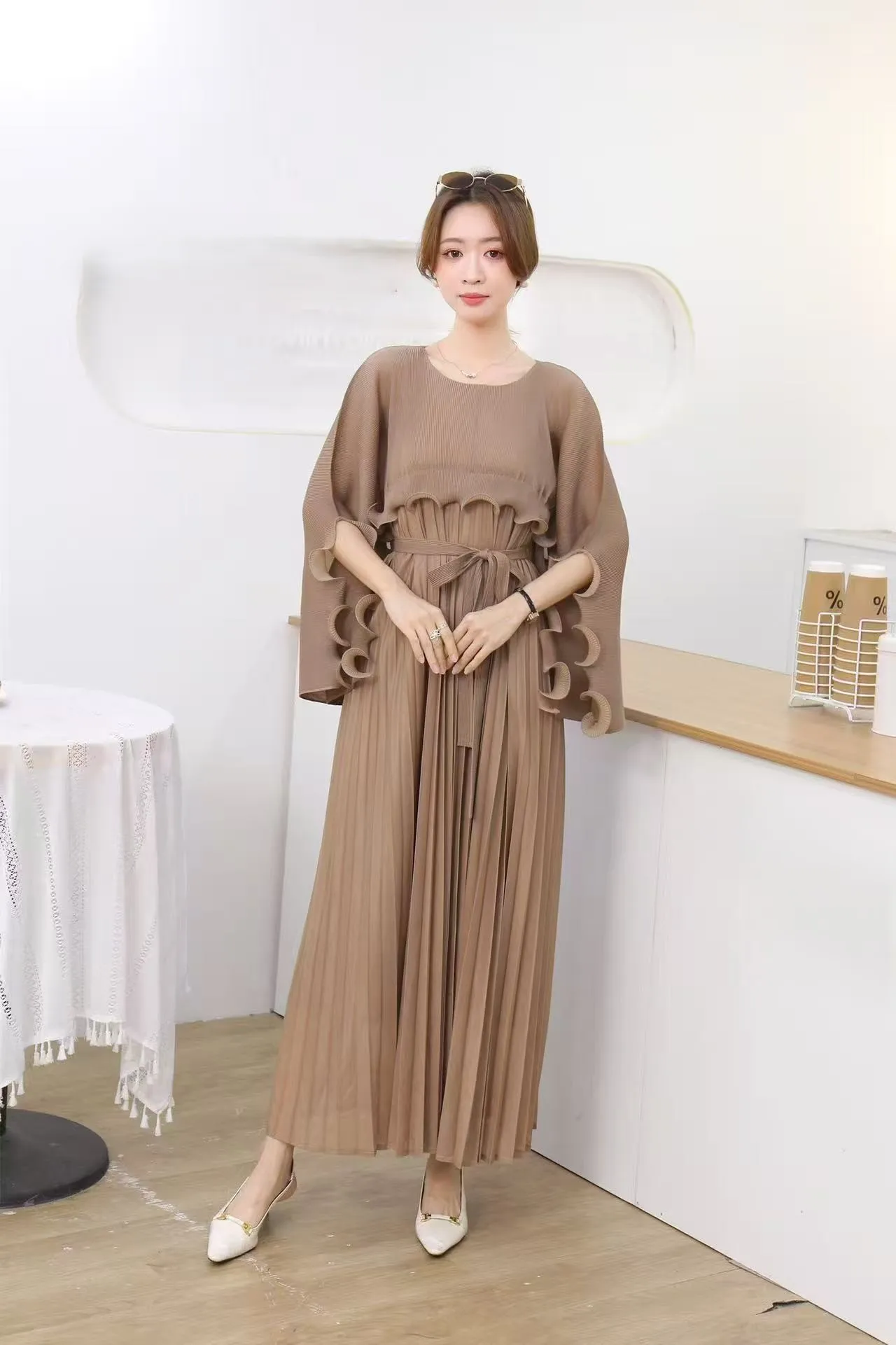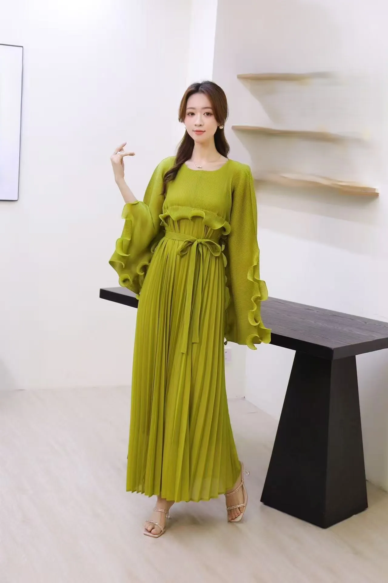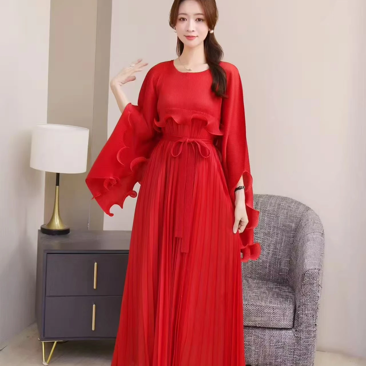 Elegant Solid-color Dress for Formal Events, Round-neck Oversized Pleated Dress in Stock