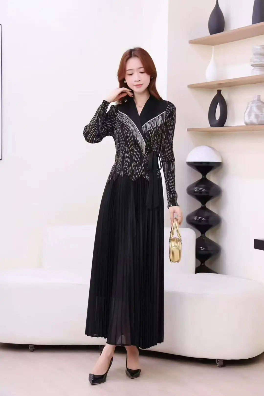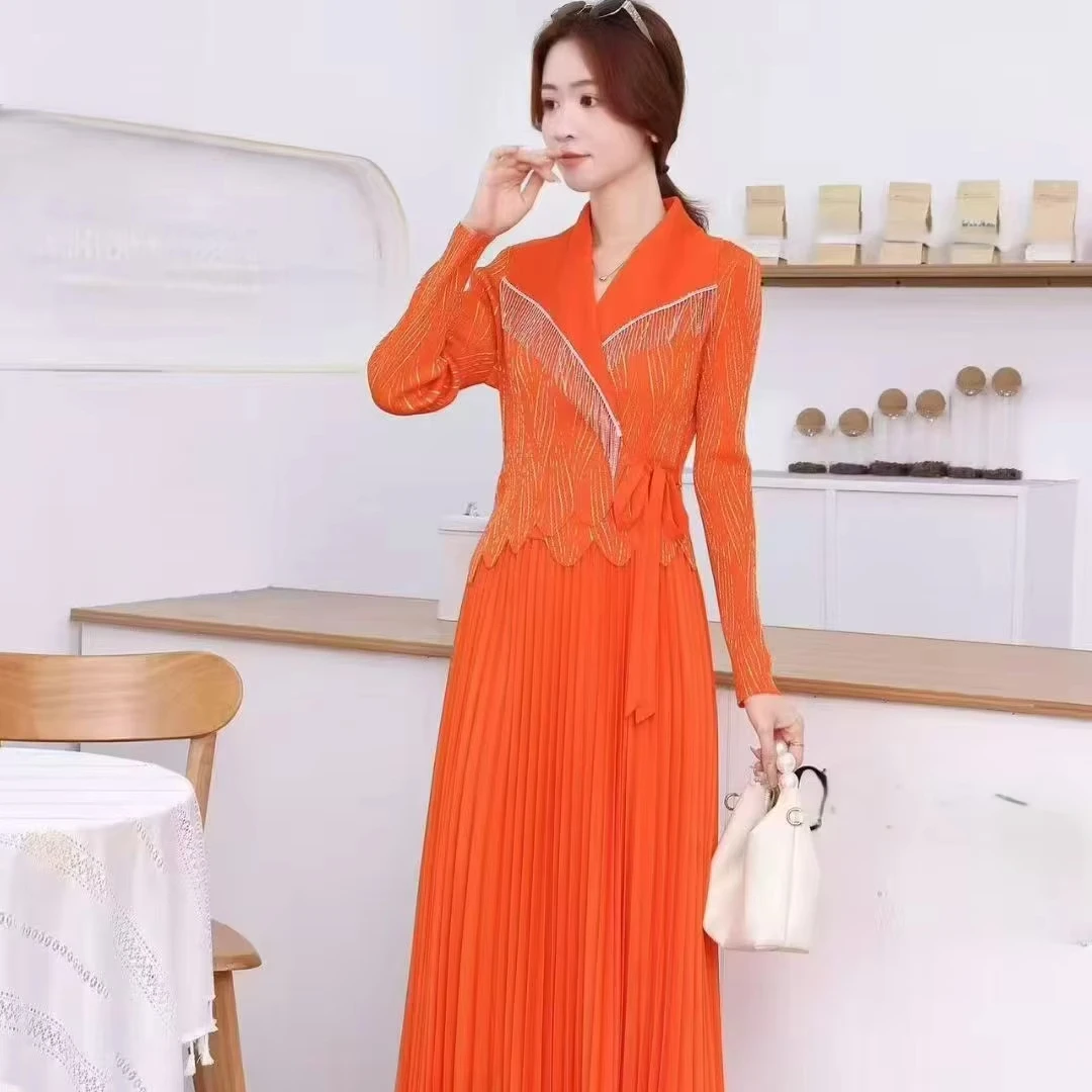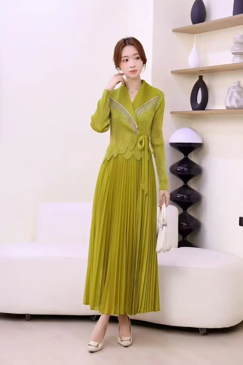 A Large Stretchable All-length Pleated Dress with a Slim Fit and a Belt a Large-sized Dress with Pleats and a Flattering Fit
