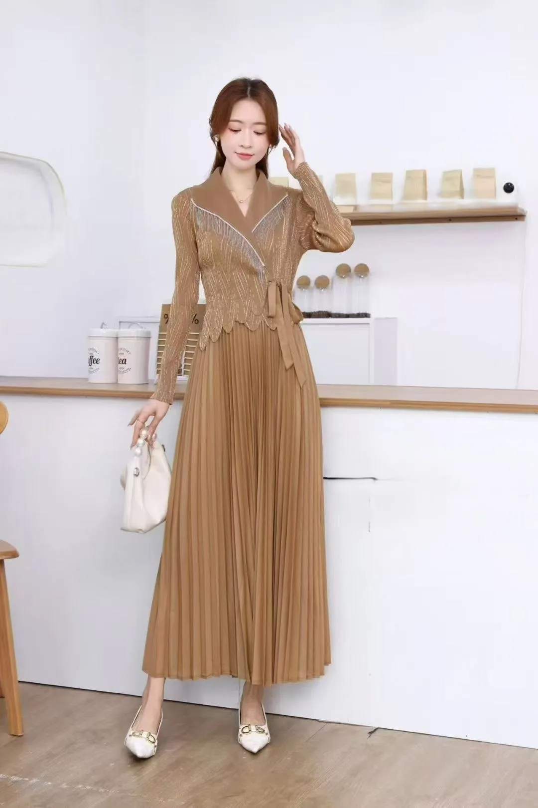 ZYHT 21541 Wholesale Crew Neck High Waist Casual Dresses Elegant Lace Velvet Mermaid Hem Ruched Long Sleeve Dresses for Women