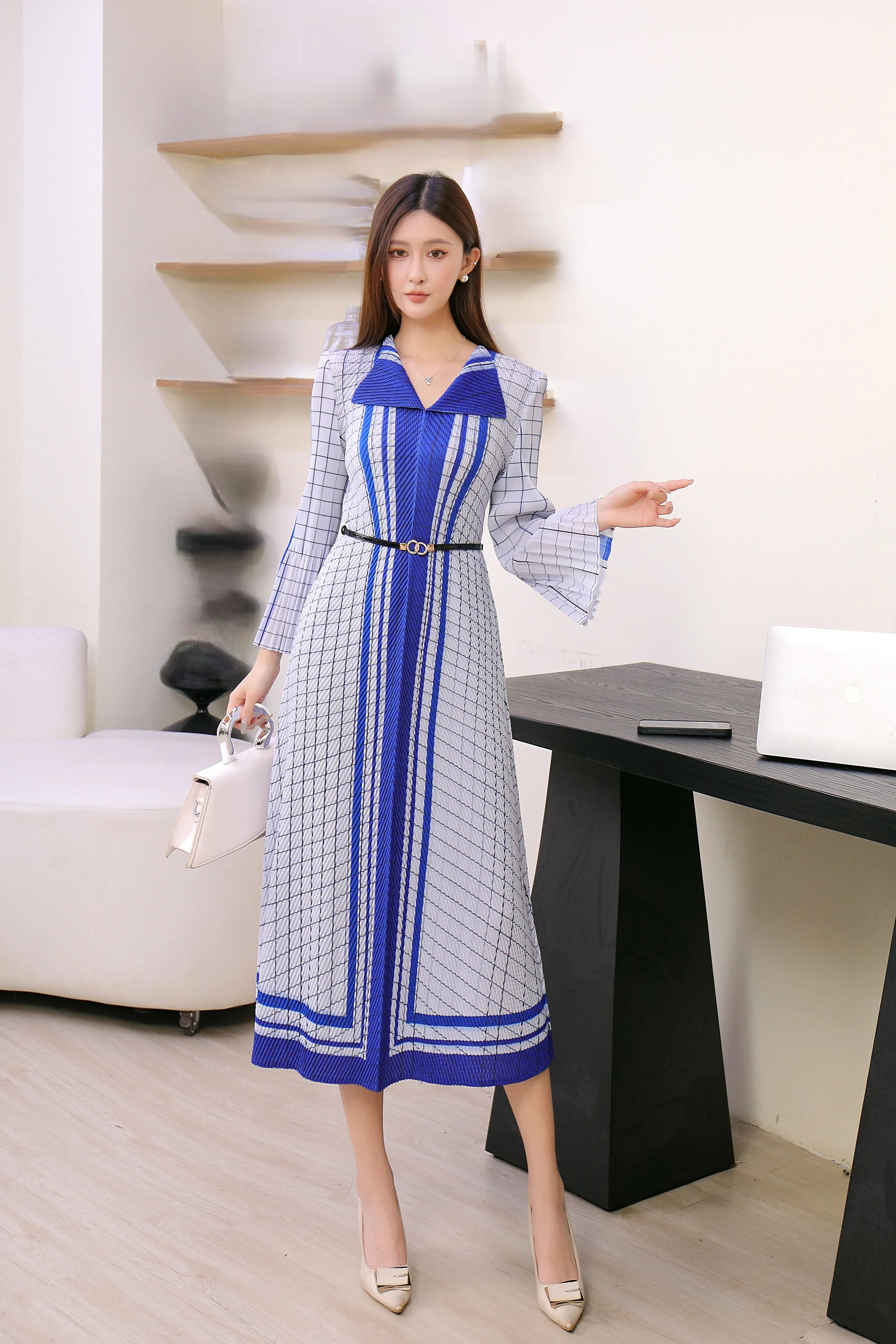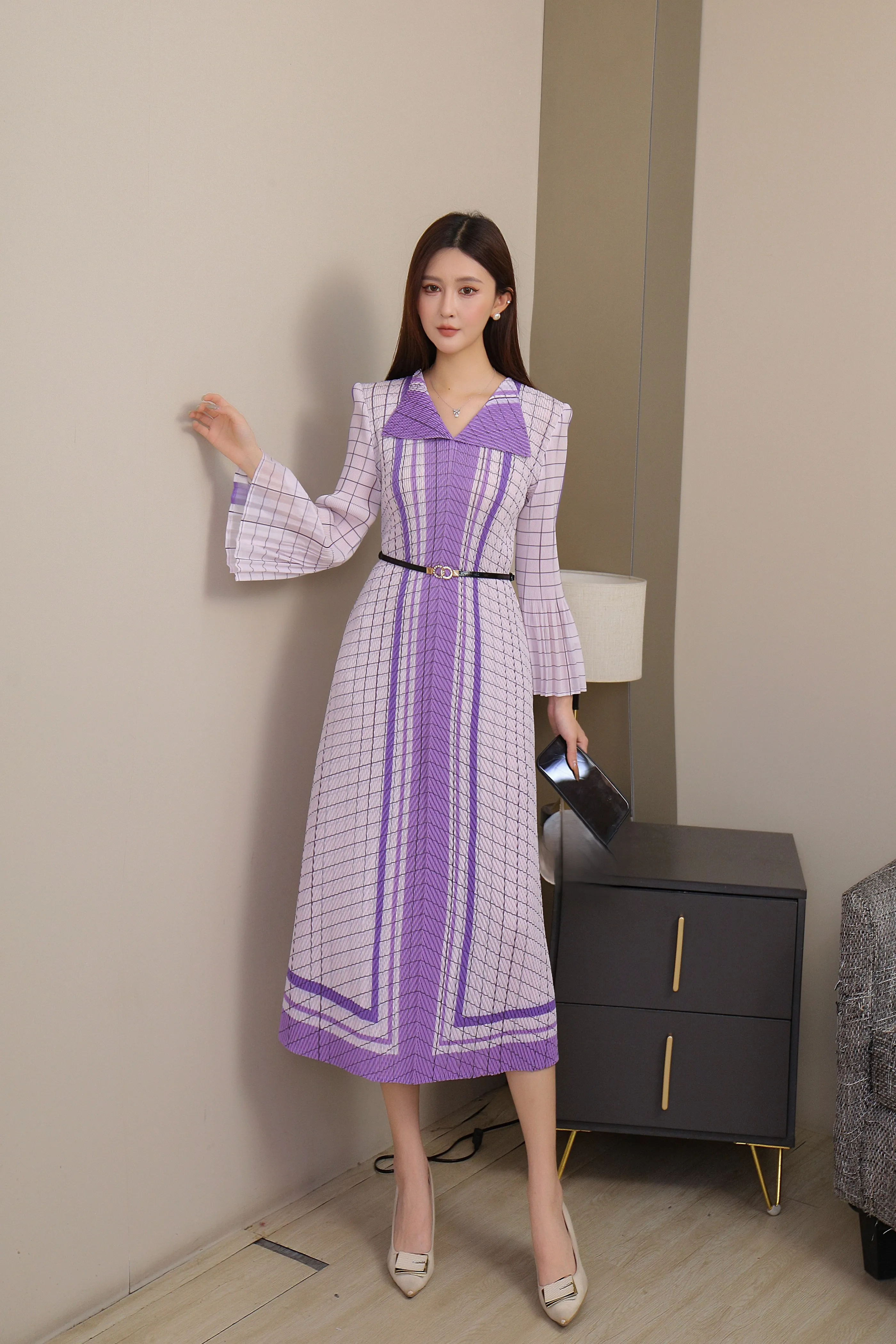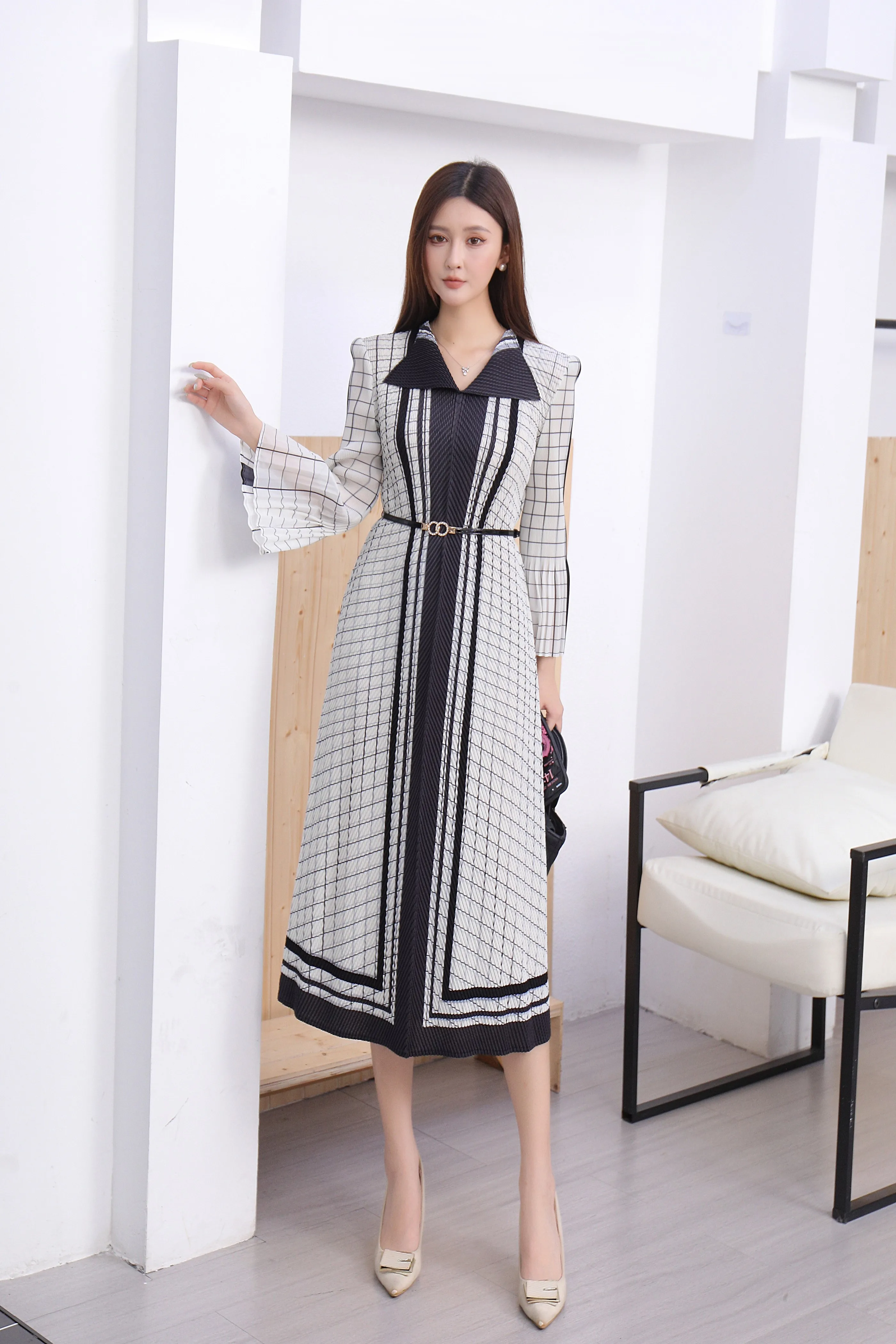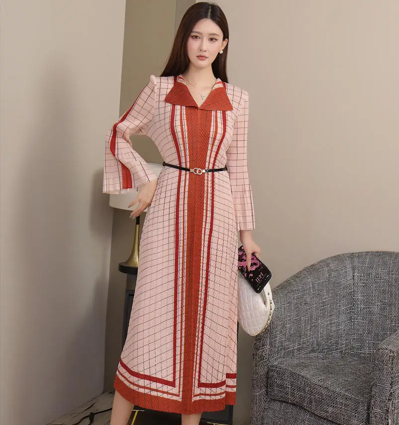 Miyake Pleated Dress Manufacturer - Wholesale of Formal Collar Wide-sleeved Dress with Belt in Large Size Available Now