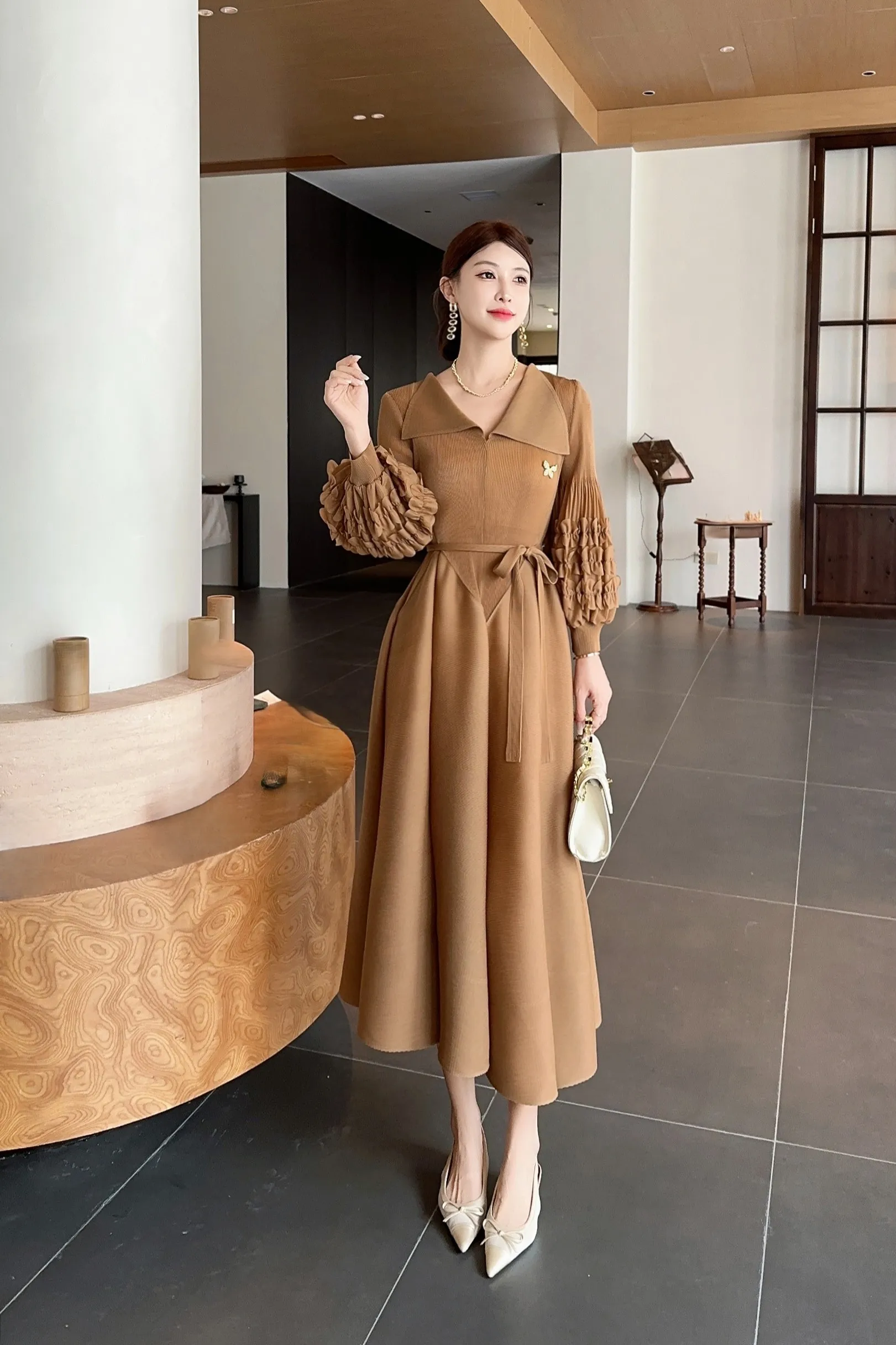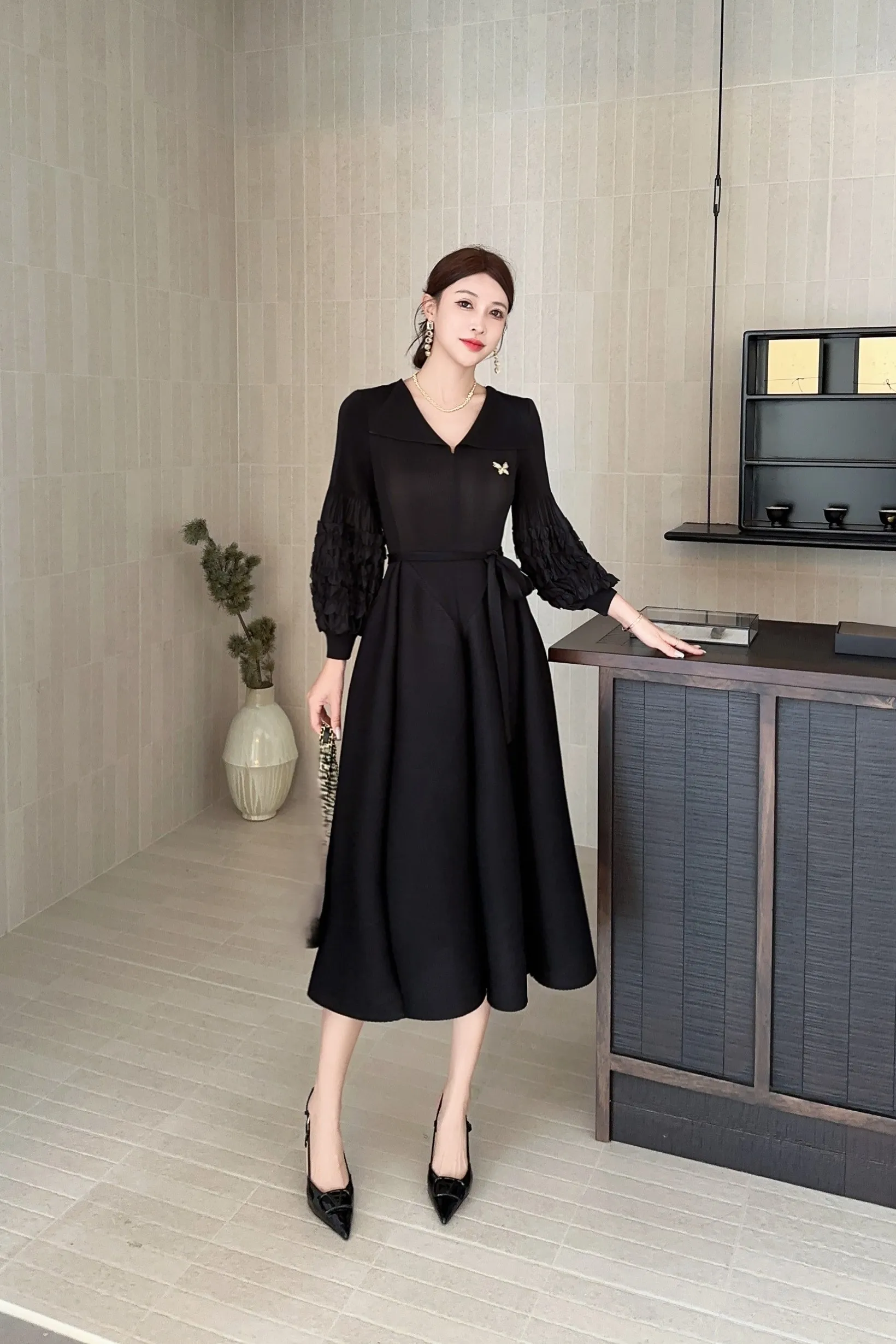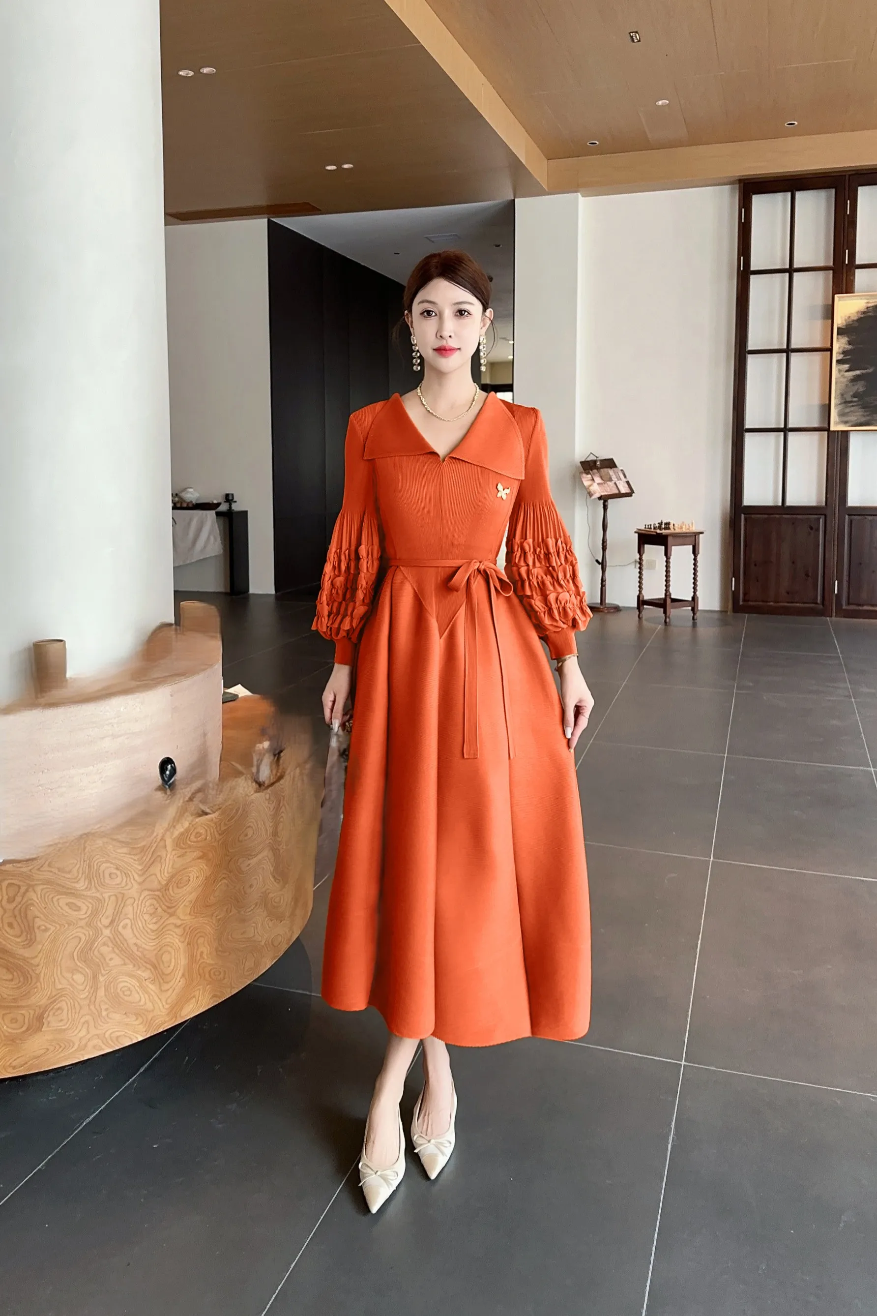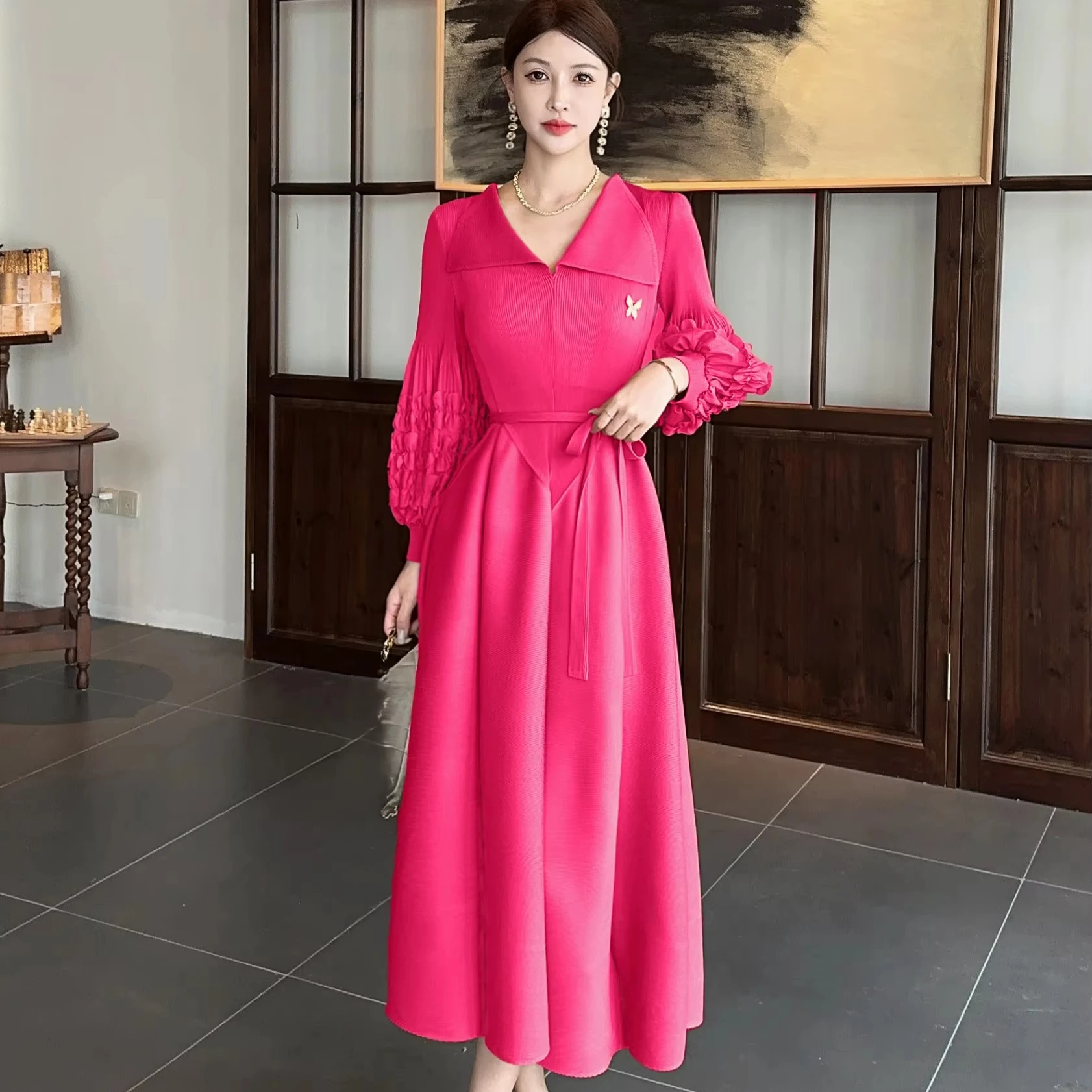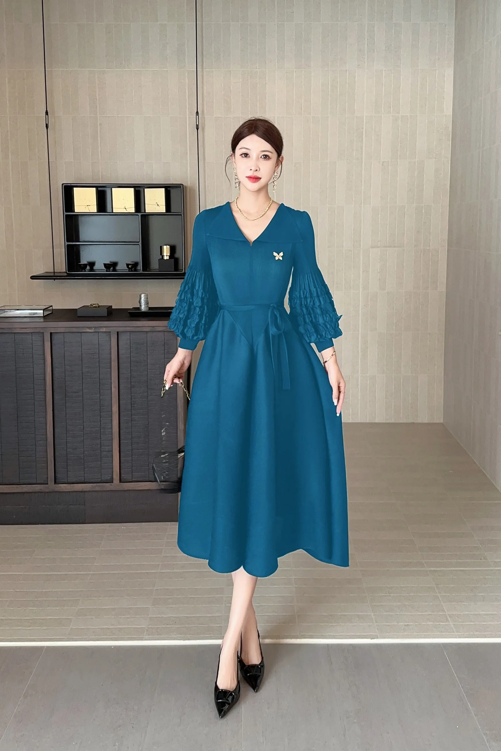 Korean-style Elegant Pleated Dress with V-neck and Lantern Sleeves - Wholesale of Large-sized Dresses