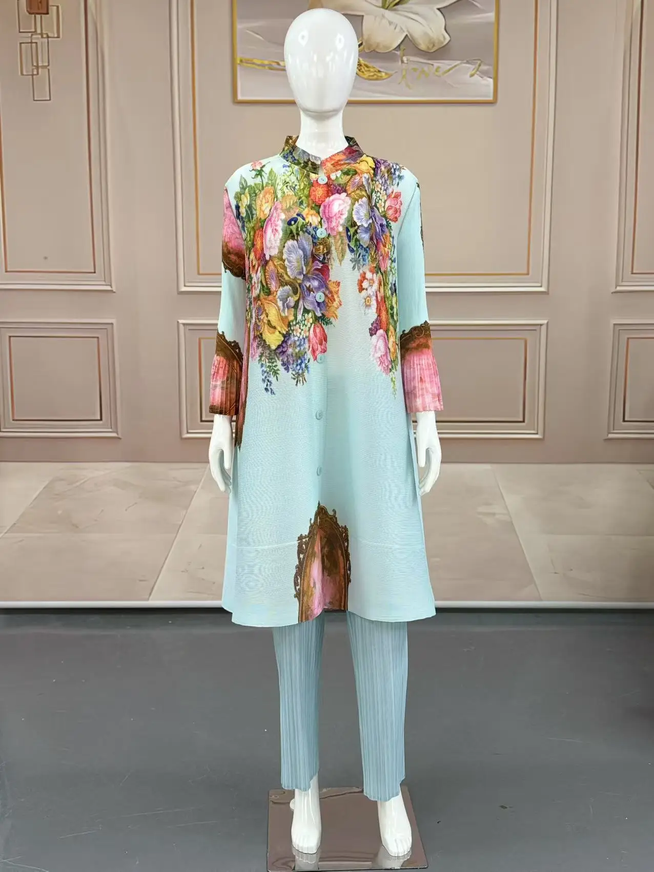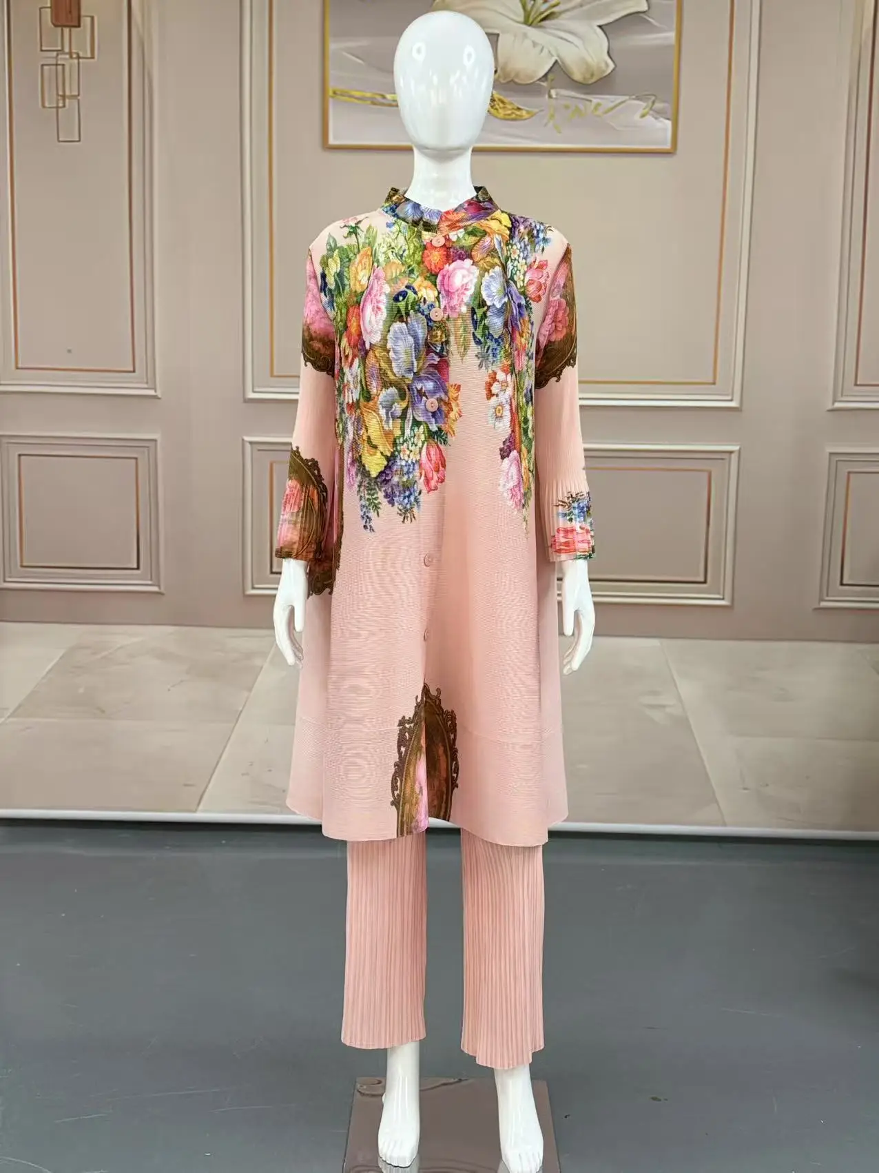 Miyake Pleated Suit - Stylish Printed Buttoned Long-sleeved Top Paired with Pants - Women's Casual Outfit