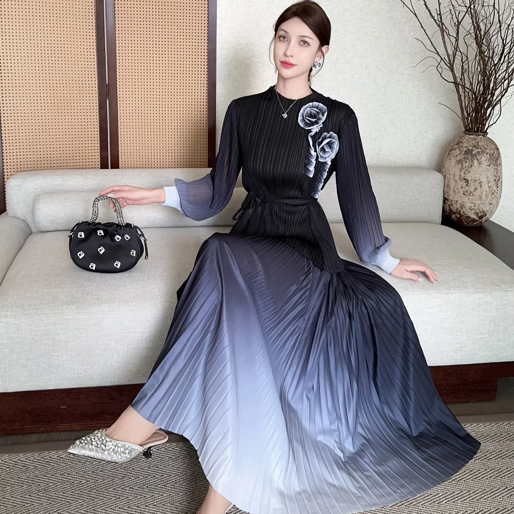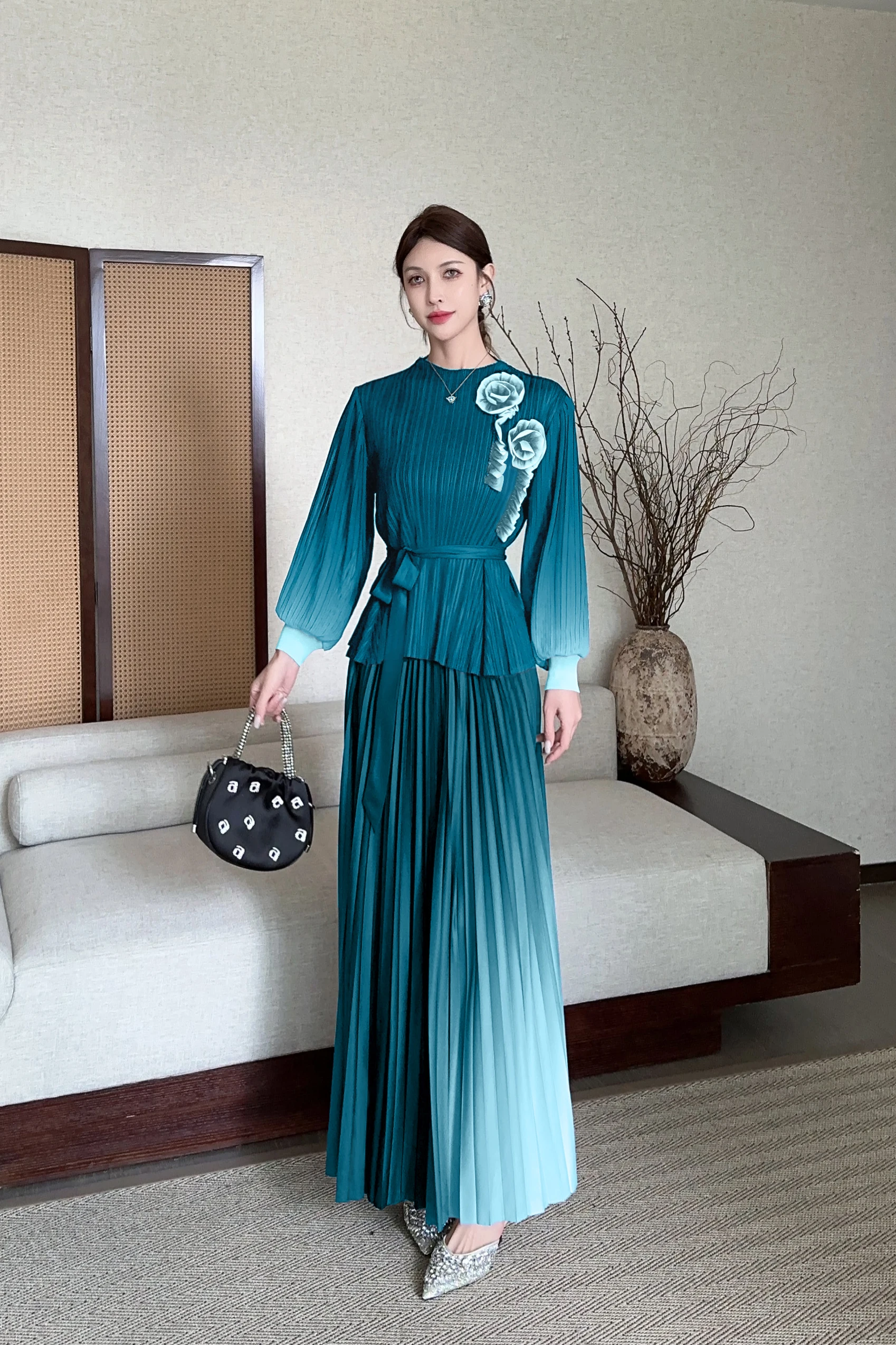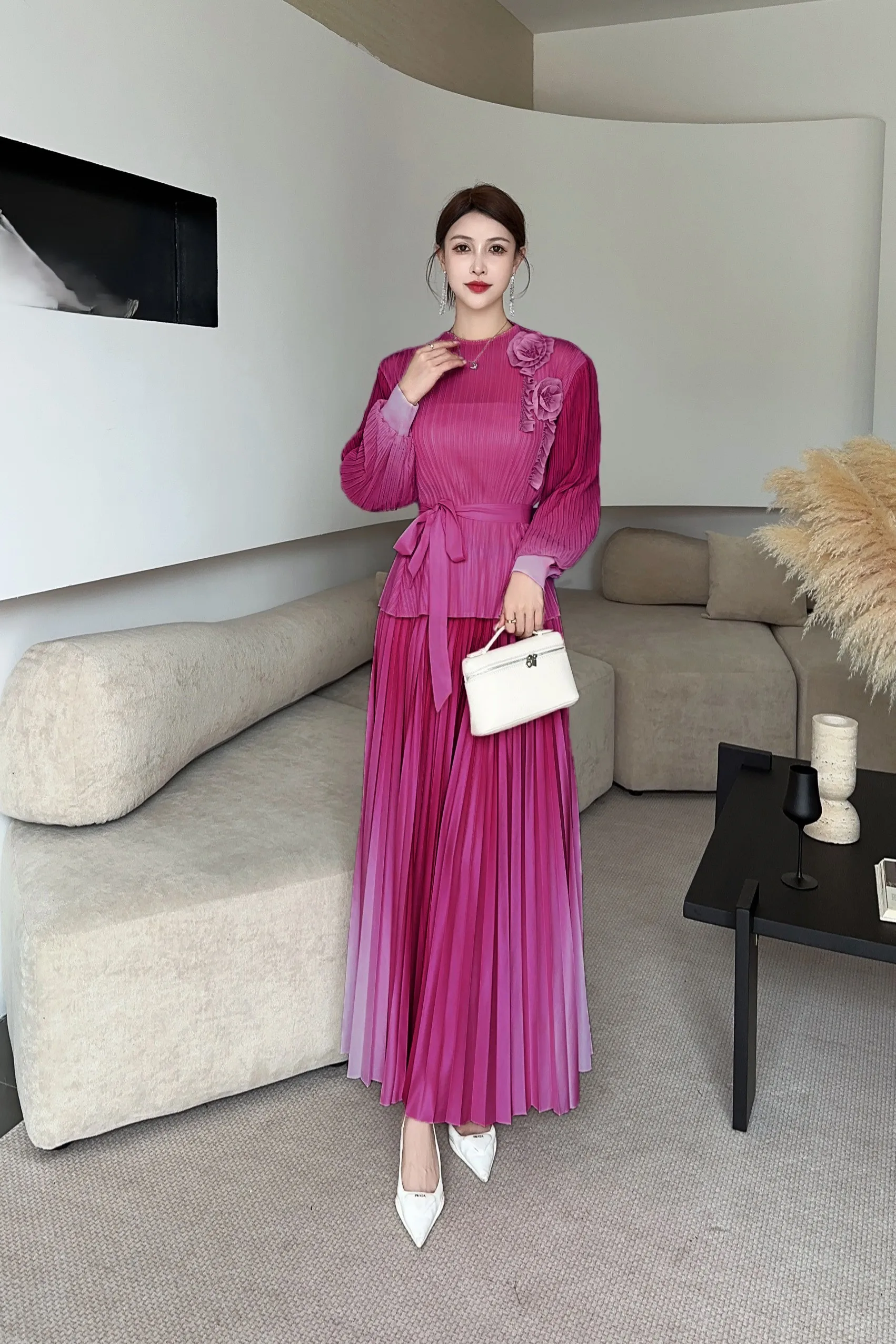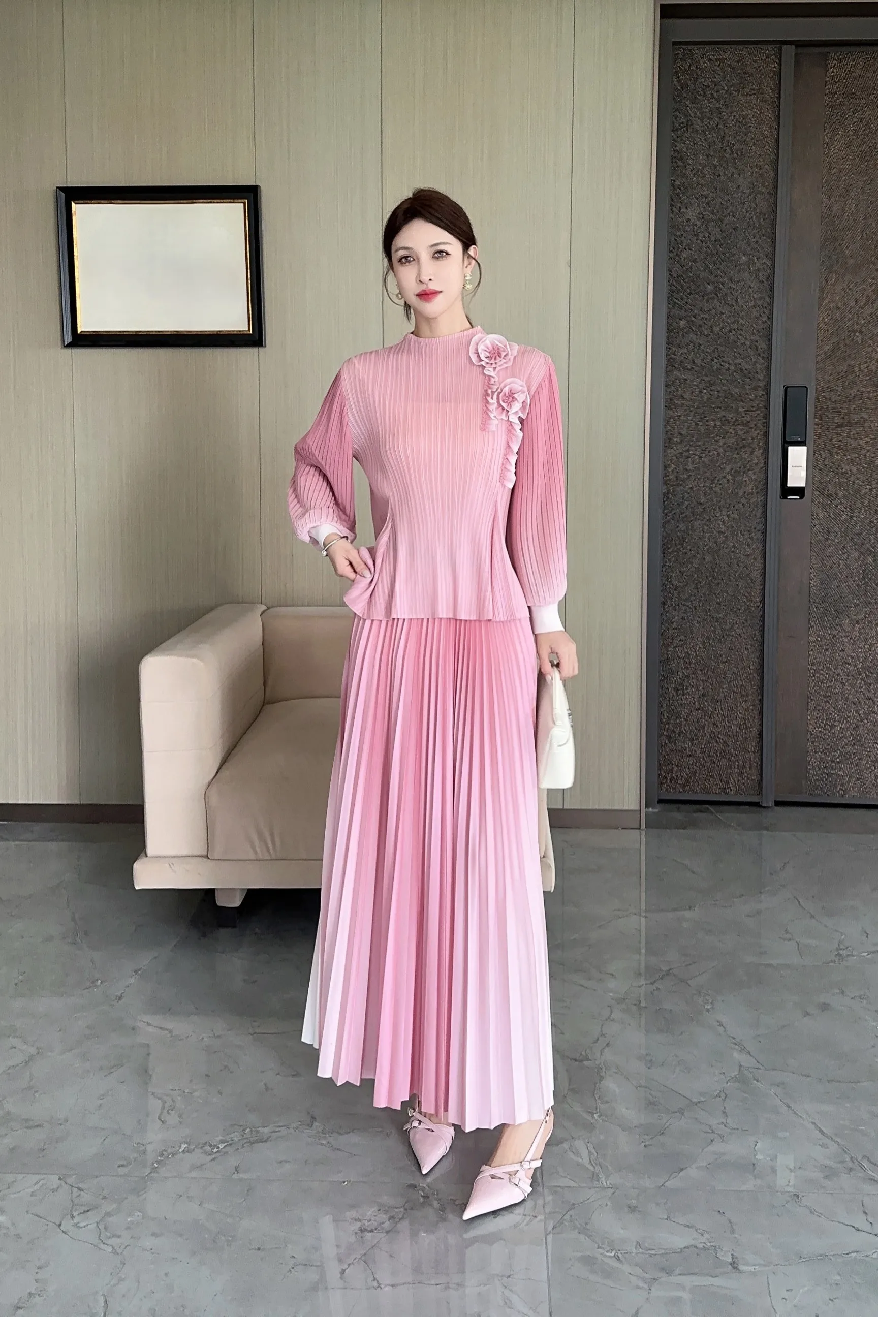 An Elegant Lady's Two-piece Gradient-colored Exquisite Flower-decorated Miyake Pleated Suit