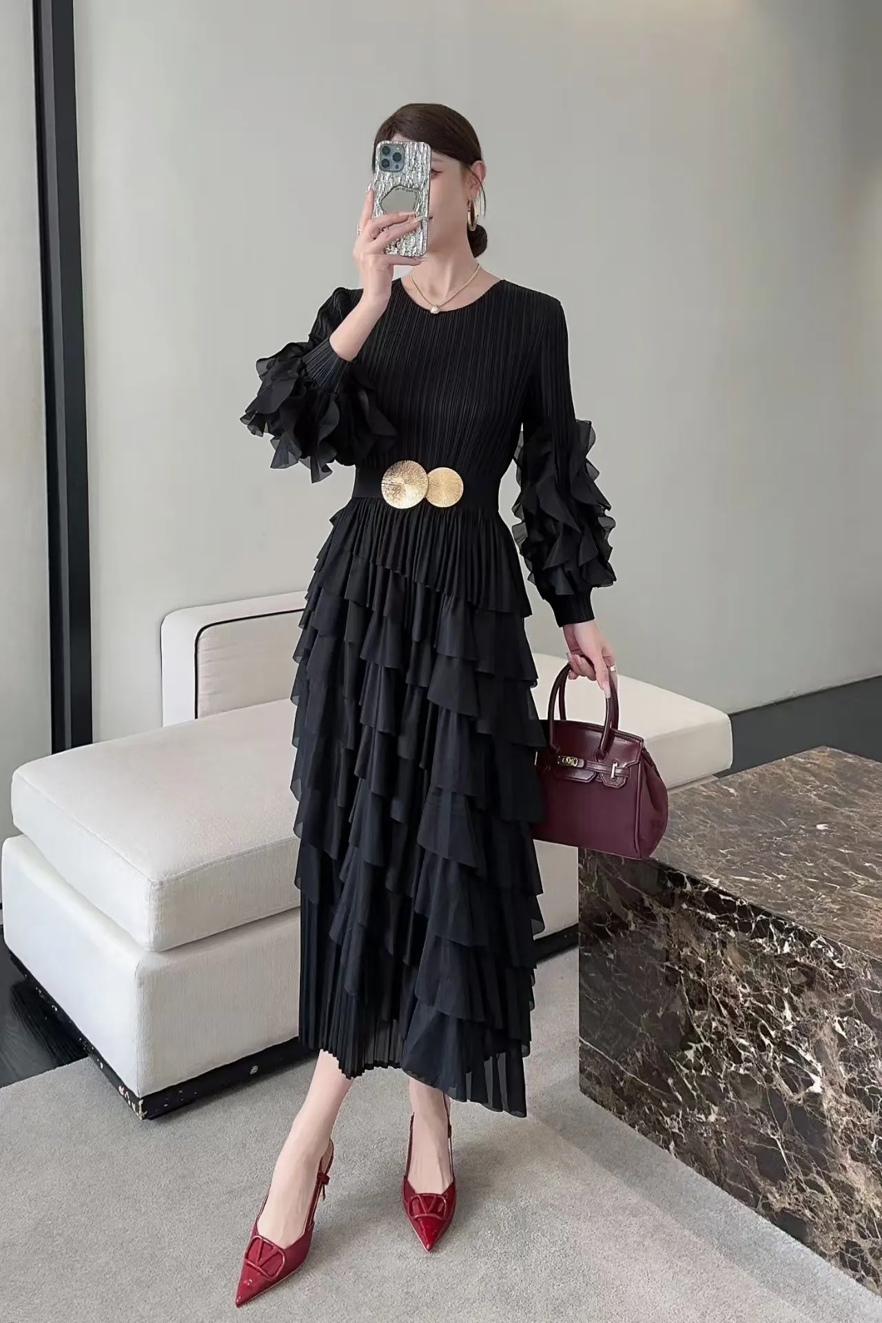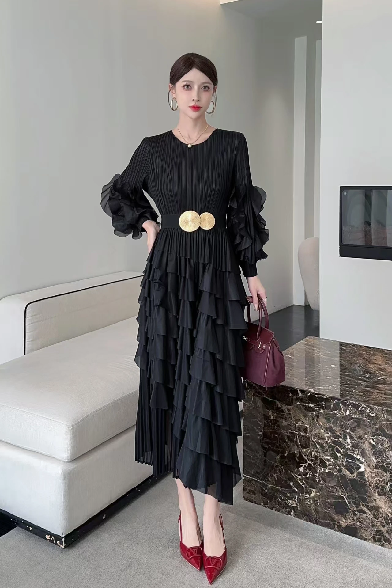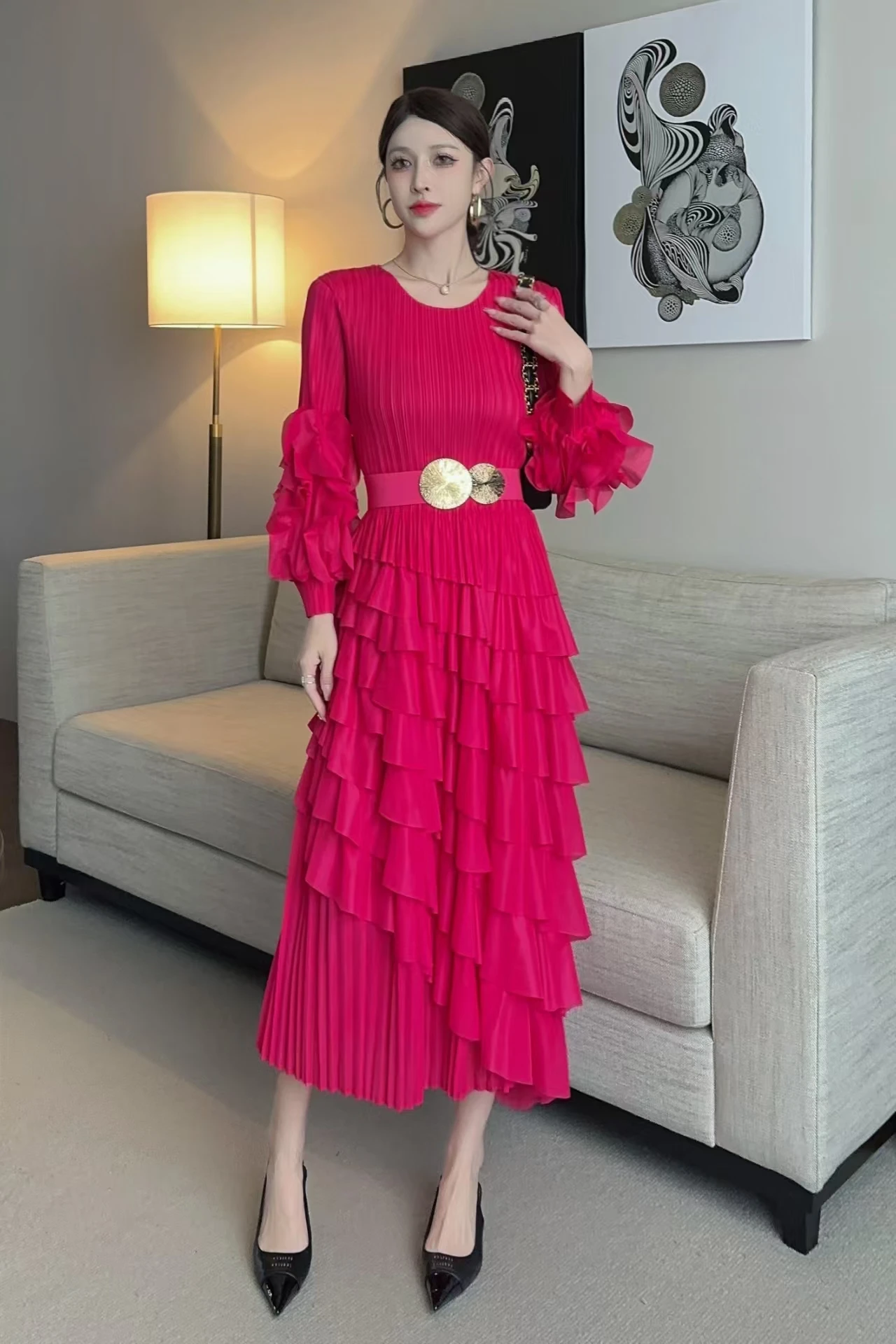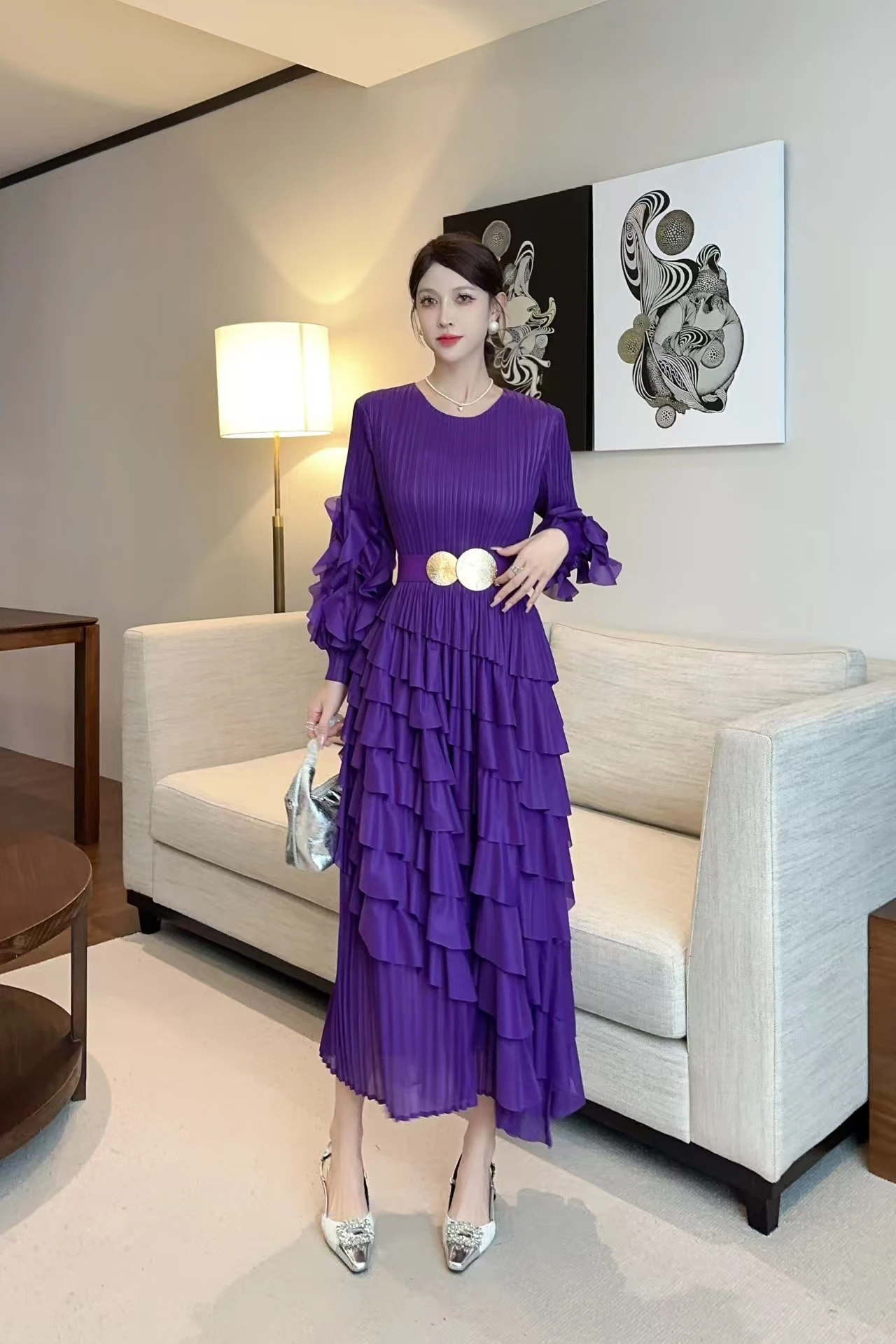 African Oversized Dress in Solid Color with Petal Sleeves and Cake-shaped Hem - Miyake Pleated Dress