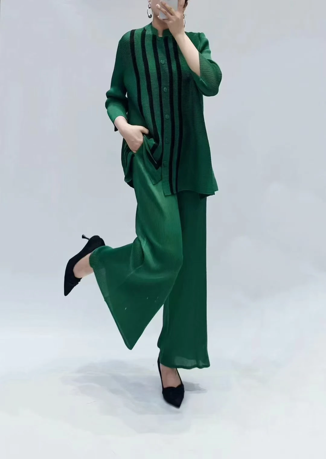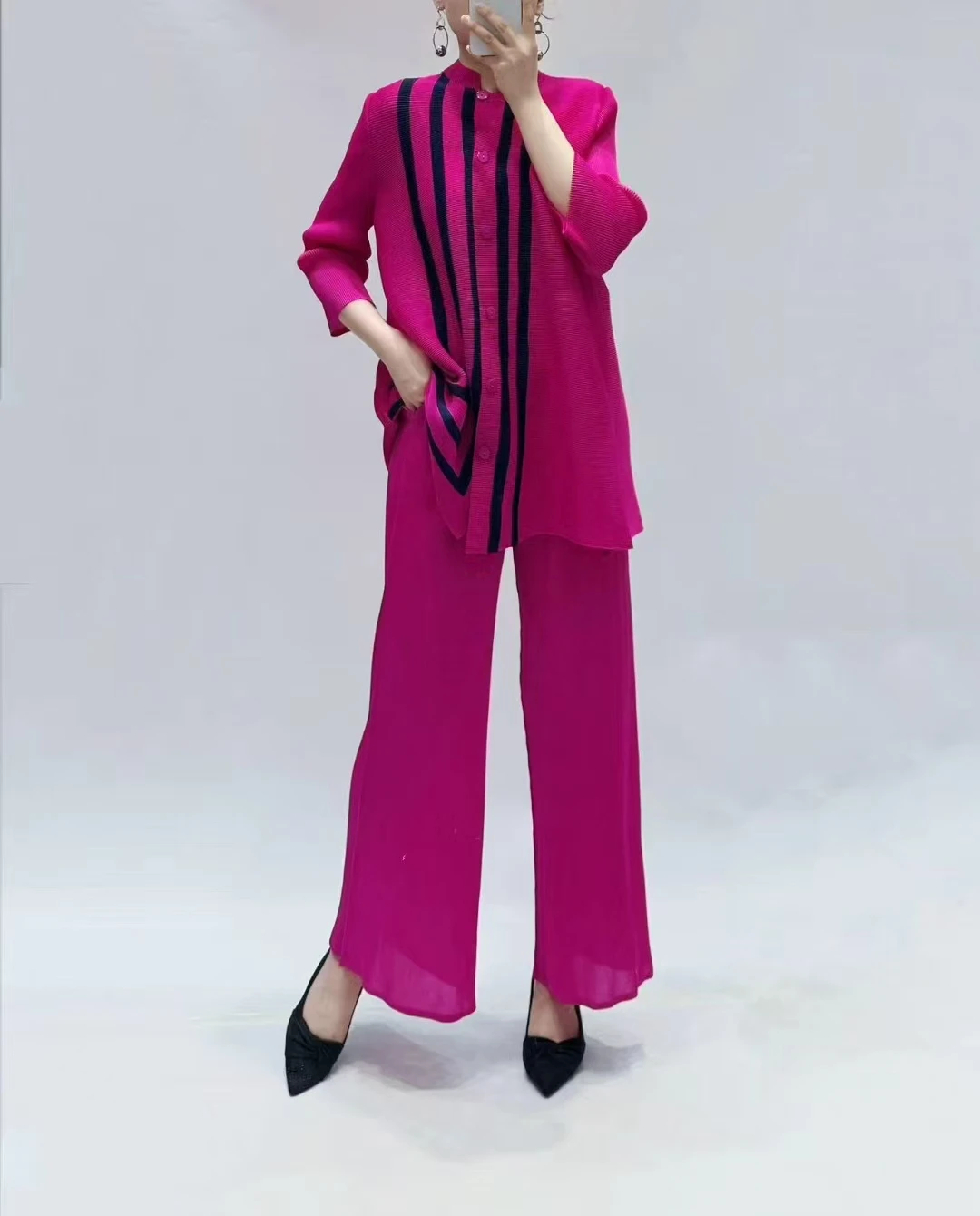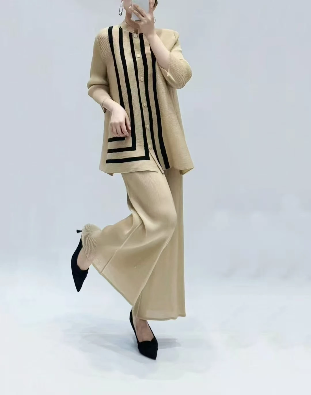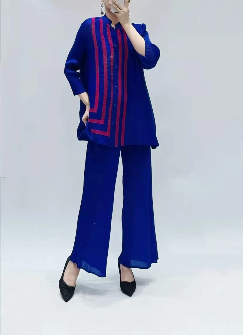 Women's Large-Sized Striped Design Buttoned Relaxed Casual Miyake Pleated Suit Loose Summer Chiffon Embroidered Lace Long Tassel