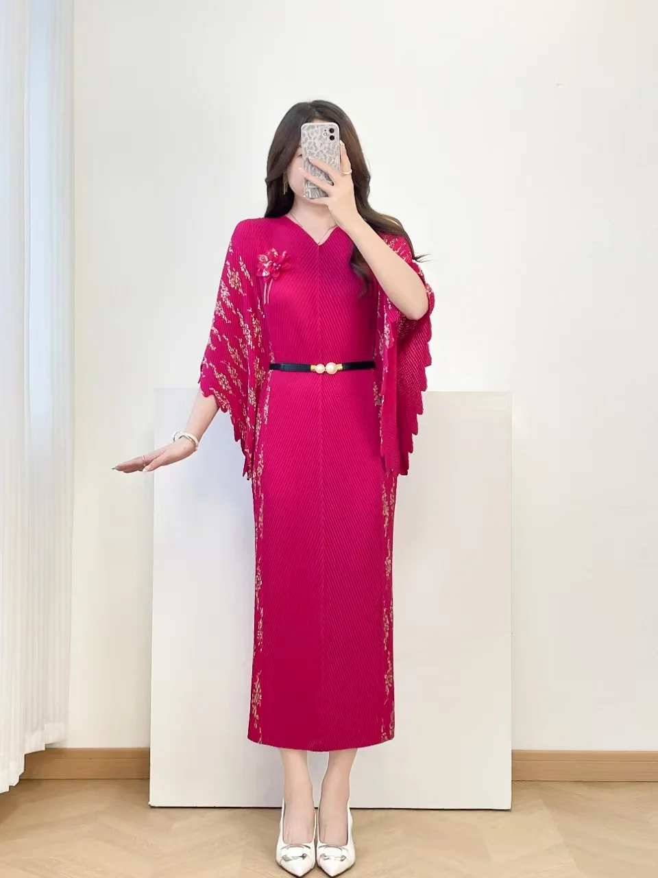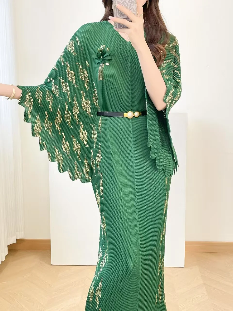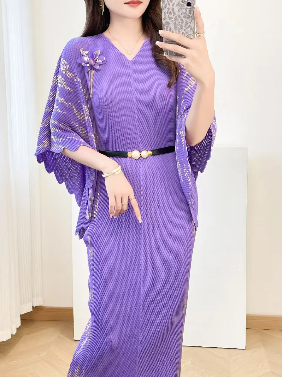 Summer Oversized Loose-fitting batwing Sleeve Gold-embroidered Miyake Pleated Dress