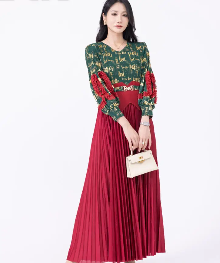 ZYHT 21541 Wholesale Crew Neck High Waist Casual Dresses Elegant Lace Velvet Mermaid Hem Ruched Long Sleeve Dresses for Women