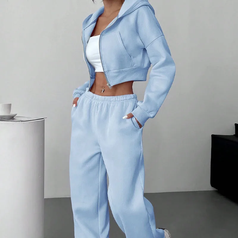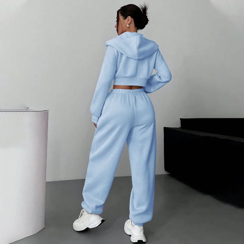Custom Logo Women's Lady Clothing High Waisted Crop Top Sexy Zip up Latest Design Baggy Two 2 Piece Hoodie and Sweatpants Set
