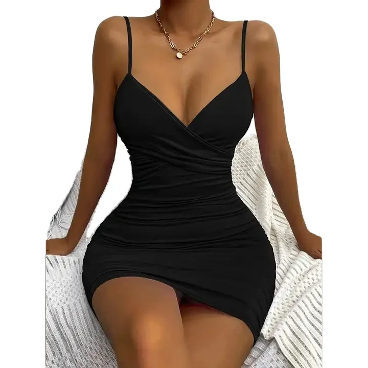 OEM Summer Custom Lady Bodycon Sexy Fashion Women Sling Low Chest V-neck Pleated Package Hip Skirt Nightclub Party Mini Dress