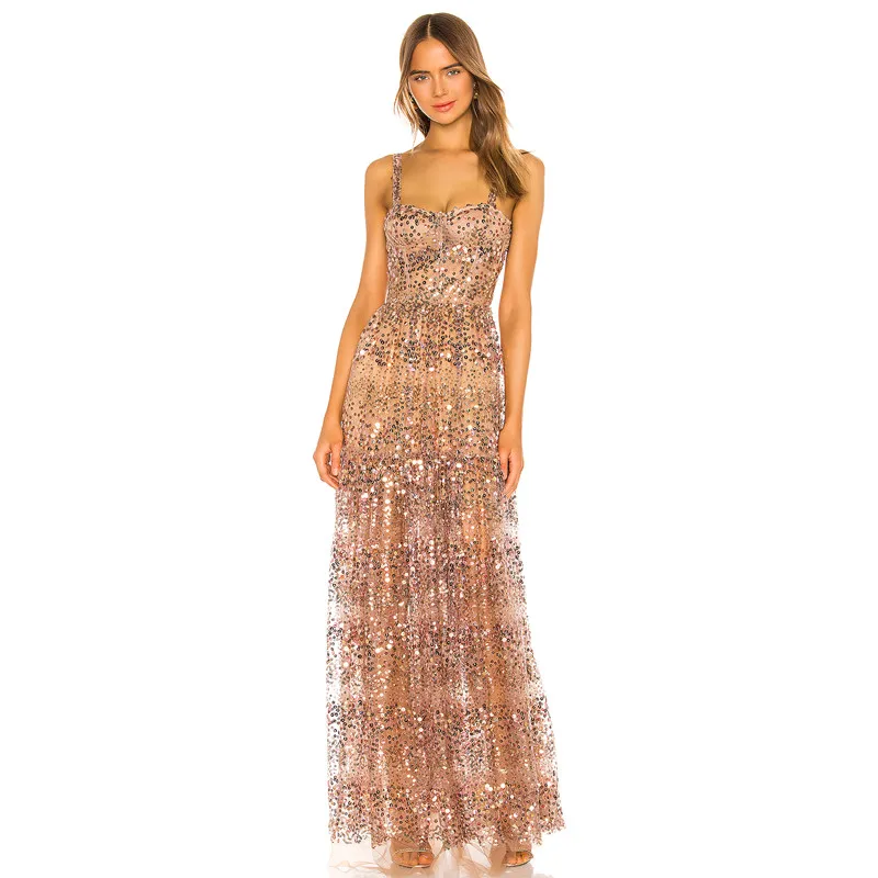 2026 Custom Clothing Manufacture OEM Custom Lady Elegant Gold Sequin Sexy Party Evening Maxi Dress Midnight Gown Dress for Women