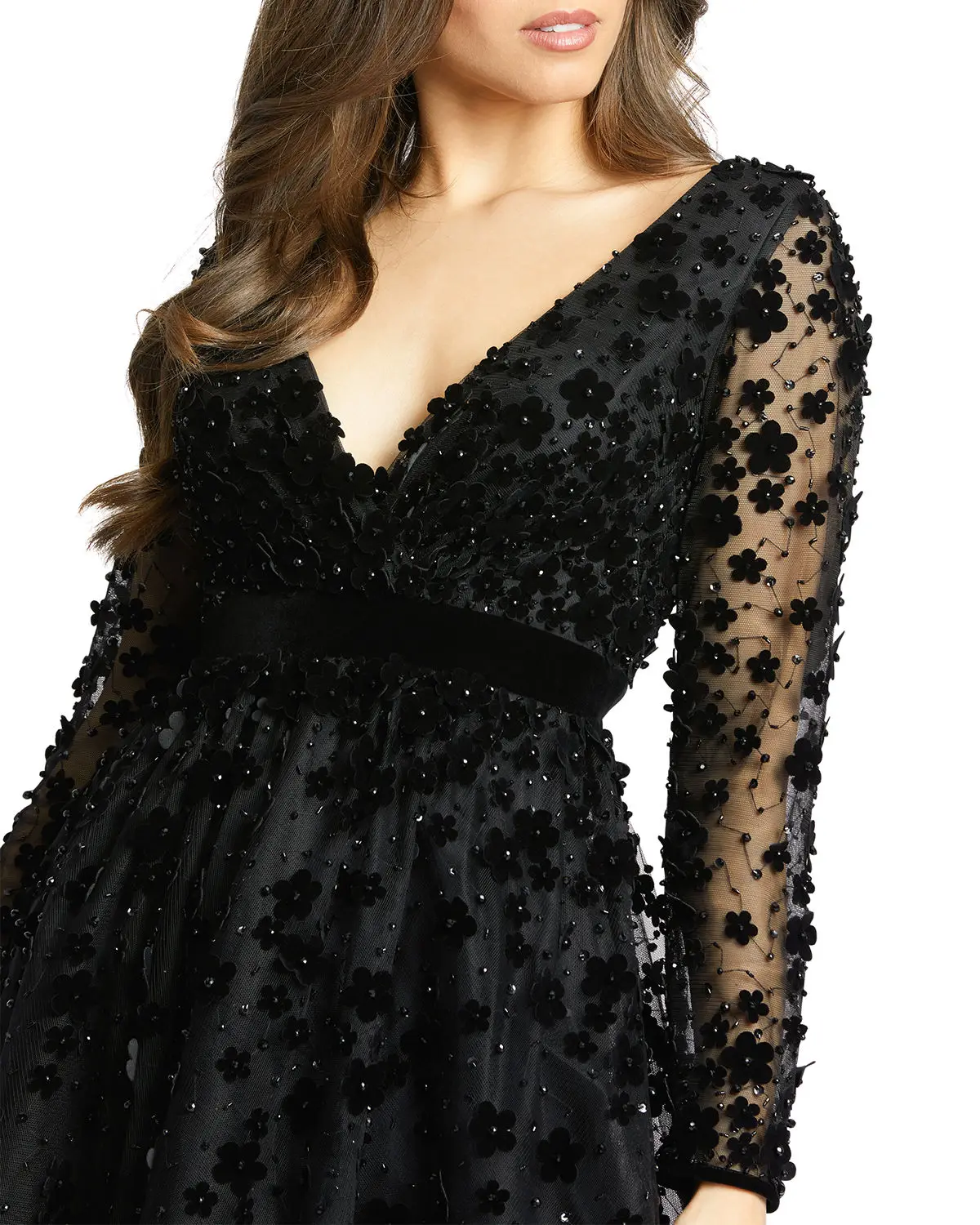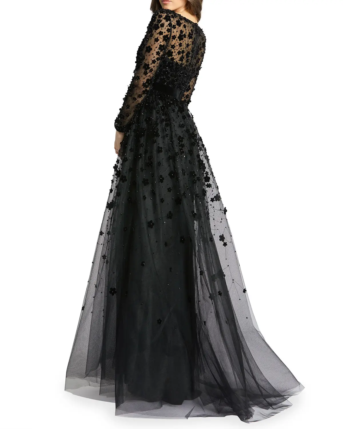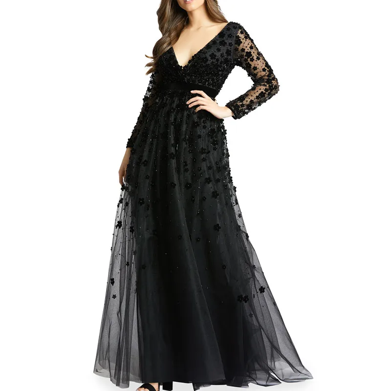 New Custom Women Black Lady Elegant Long Sleeves Evening Dress Velvet Floral Applique a Line Gown