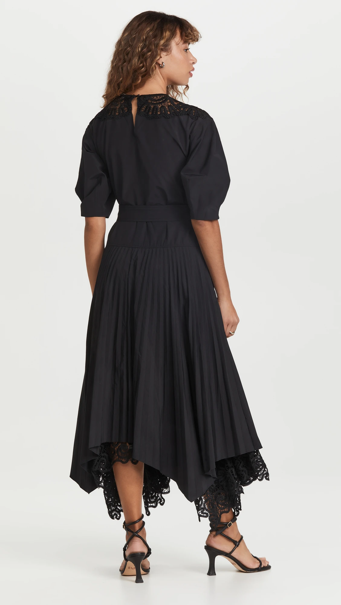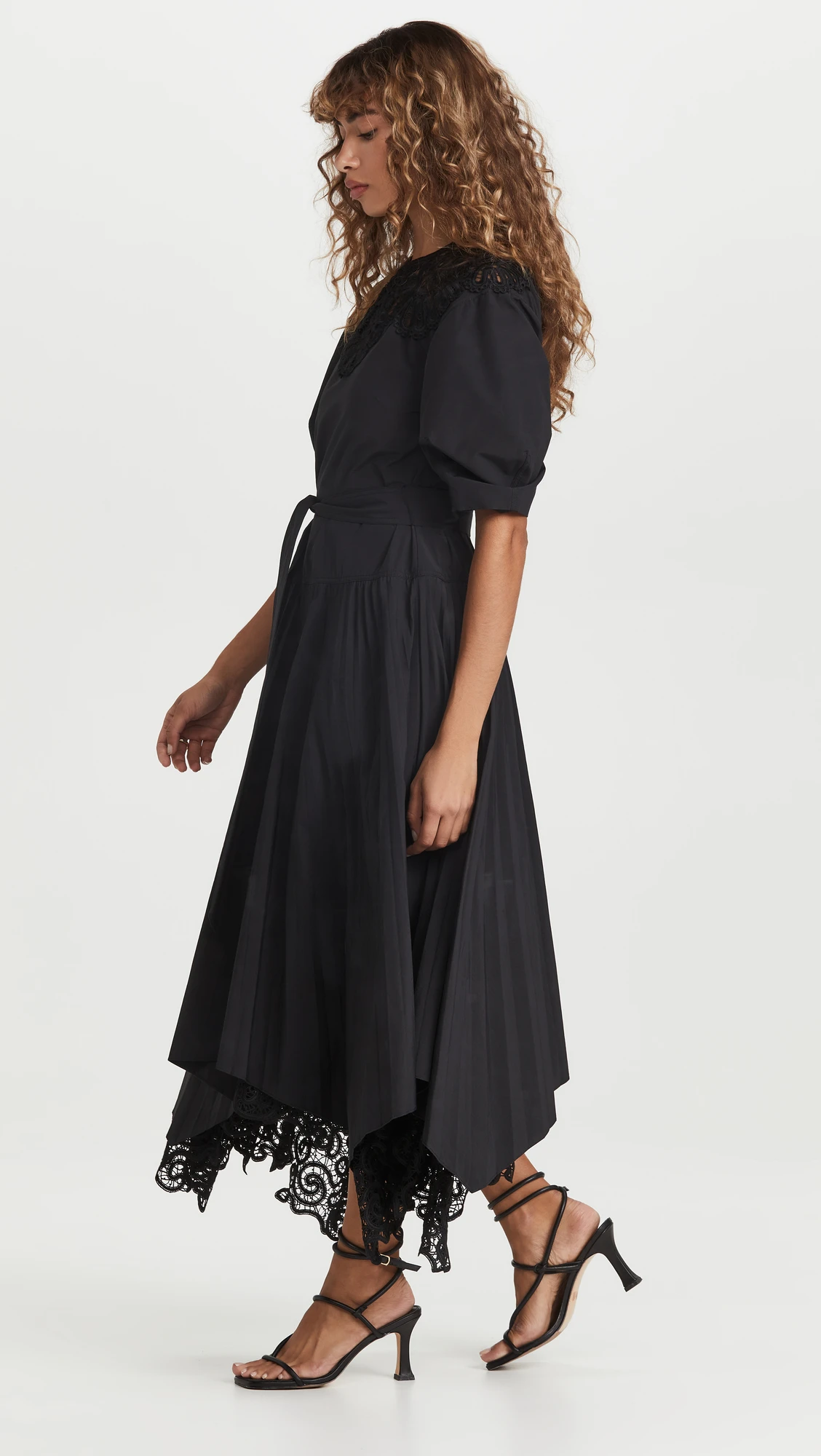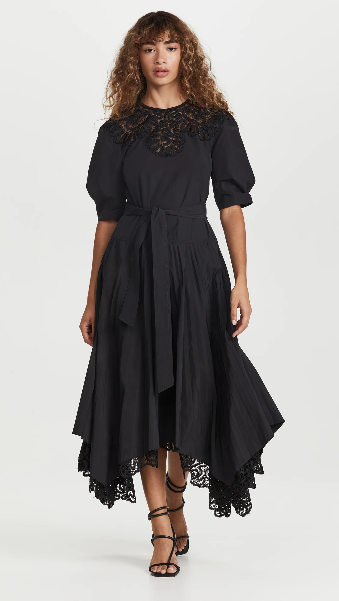 Dresses Women Casual Dress Short Sleeve Black Lace Trim Cotton Pleated Asymmetrical Midi Dress With Belt