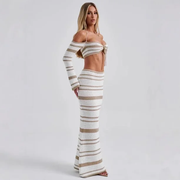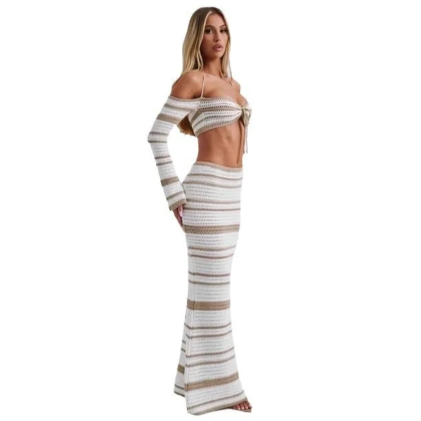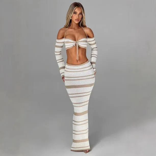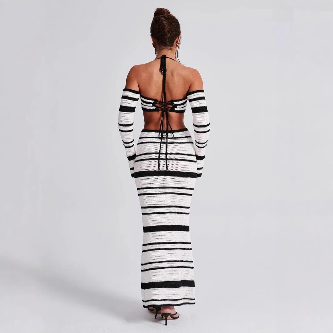 2025 New Arrival Women's Sexy Two-Piece Summer Casual Skirt Long-Sleeved Halter Top Fashionable Woven Skinny Short Fashion Style
