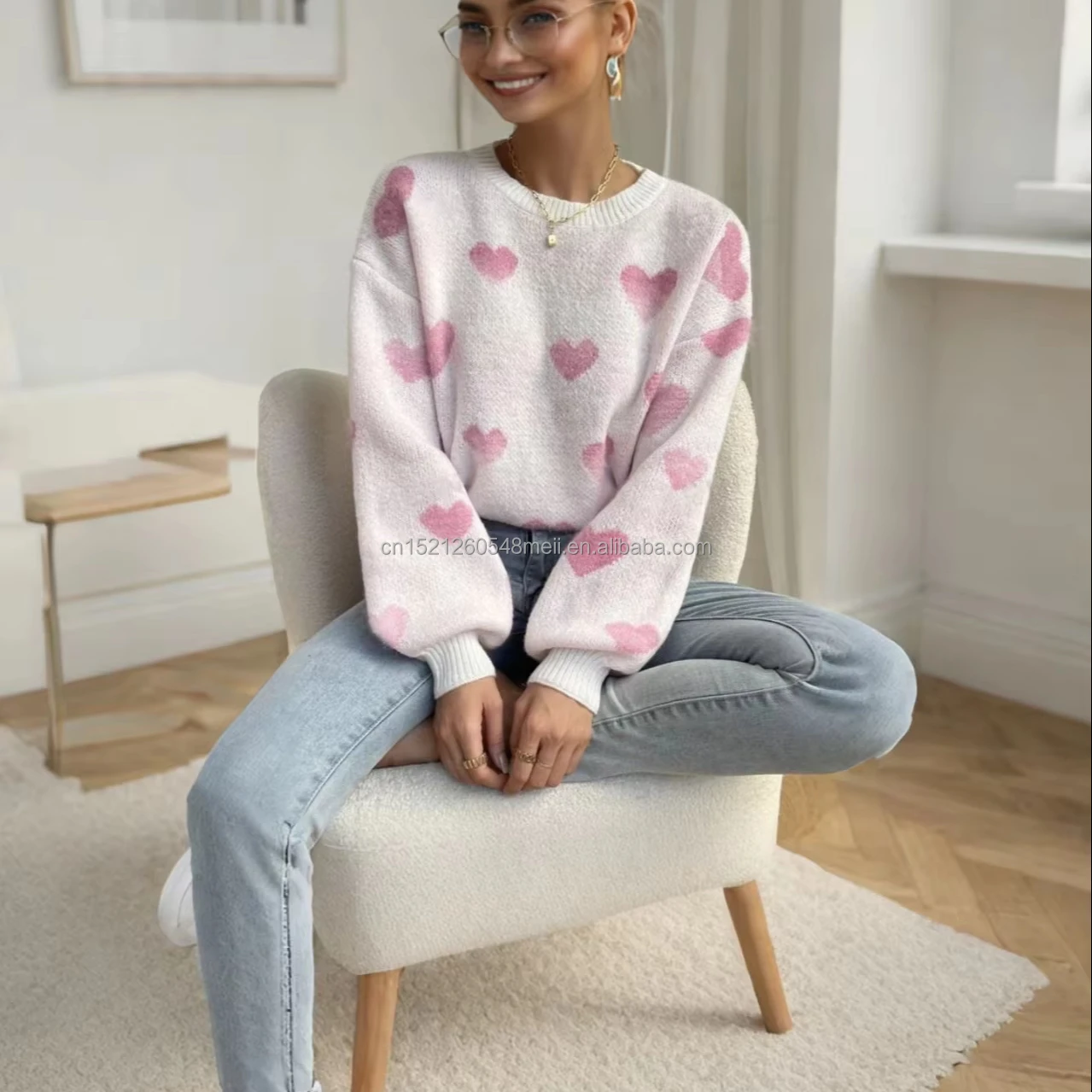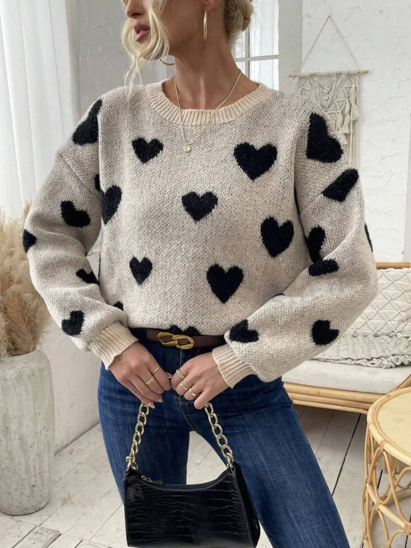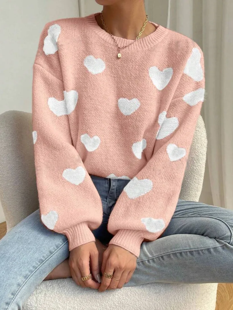 European American Women's All-Season Casual Long-Sleeved Knitted Pullover Floral Heart Pattern on Back for Winter