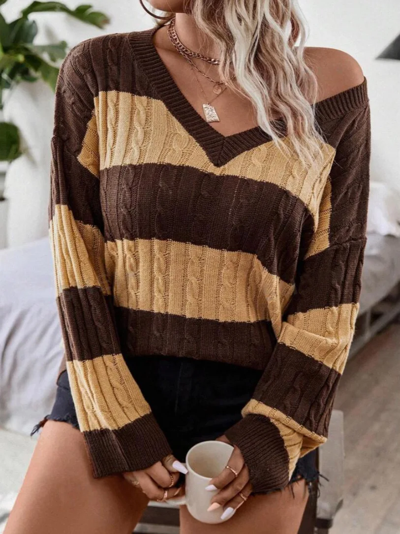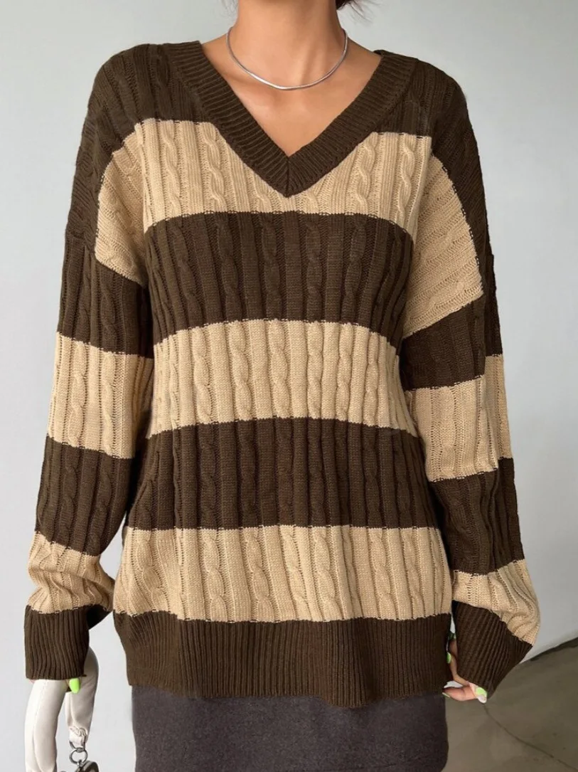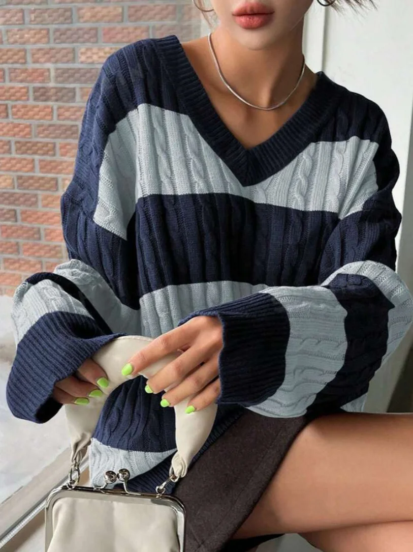 Autumn Women's Fashion Top European American Style V-Neck Contrast Color Stripes Loose Casual Oversize Long Knitted Clothing