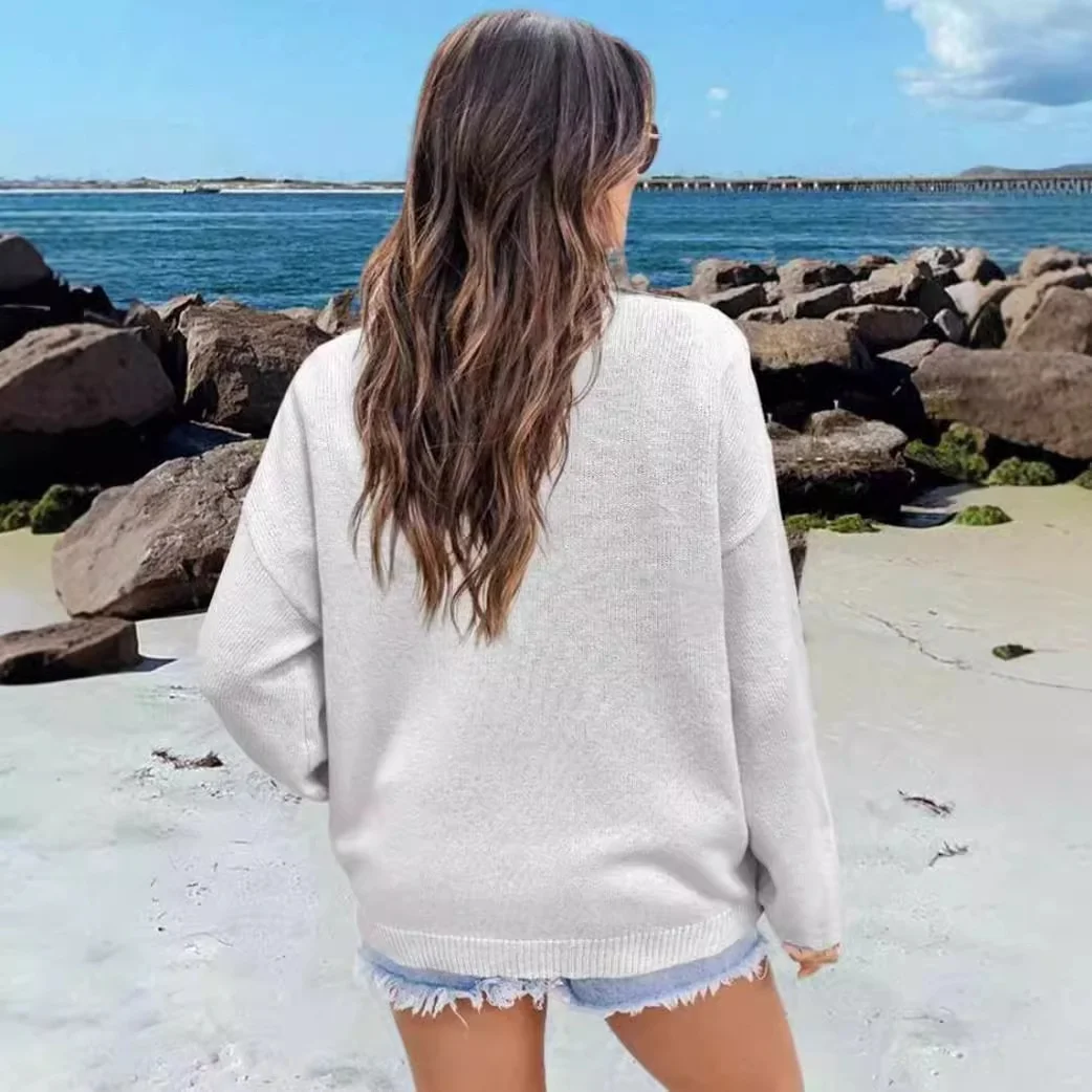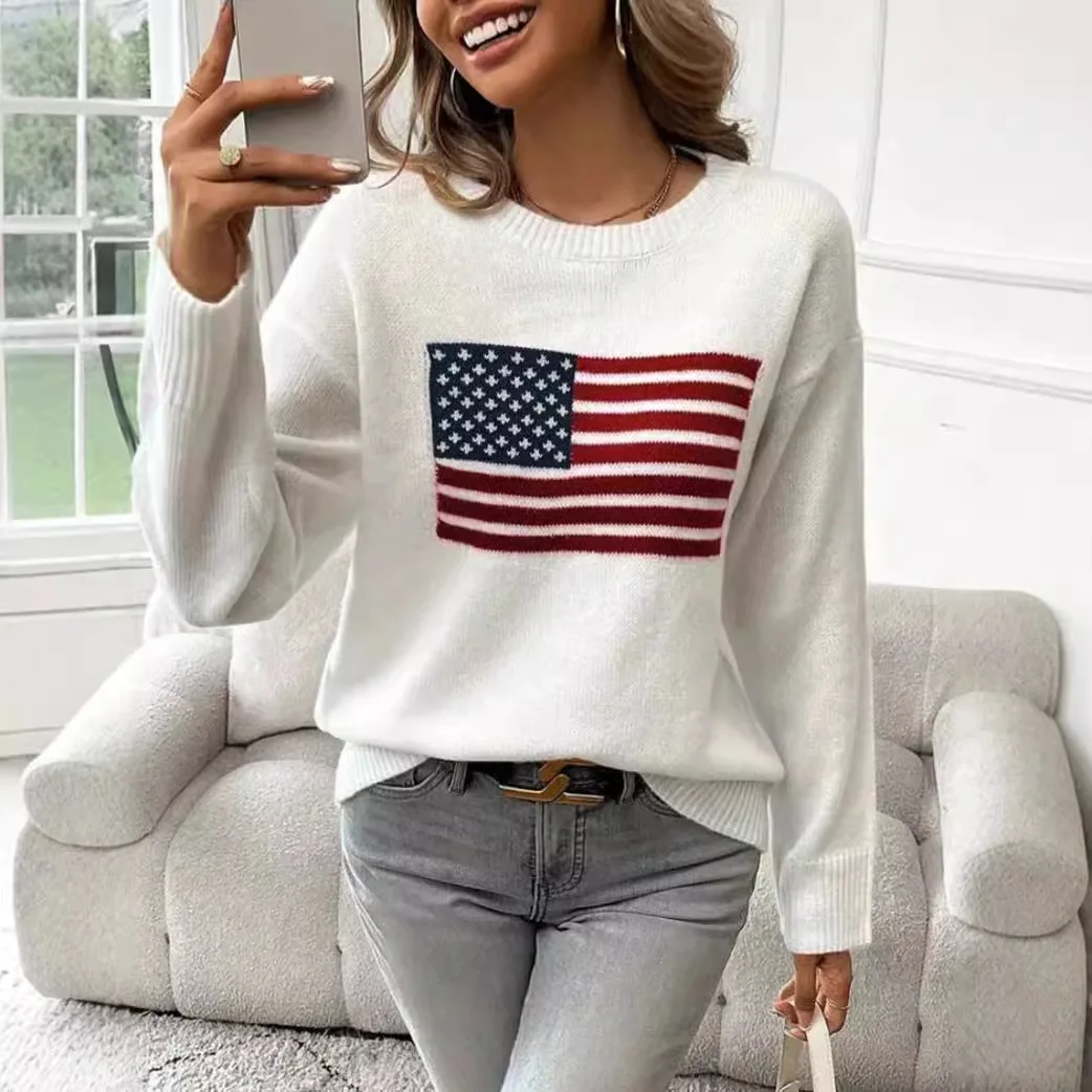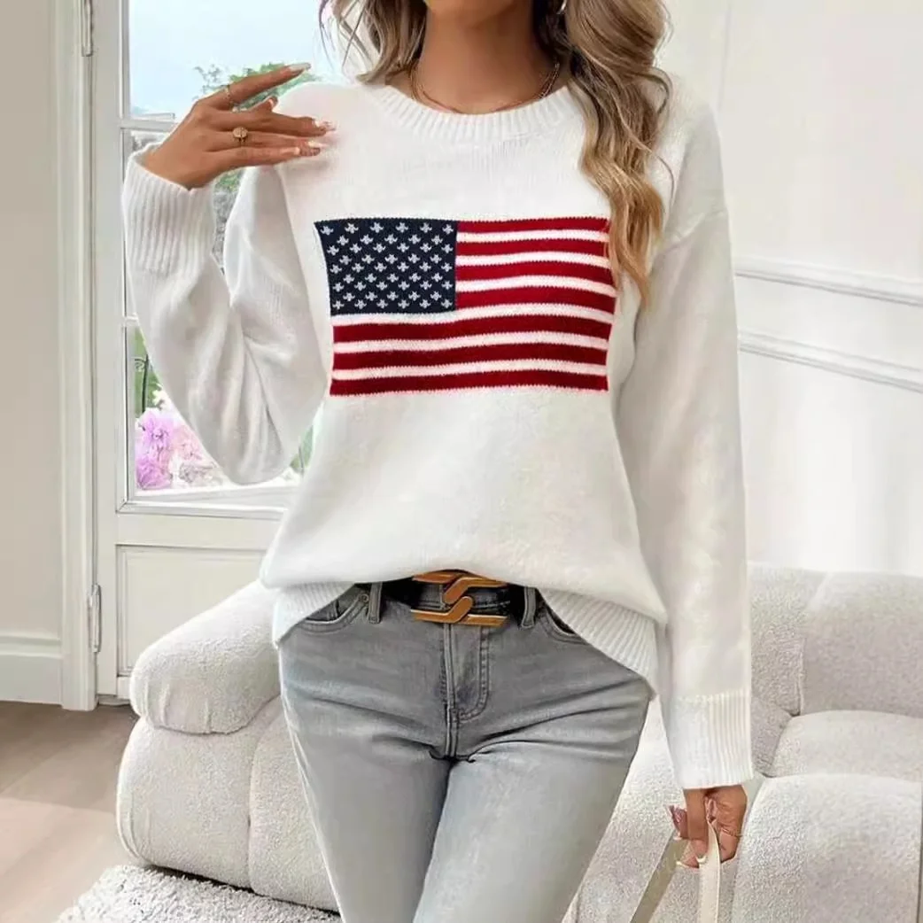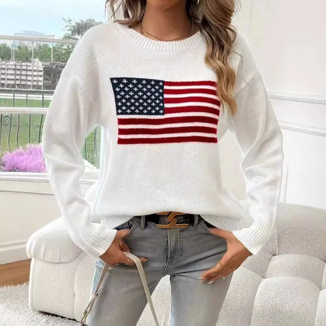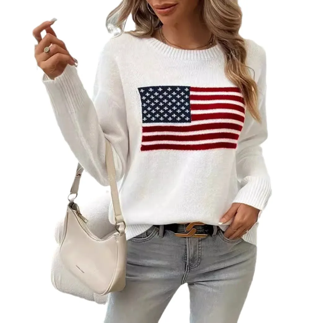 Women's Custom-Size Long Cardigan Korean Fashion Design Knitted Flag Pattern Versatile Breathable Autumn Clothes Front Wholesale