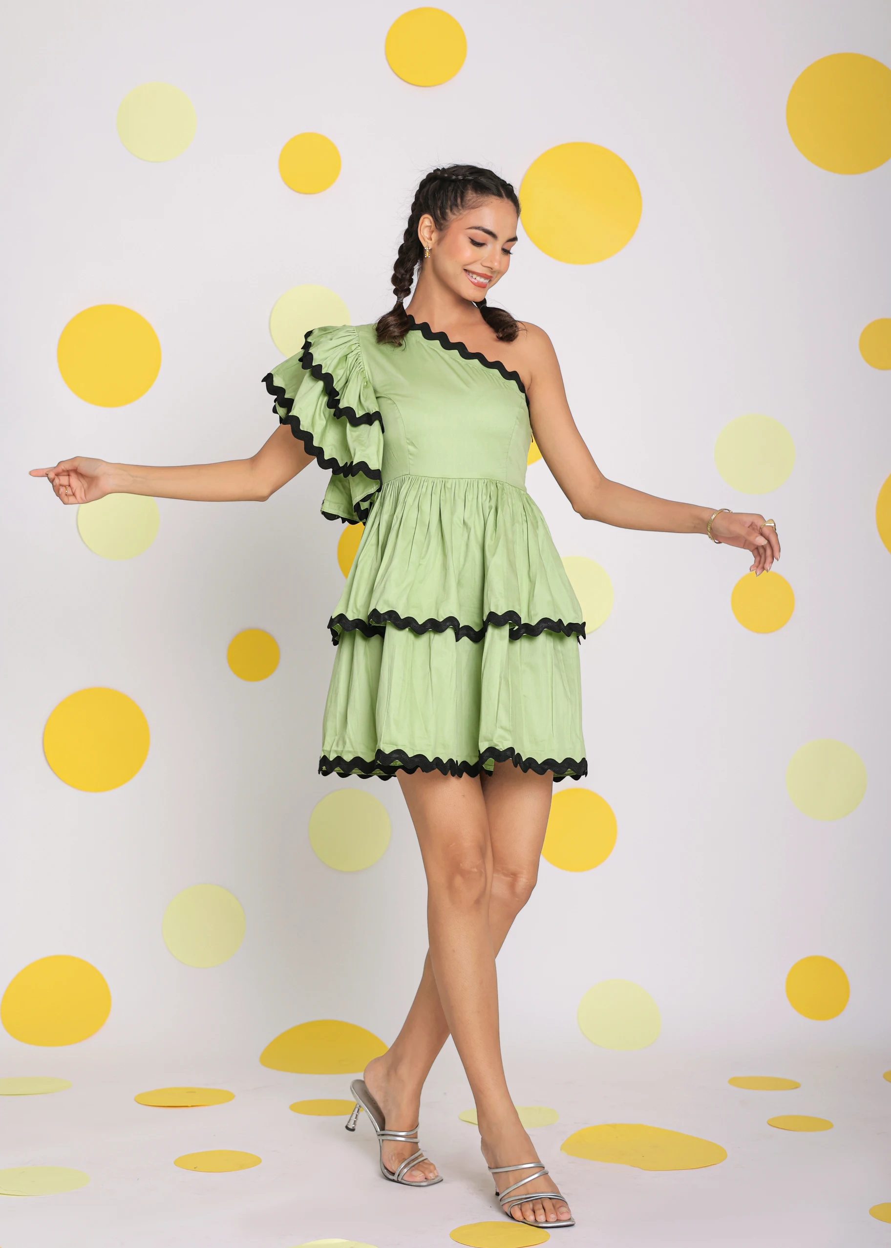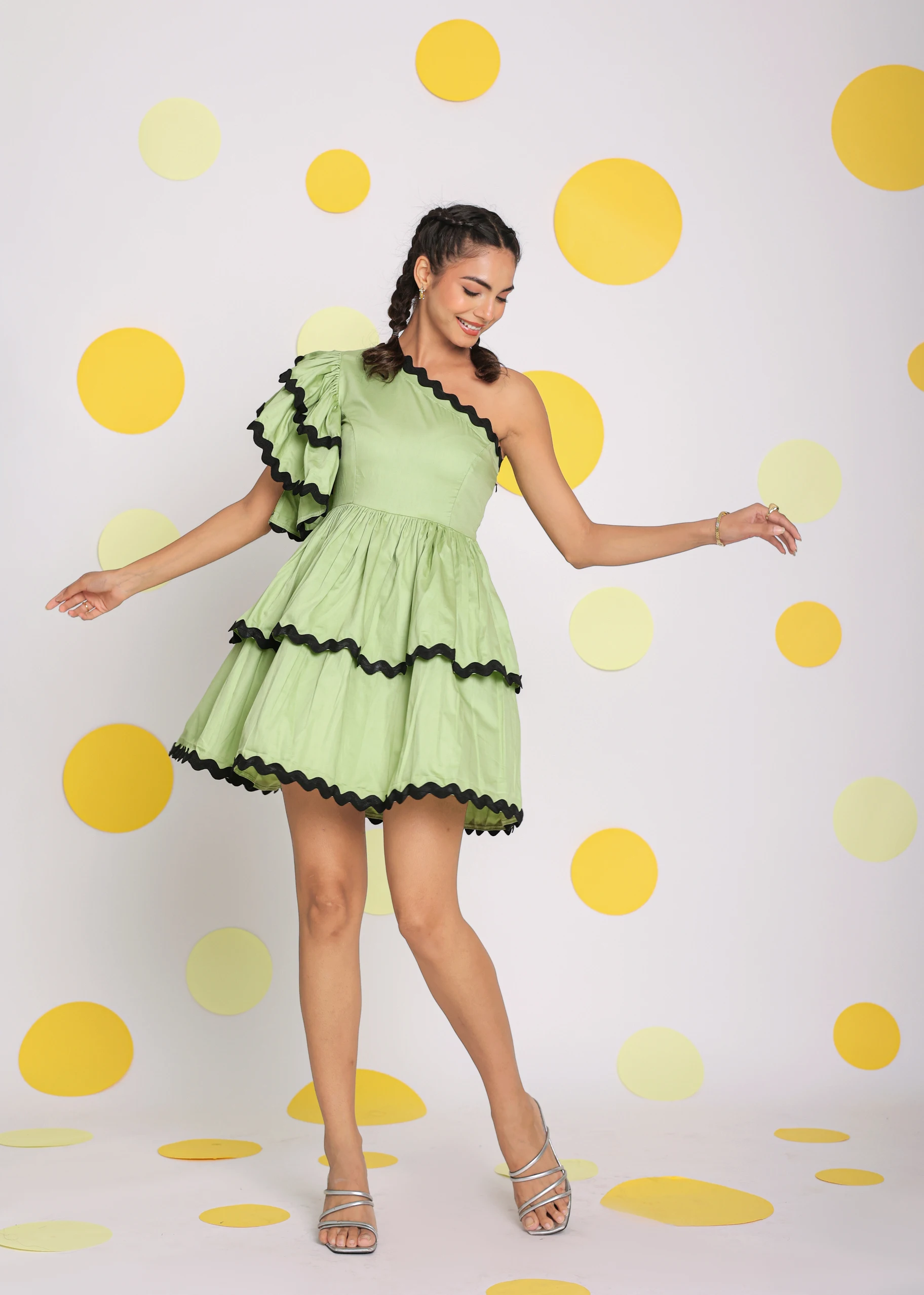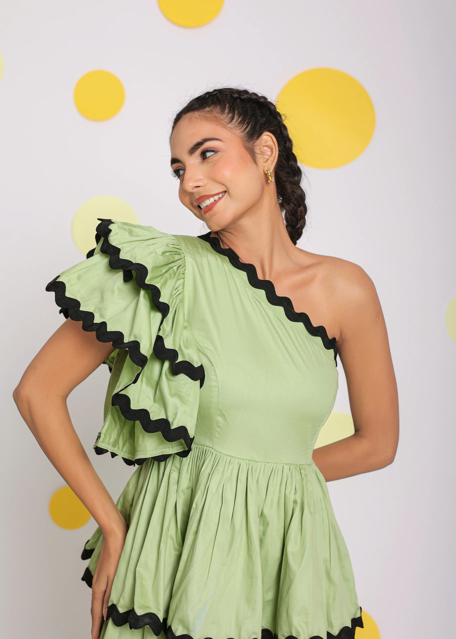 Mint Green Pista Mini Dress Natural Cotton One Shoulder with Frilled Bust Button Eco-Friendly Relaxed Fit Washable Burst Dress