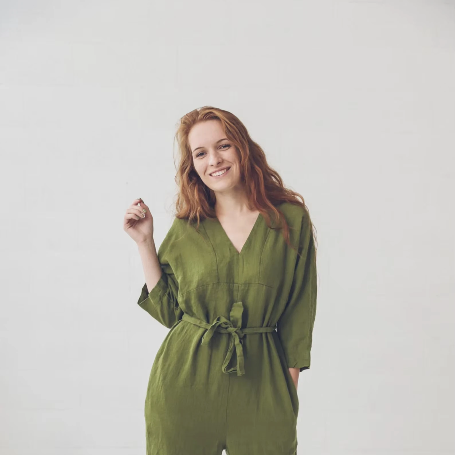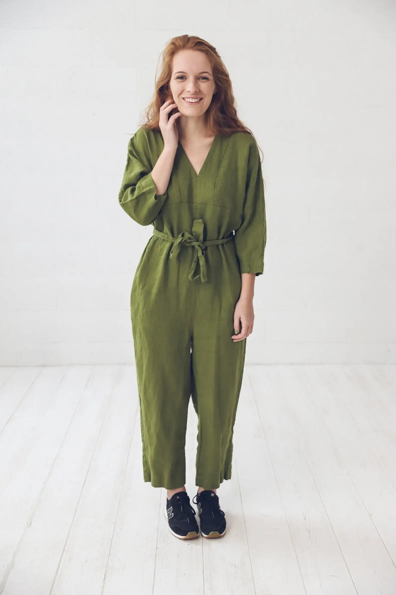 Elegant Women's 1-Piece Summer Dress Long Linen Jumpsuit with V-Neck Soft & Woven Plain Dyed Waist Belt Summer Overall