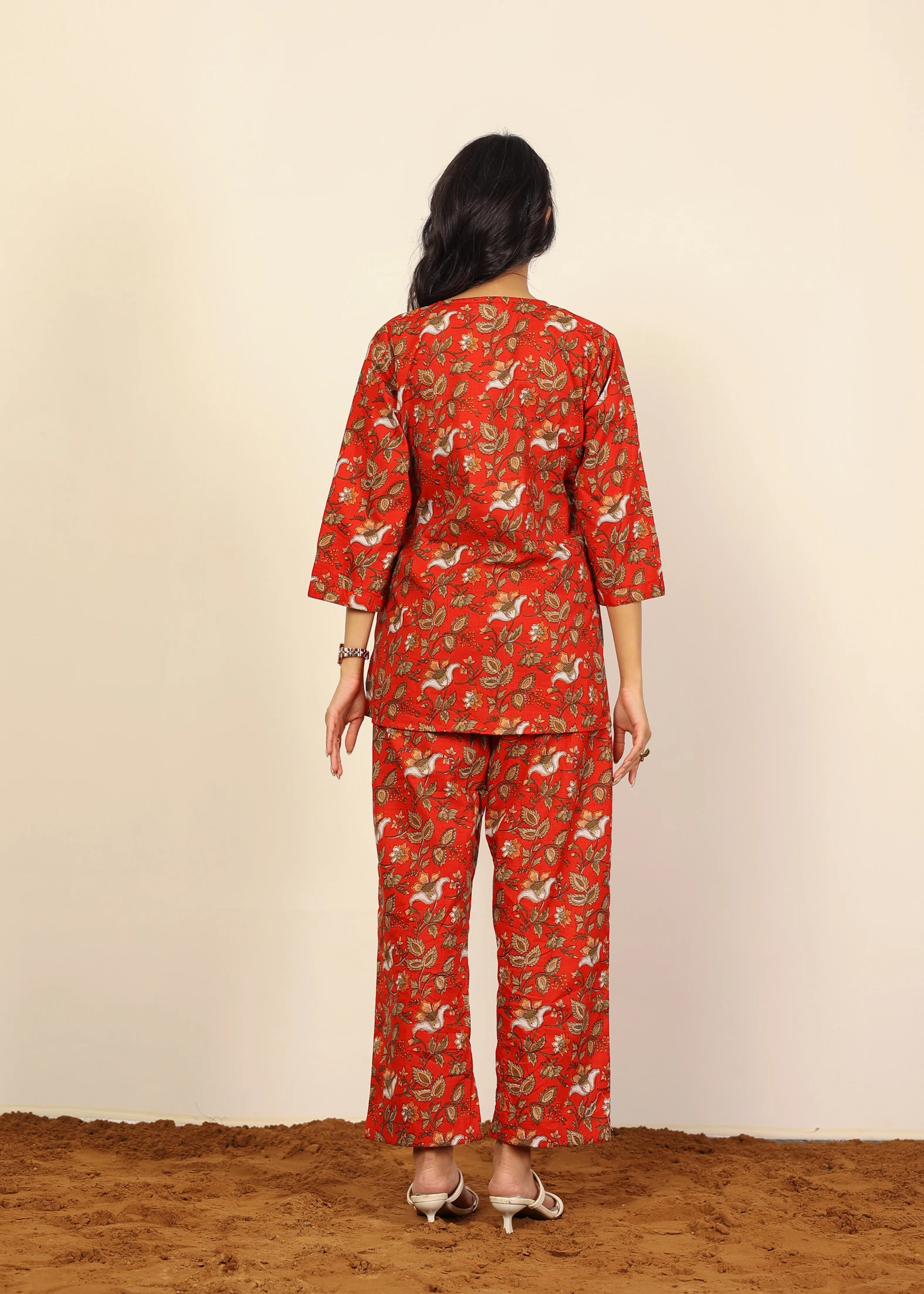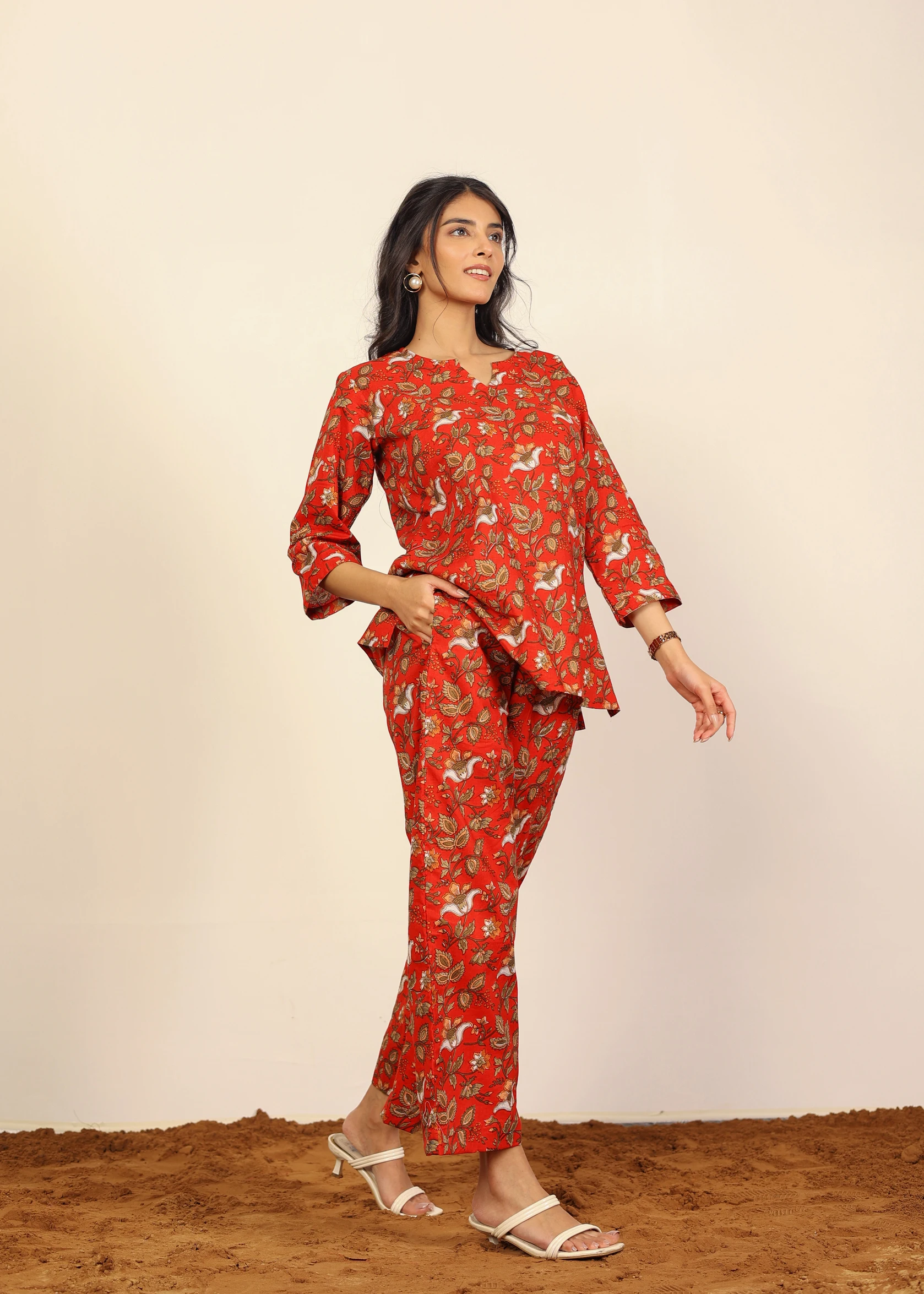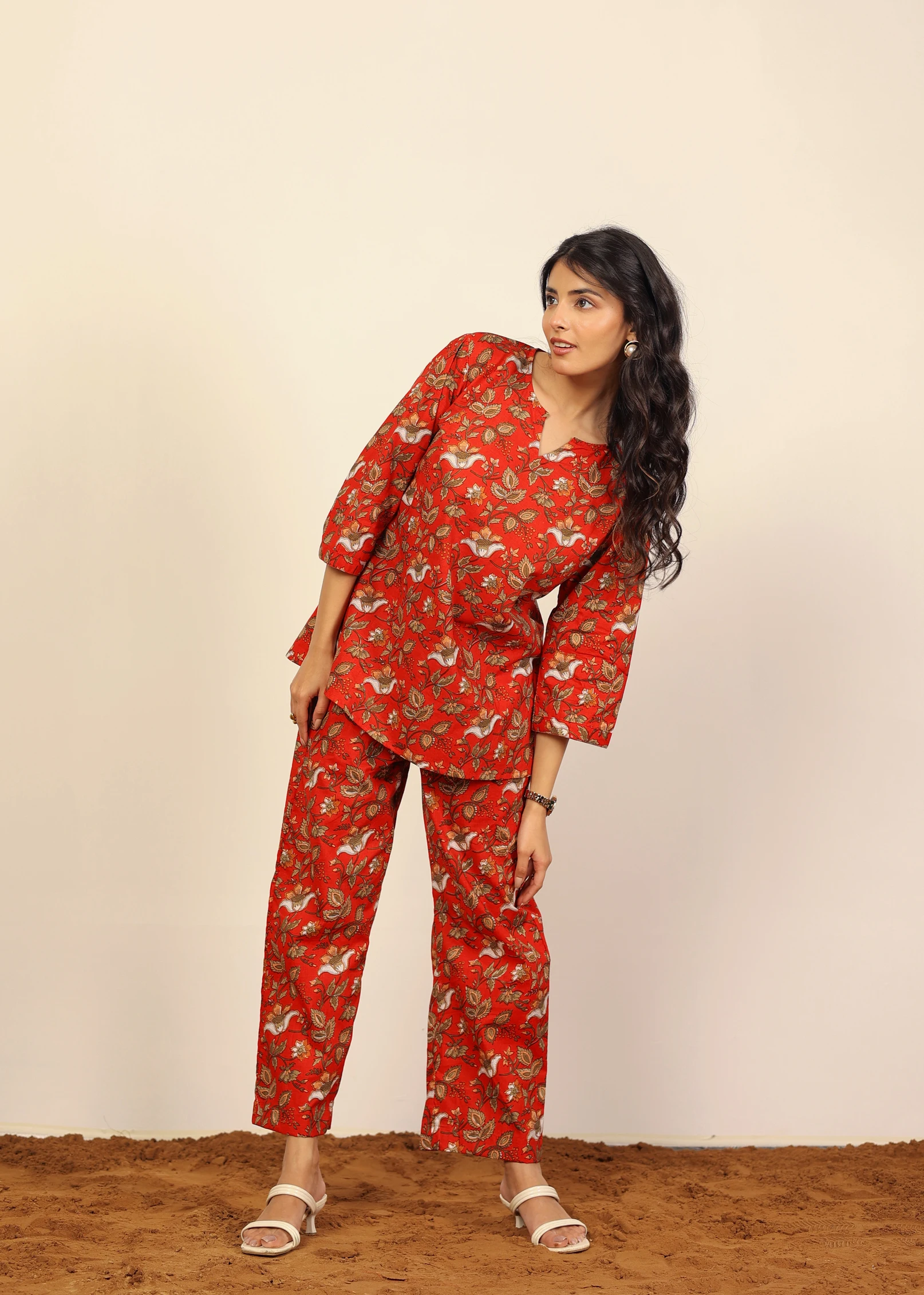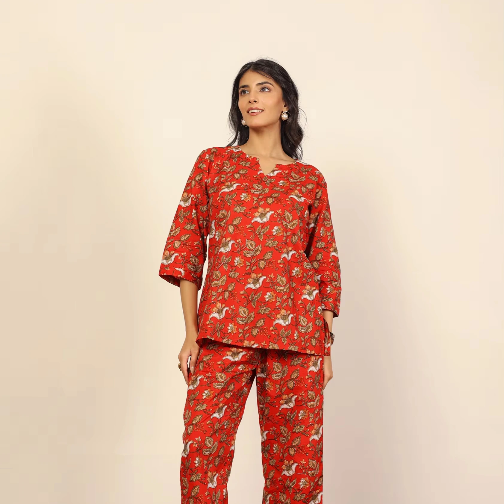 Red Multicolor Floral Cotton Hand Block Print Co-ord Set V-Neck Top Button Wide Pant 100% Natural Cotton Short Kurta Style