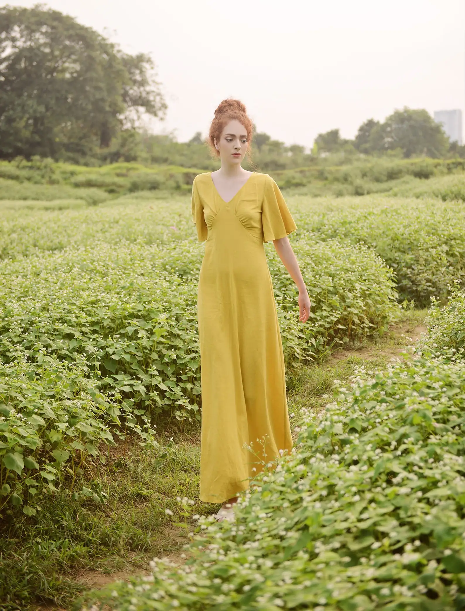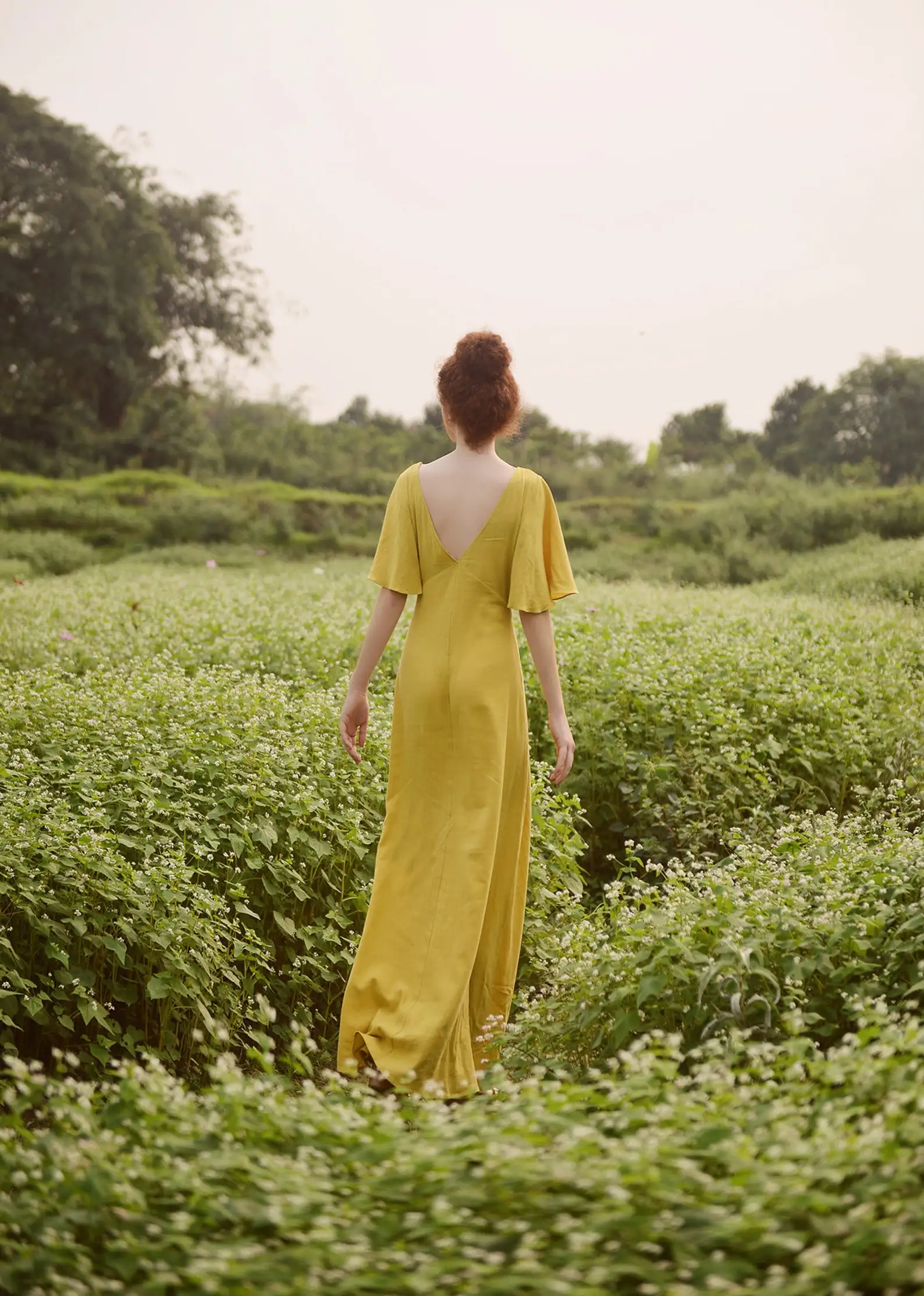 Comfy Cotton Long Gold Dress for Women Plus Size Clothing Spring Summer Natural V Neck Breathable Maxi Dress Available Big Size