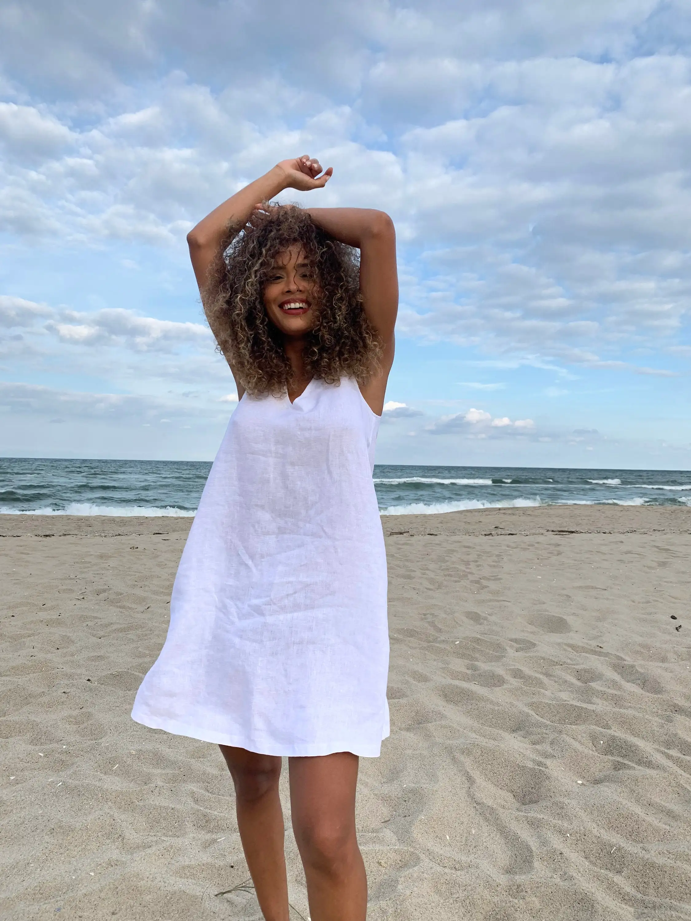 Classic White Linen Tank Dress with Applique Decoration Minimalist Beach Cover-Up Summer Short Linen Sleeveless Tunic Dress