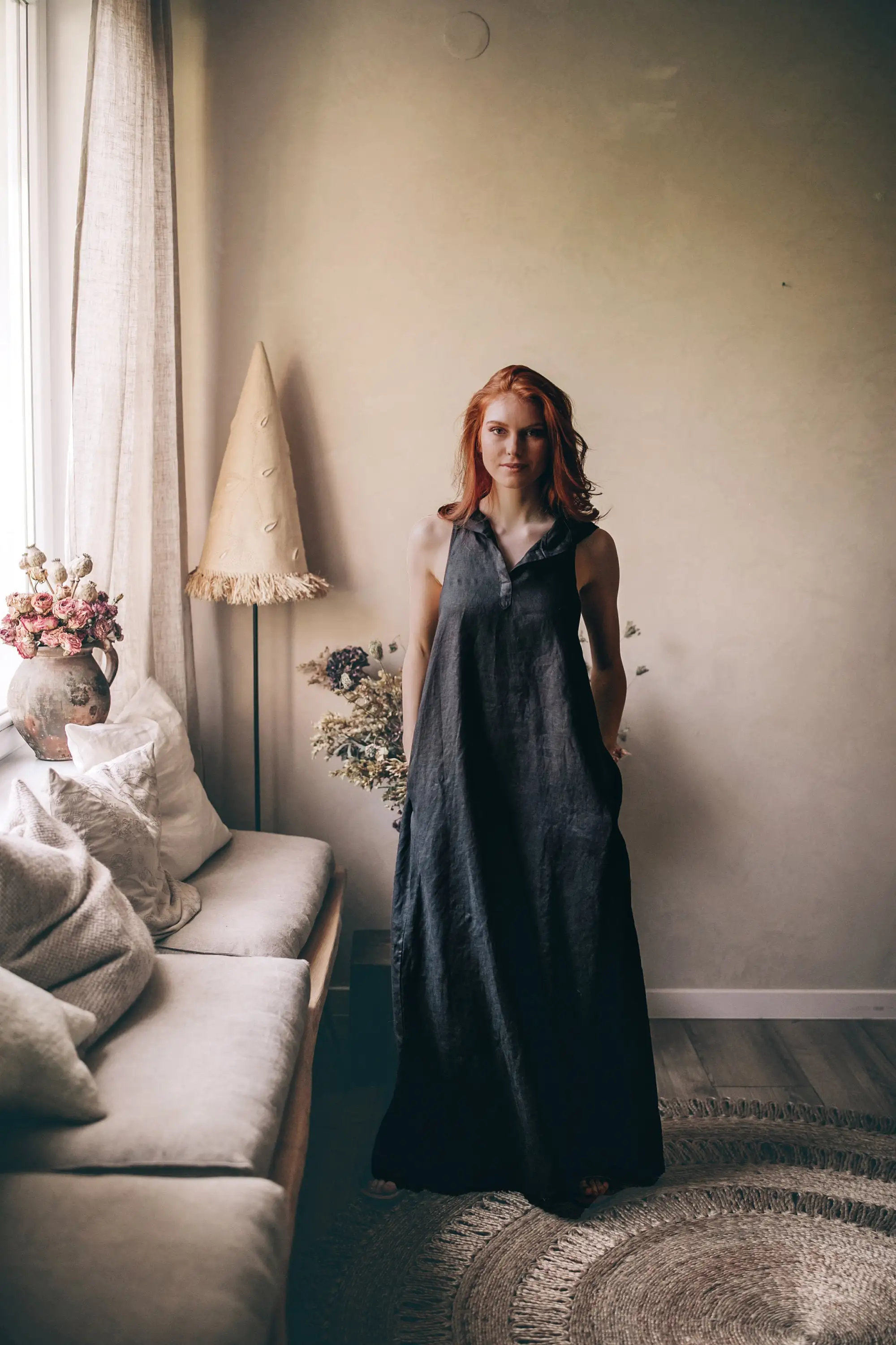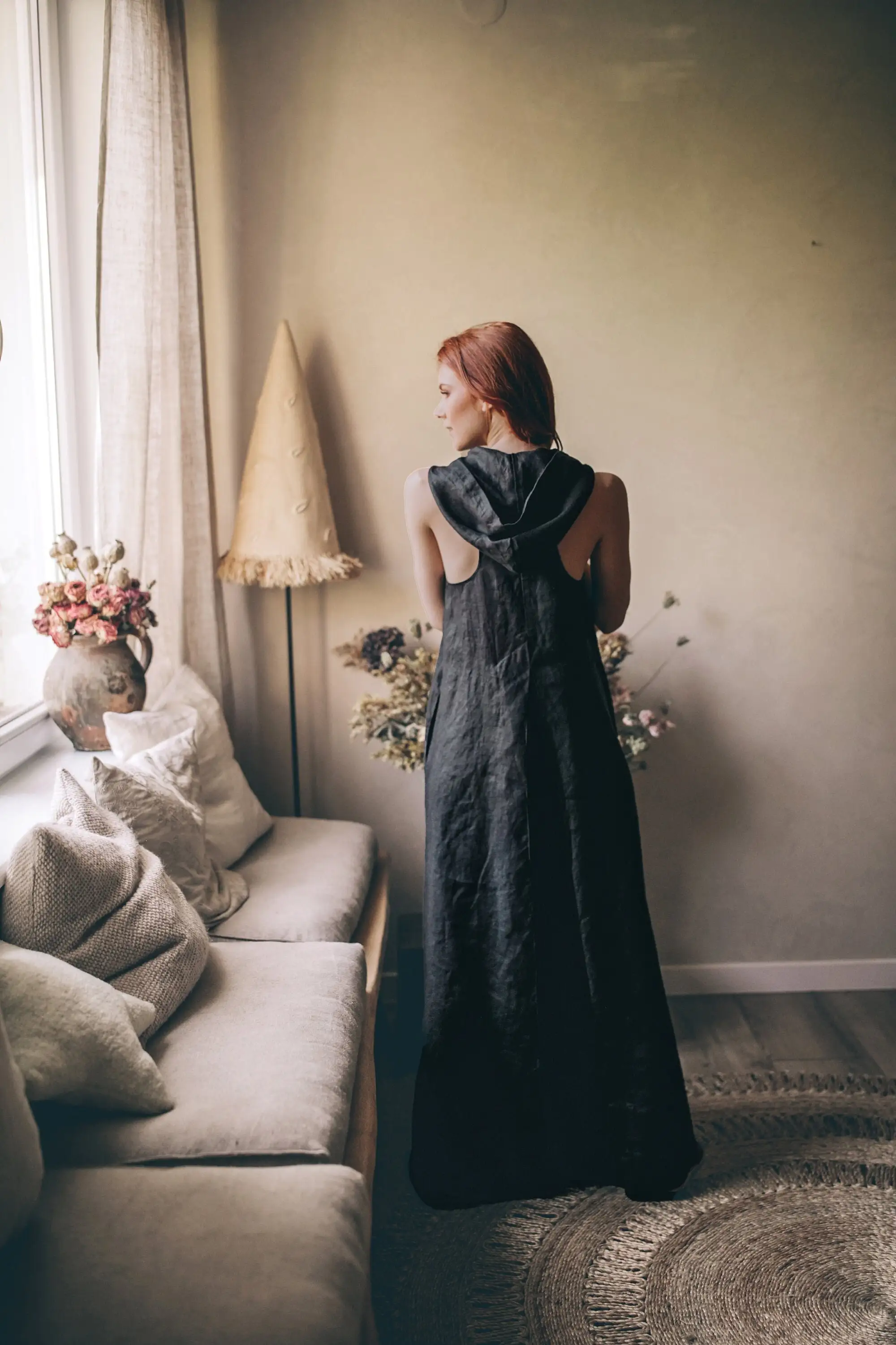 Plus Size Clothing V- Neck Maxi Summer Maxi Dress for Women Black Linen Kaftan with High Collar Hood Plus Size Clothing Fabric