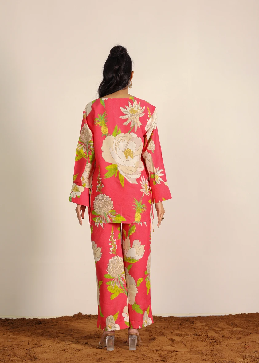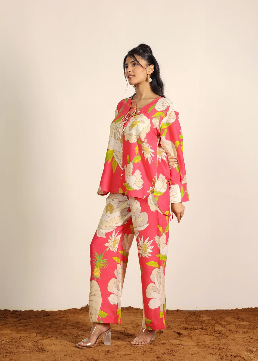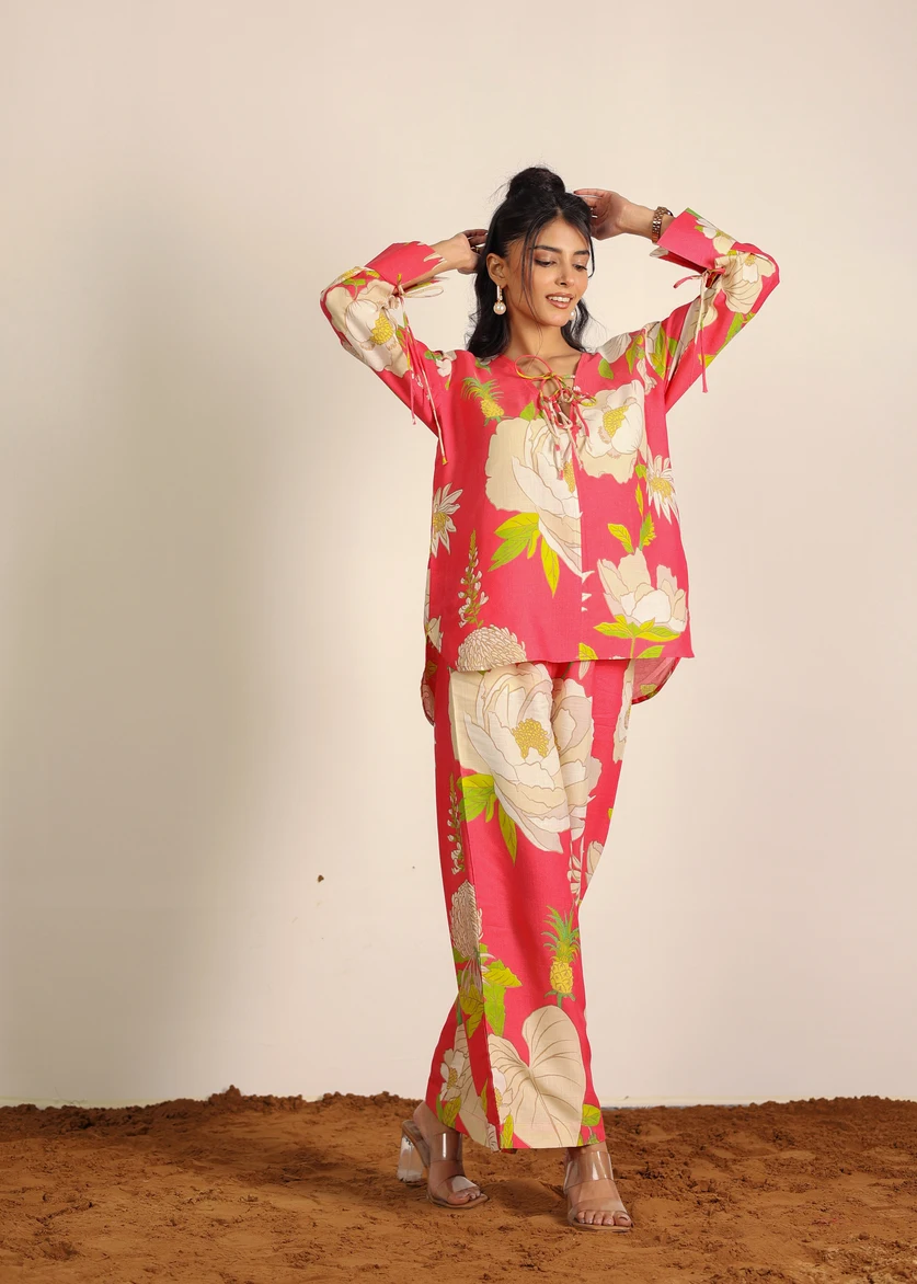 Women's Summer Pajama Set Pink And Multi Floral Oversized Long Shirt And Wide Legs Pant 100% Cotton Indo Western Co-ord Set