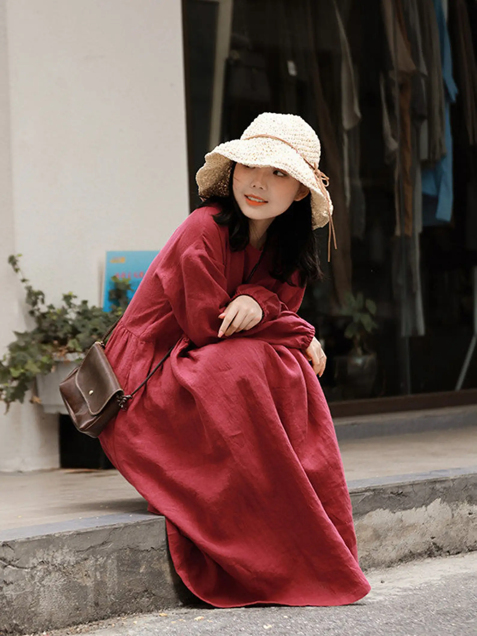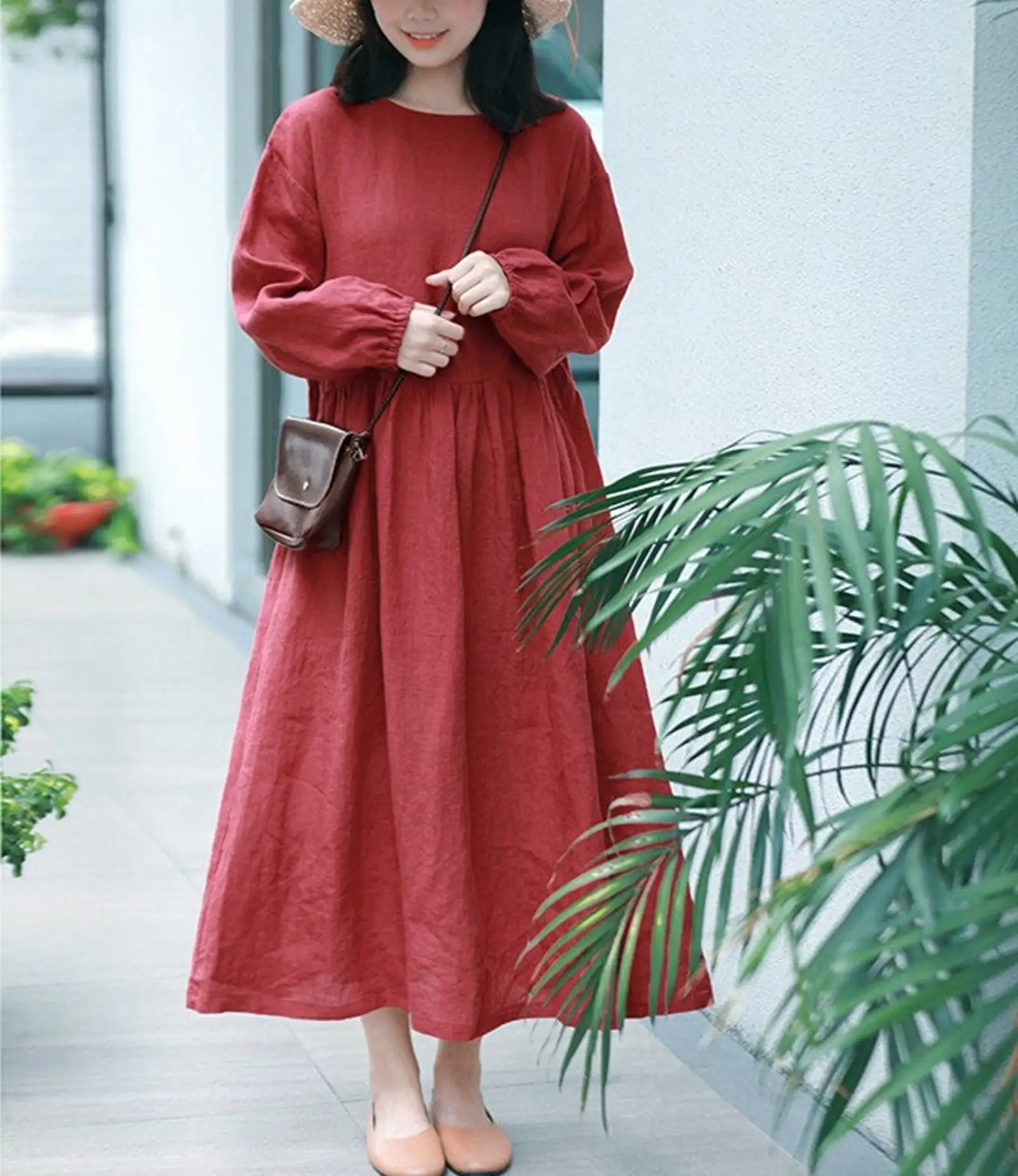Women's Customizable Linen A-Line Maxi Dress Fall Winter Loose Fitting Casual Clothing Long Sleeves Natural Waistline Weaved Top