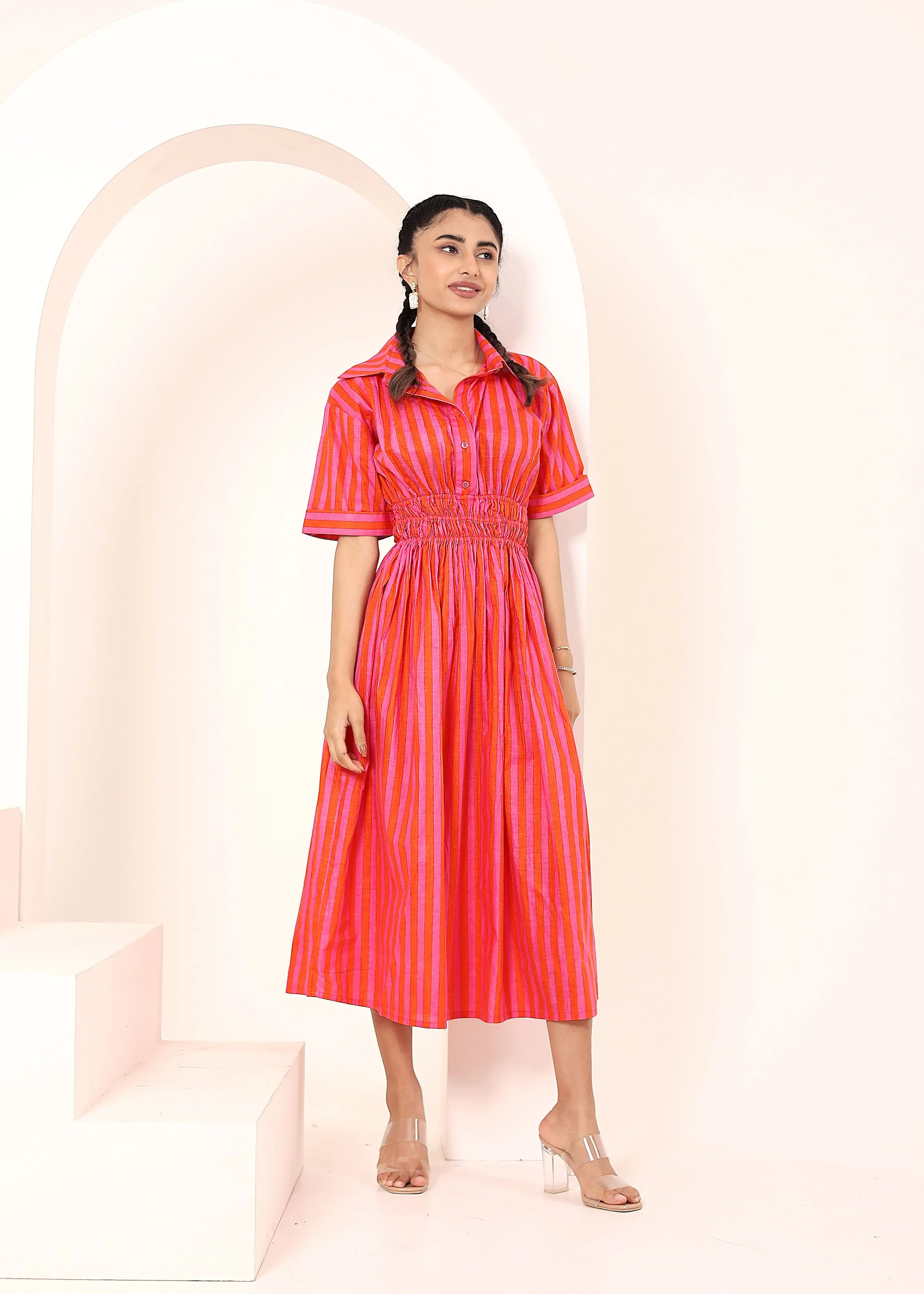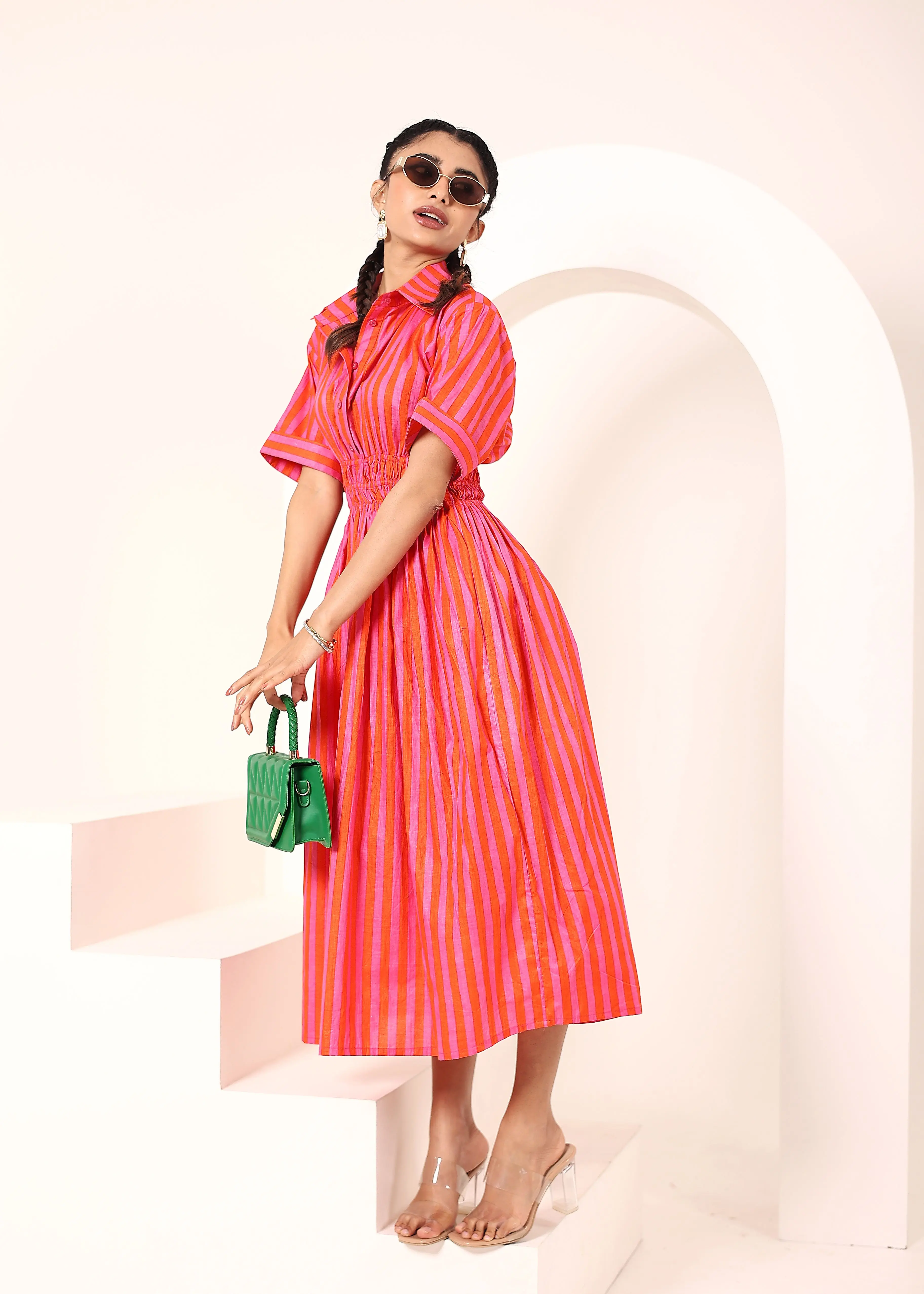 Orange And Pink Striped Shirt Dress With Smocked Waist Smocked Waist Detailing Enhances The Silhouette Available Big Size