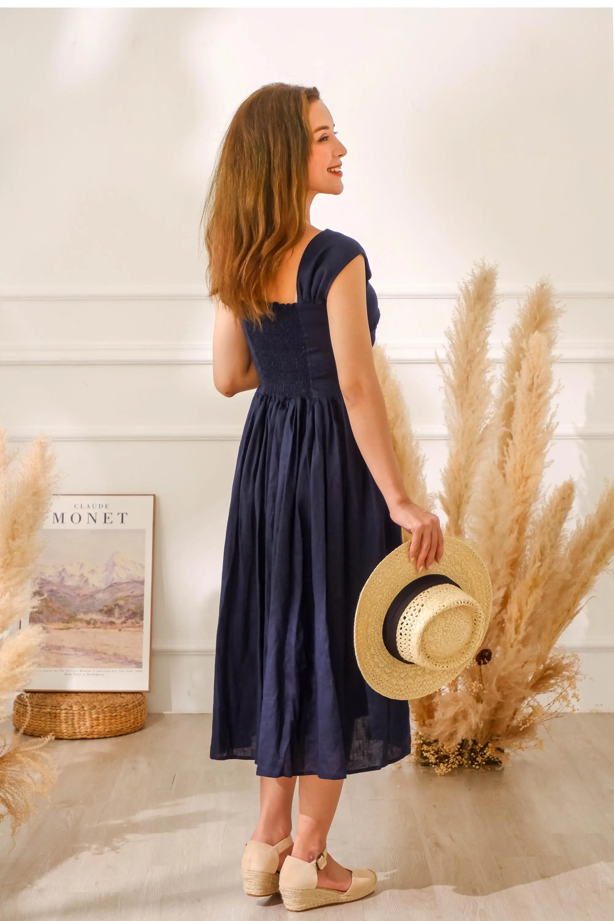 Trendy Navy Blue Woven Linen Midi Dress with Pockets Adjustable Waist Size Chic Classic Design Midi Dress Women Big Size