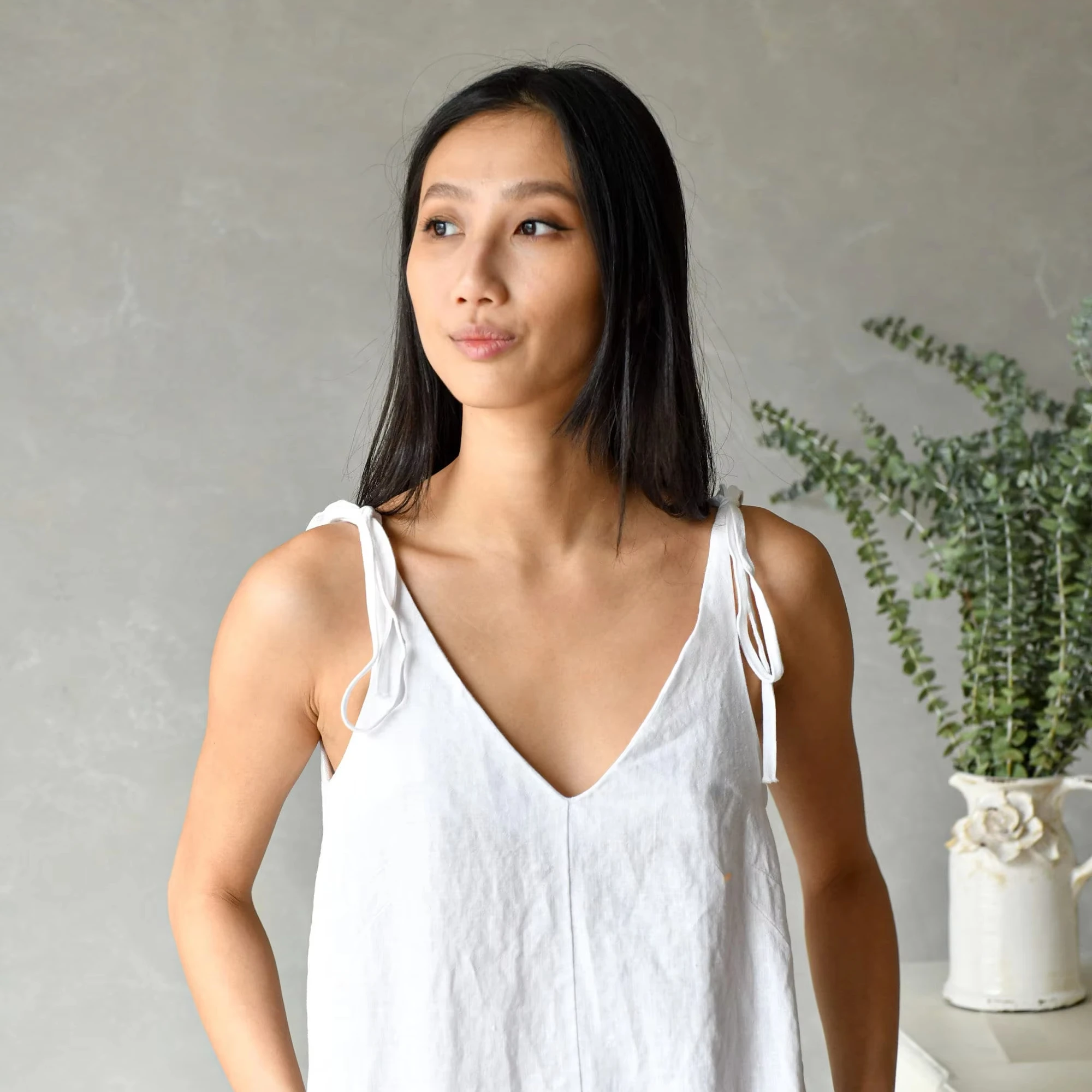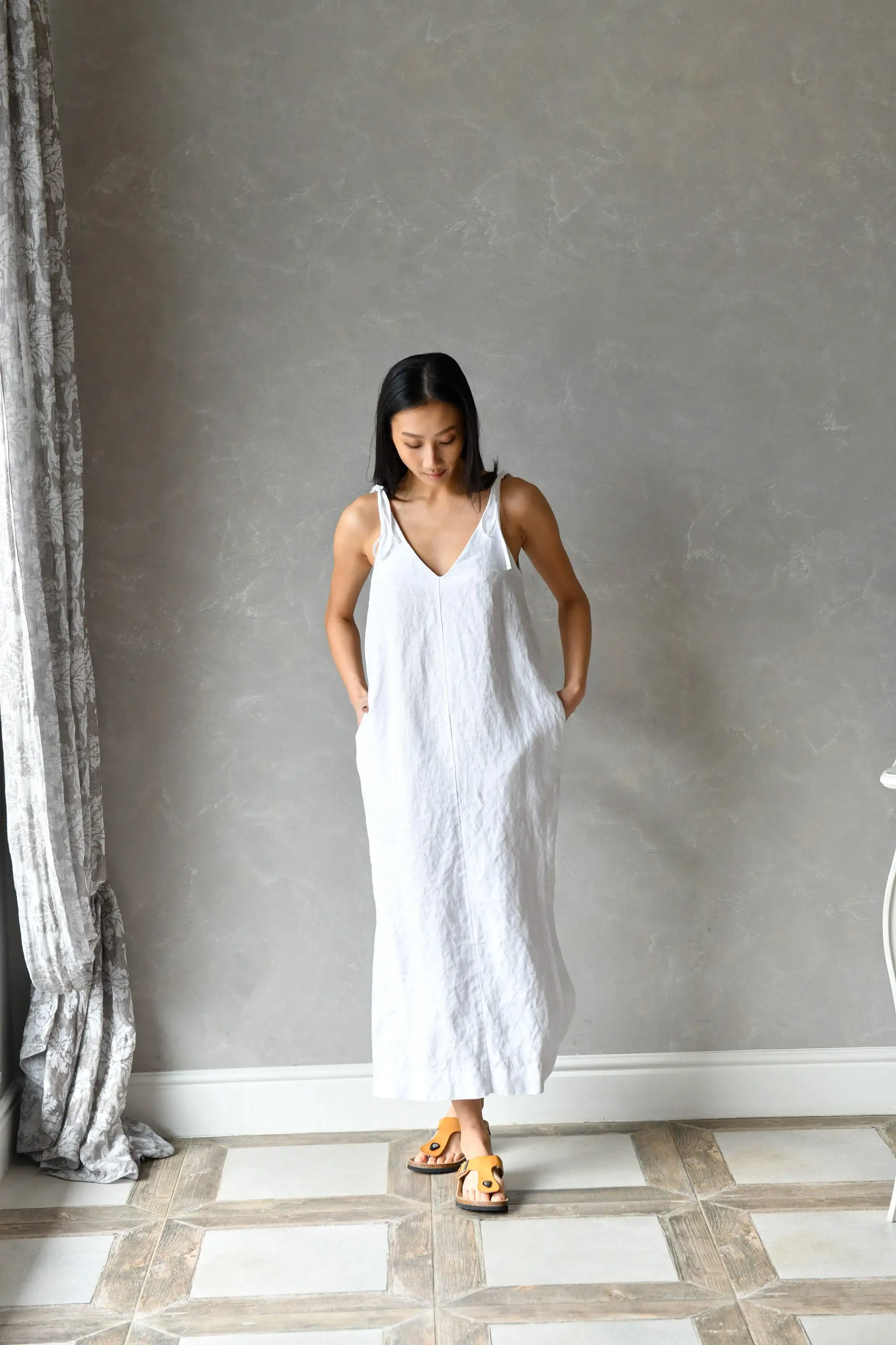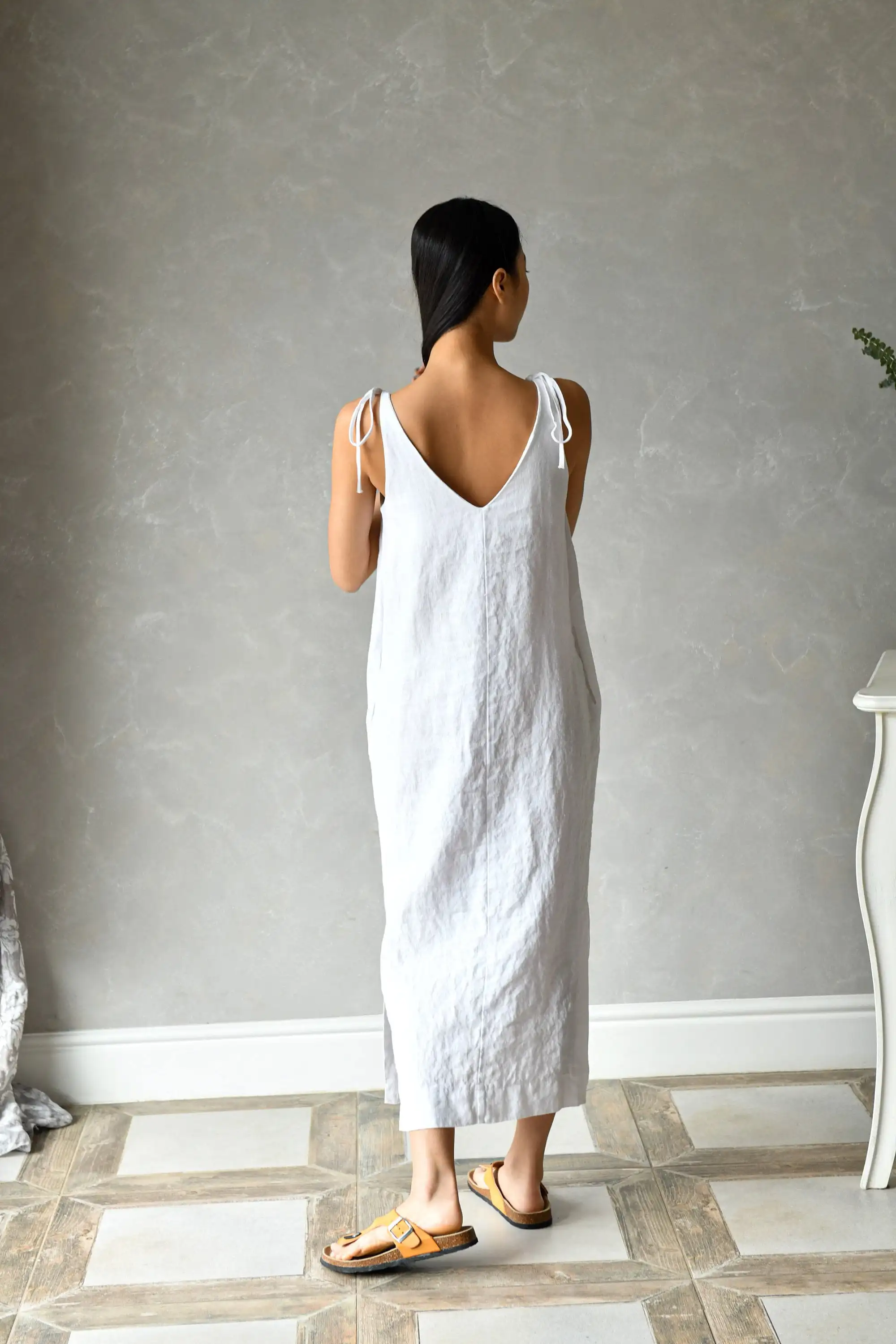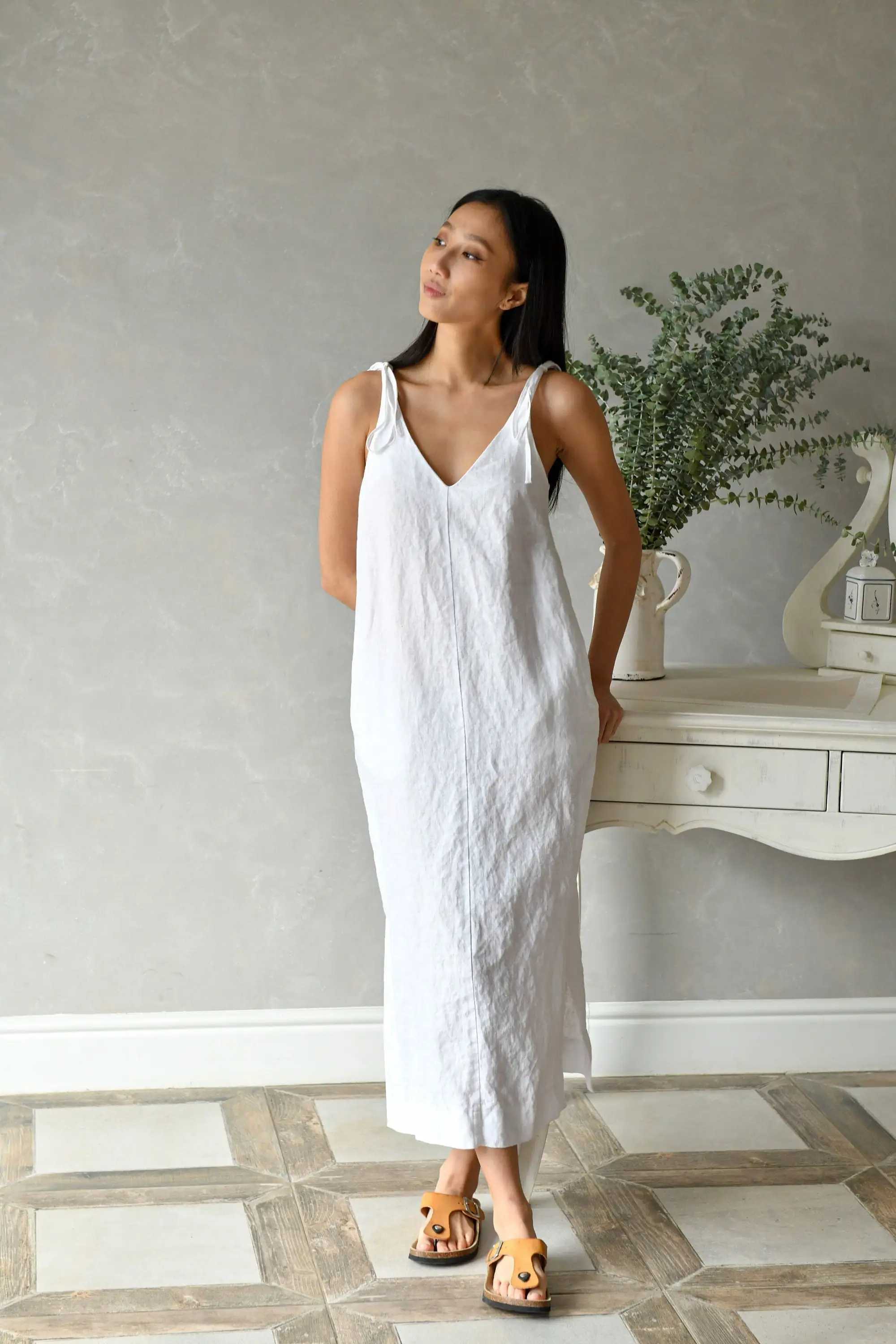Linen White Slip Dress Spaghetti Midi Sleeveless Summer Style White Linen Long Dress Linen Cami Dress Beach Wear Clothes
