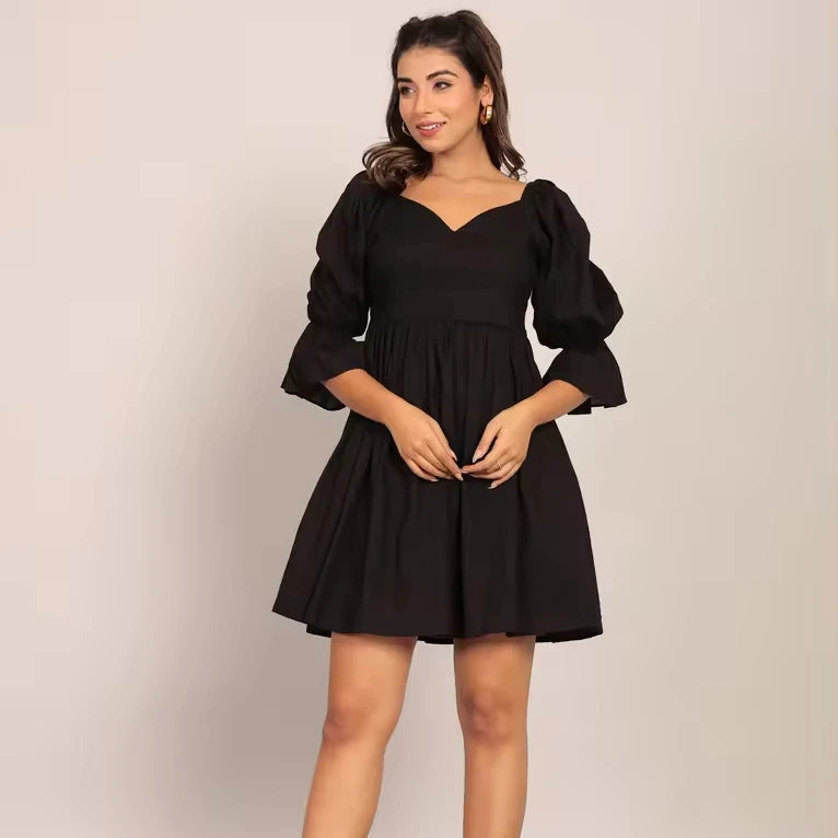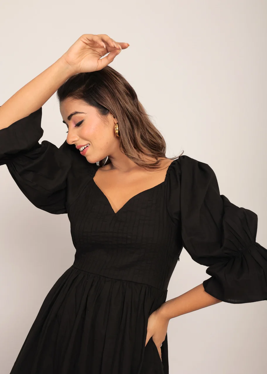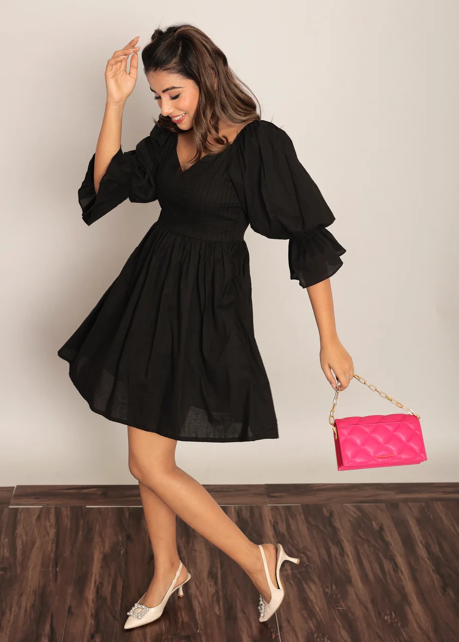 Black Solid Pleated Volume Sleeves Mini Dress Women Fashion 2025 Short Dress for Women Full Sleeves Designer Handmade One Piece