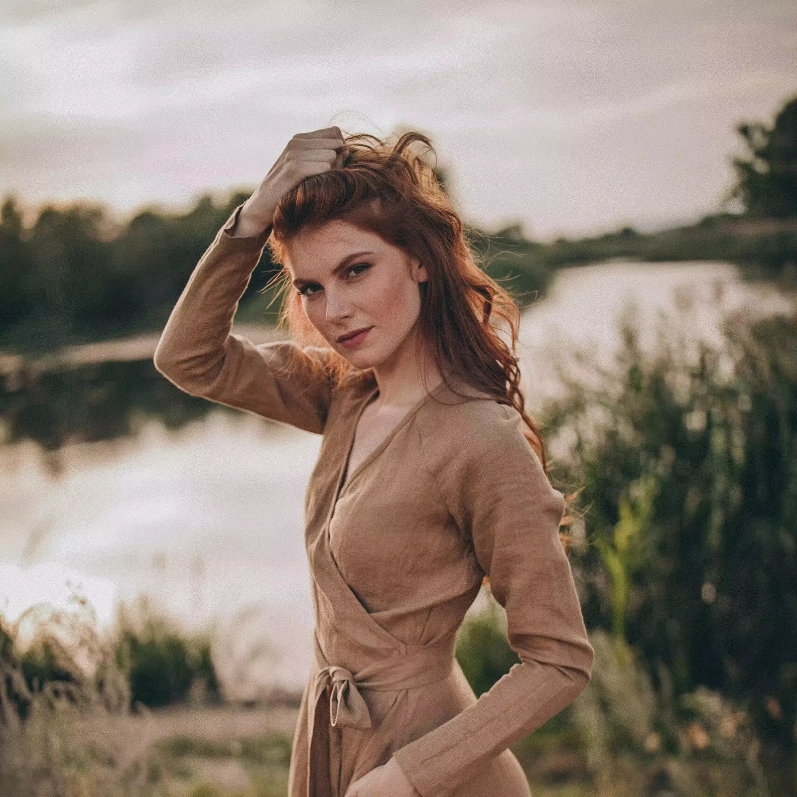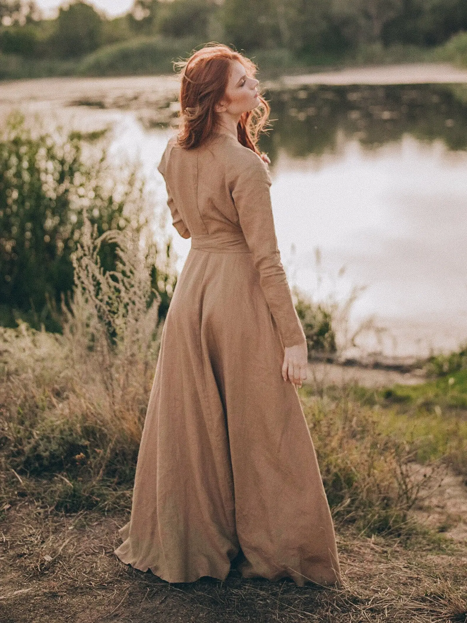 Women's New High Quality Beige Linen Wrap Dress Casual Maxi V-Neck Loose Fit Cotton Linen Natural Waistline Plain Dyed