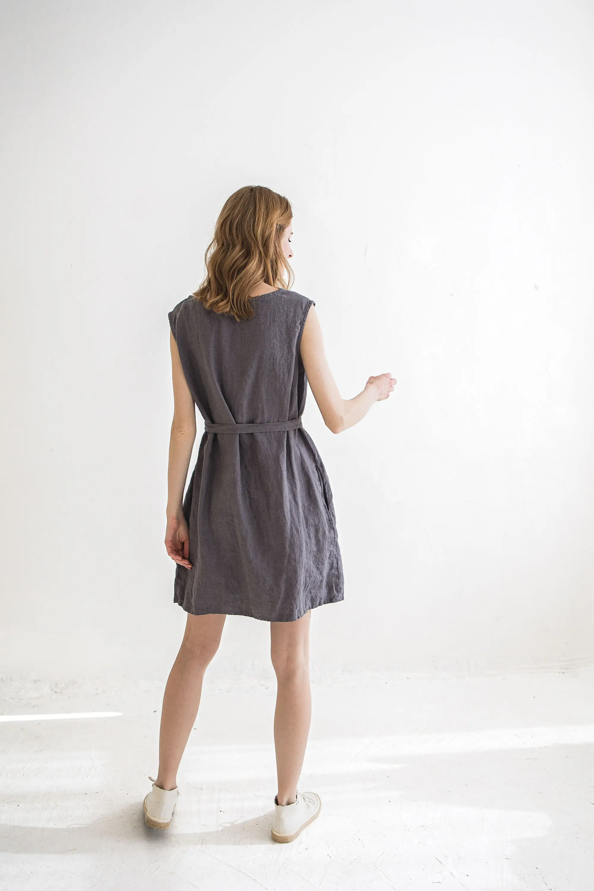 Classic Linen Tunic Dress V-Neck Sleeveless Lace-Up Appliques Decoration A-Line Silhouette Built-in Bra-Summer Casual Wear