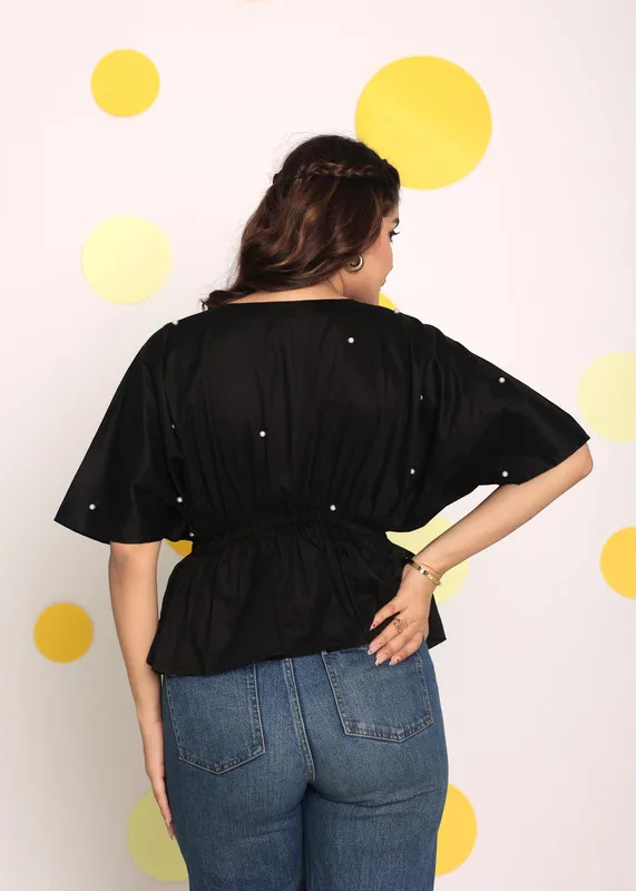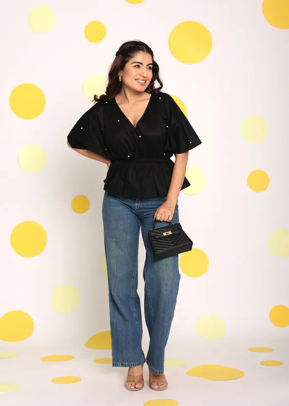 ZYHT 21938 Black Velvet Mini Dress Square Neck Long Puff Sleeves with Pearl Trim & Crystal Dess Flared Scalloped Hem Dresses