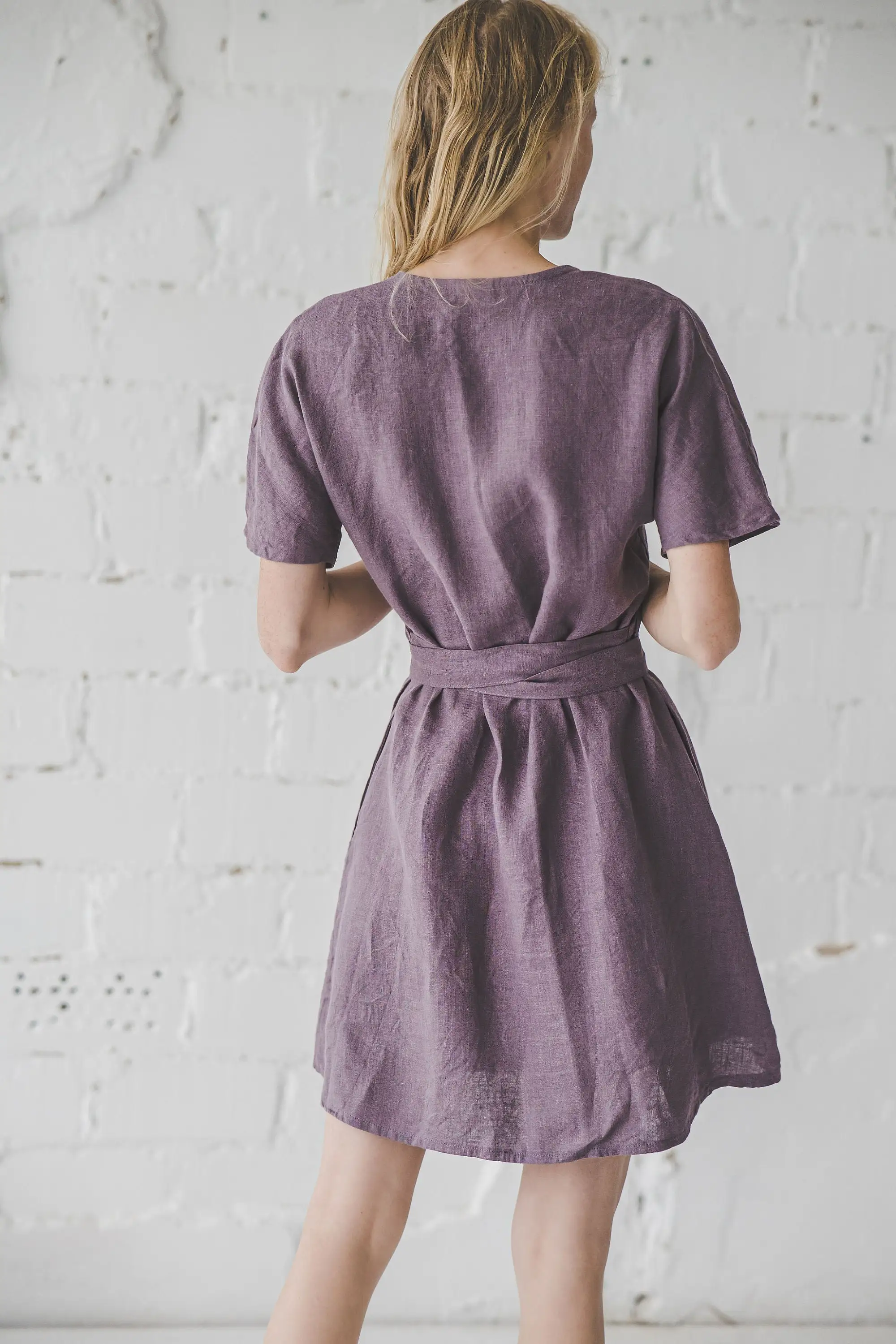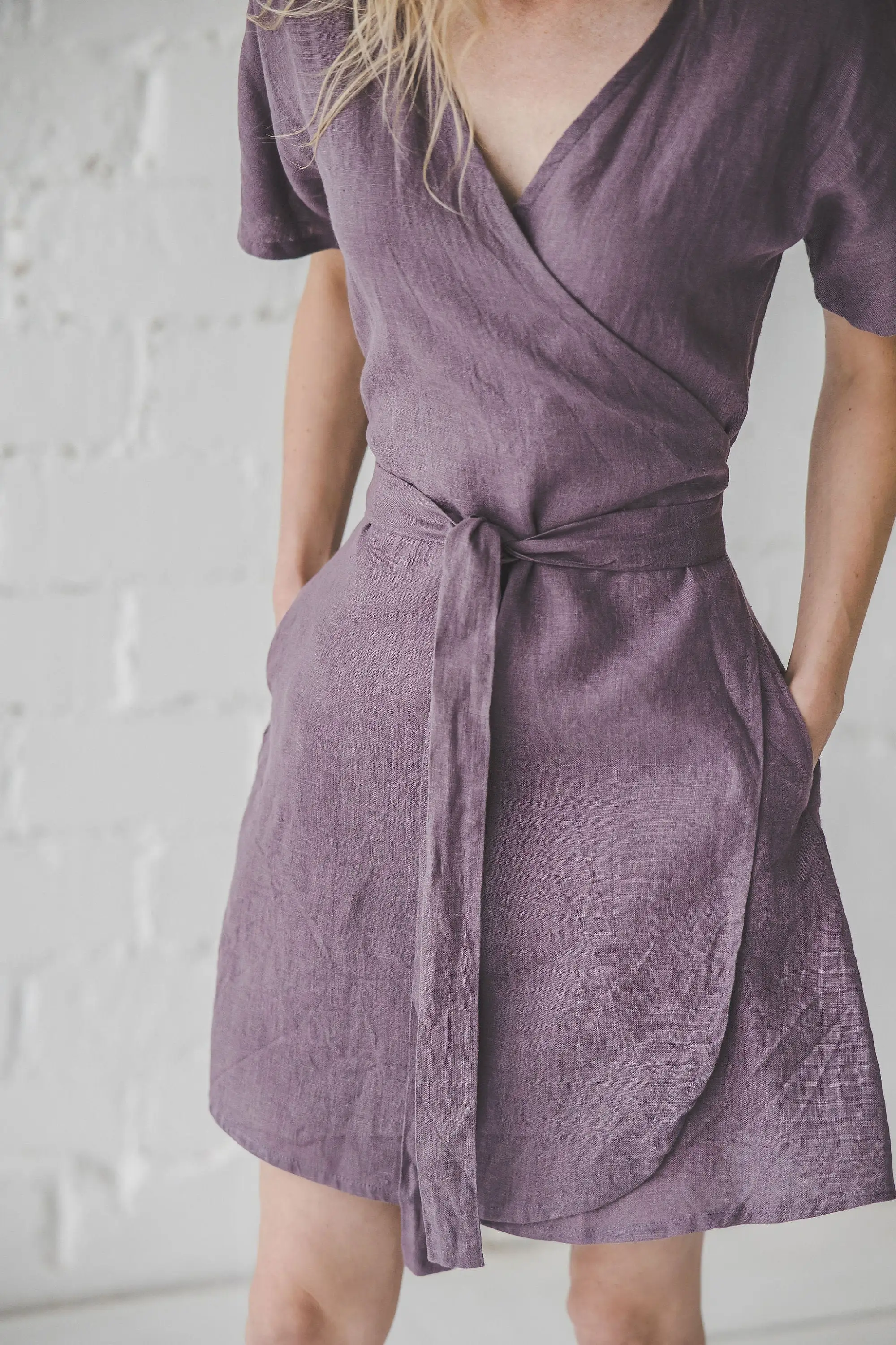 Vintage Woven Eco-Friendly Linen Short Sleeve V-Neck Wrap Dress Wide Skirt Mini Dress Summer Bridesmaids Dress