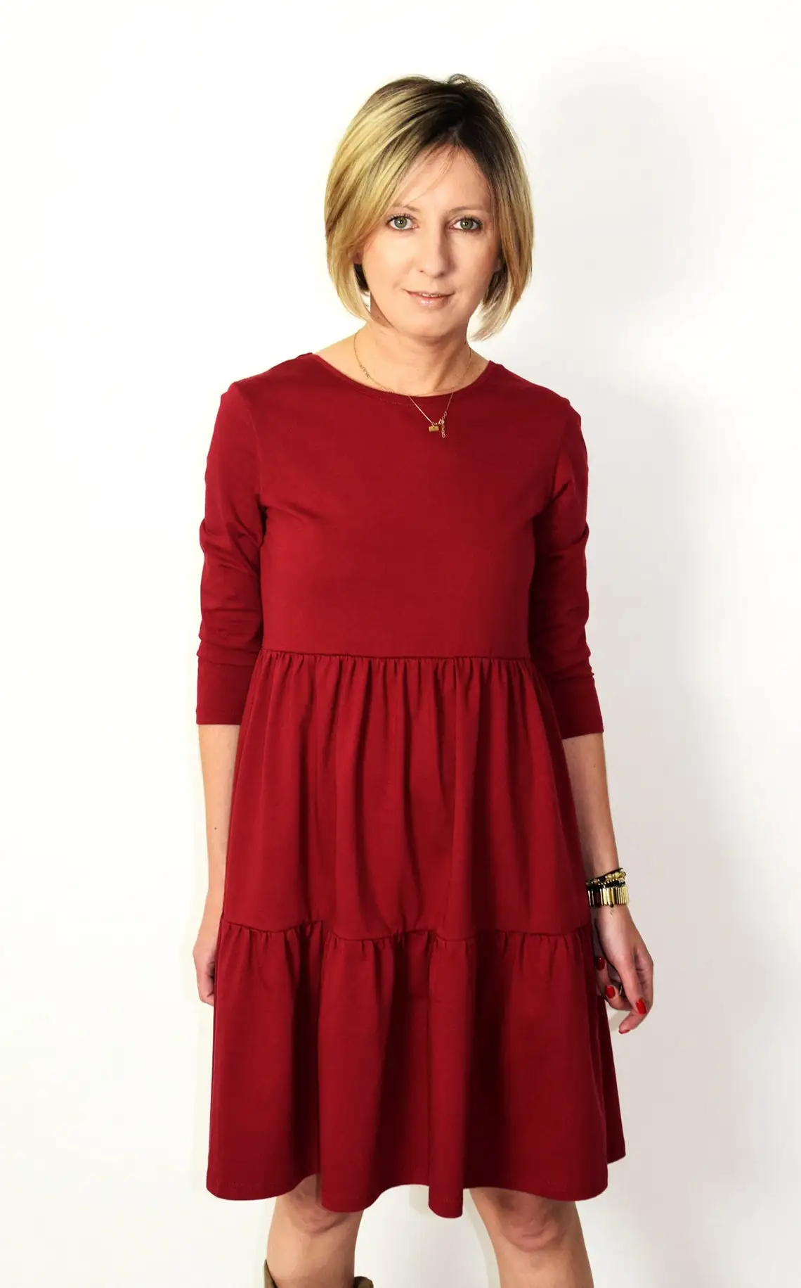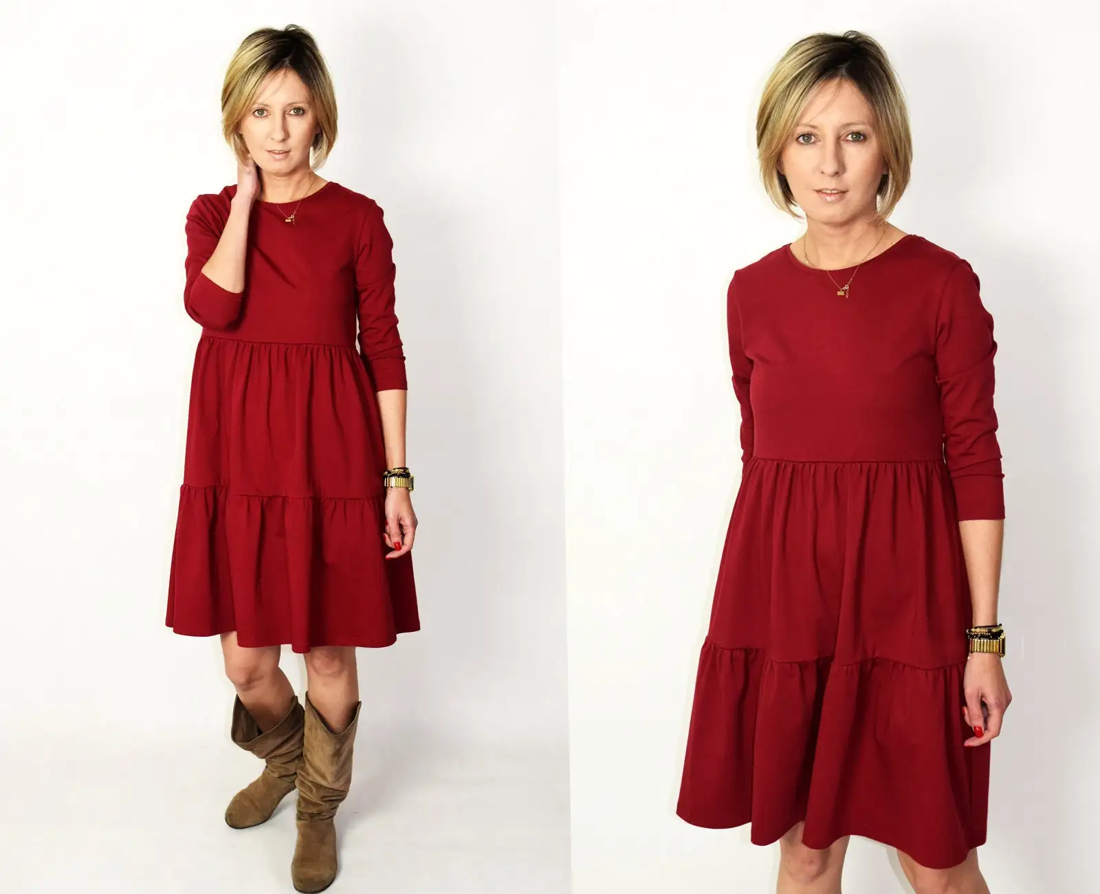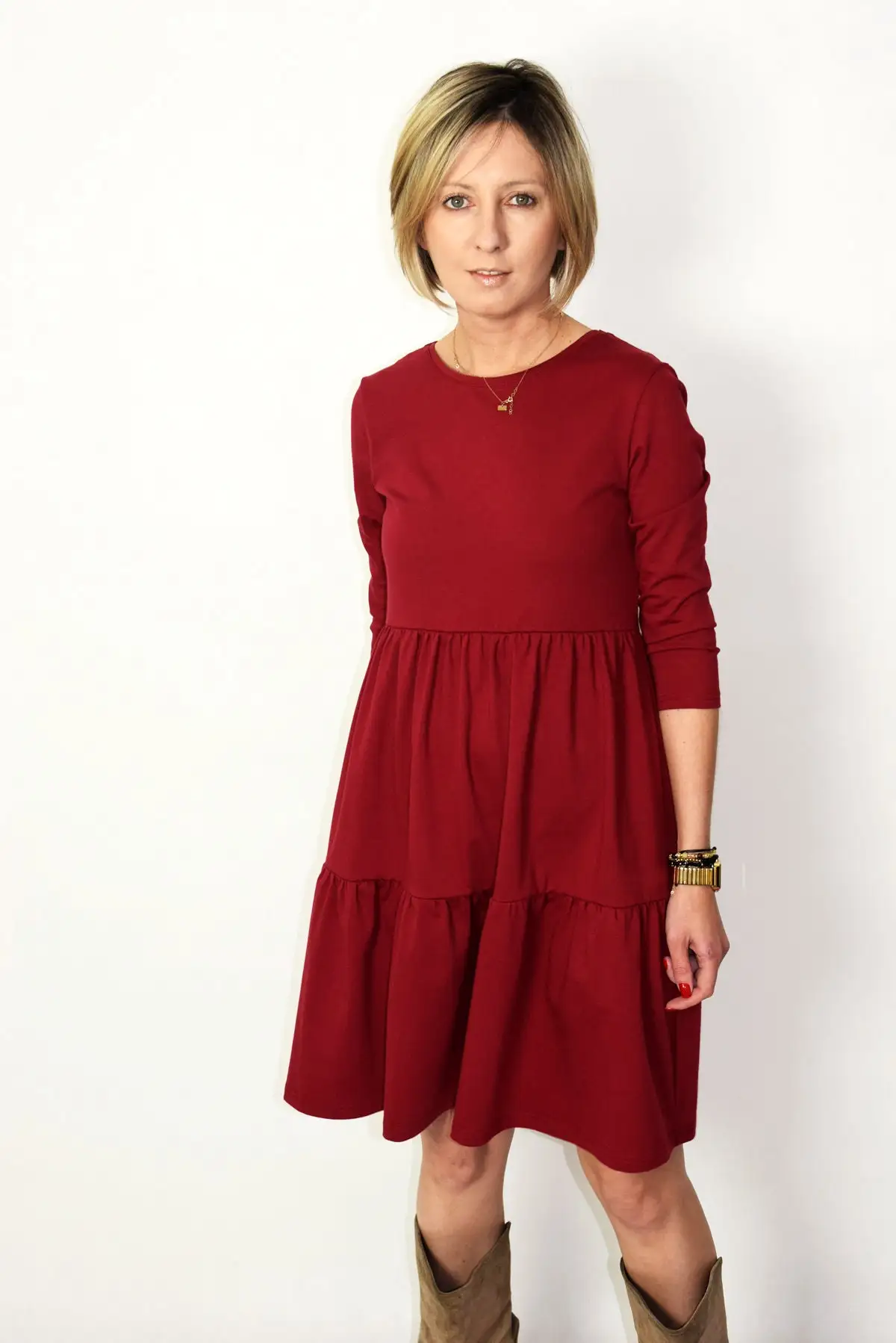 Custom Boho Style Mini Dress Handmade 100% Cotton Dark Red Frills Plus Size Casual Office Wear with Natural Waistline