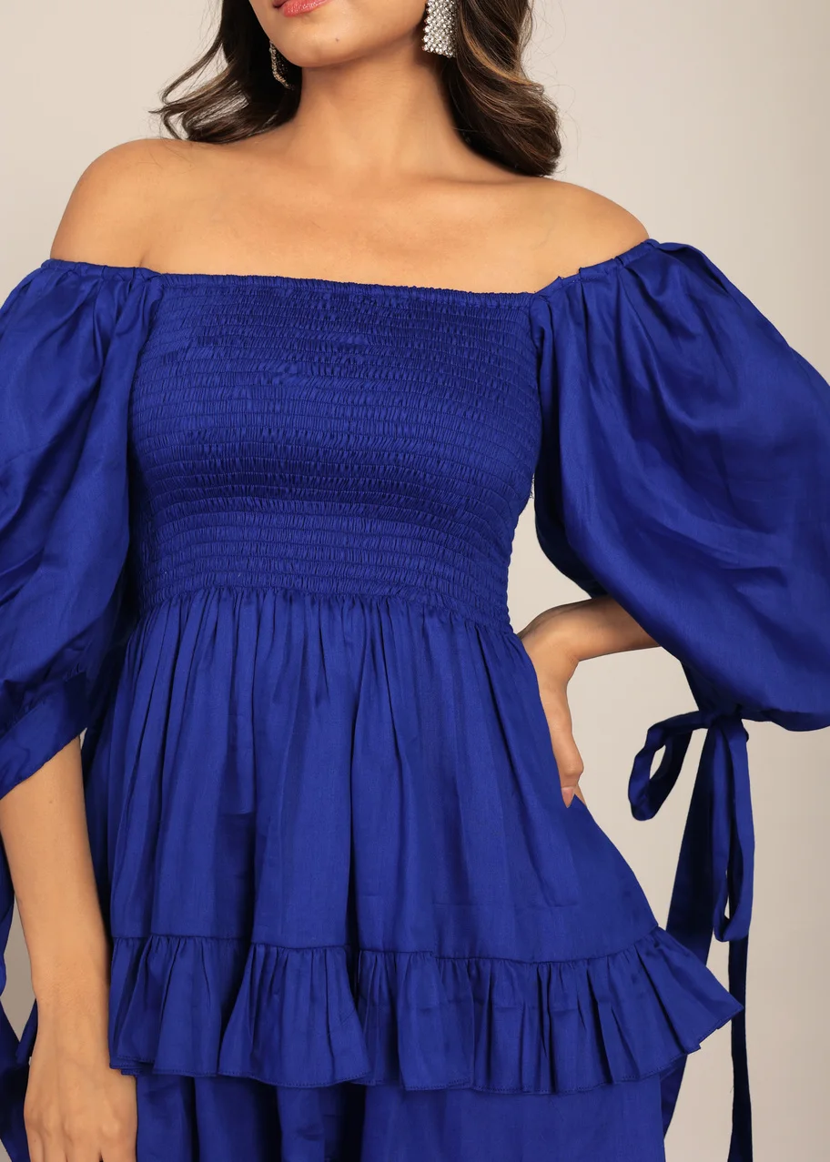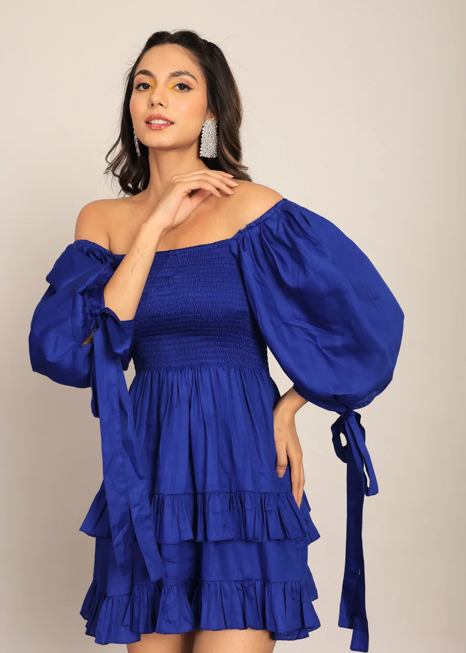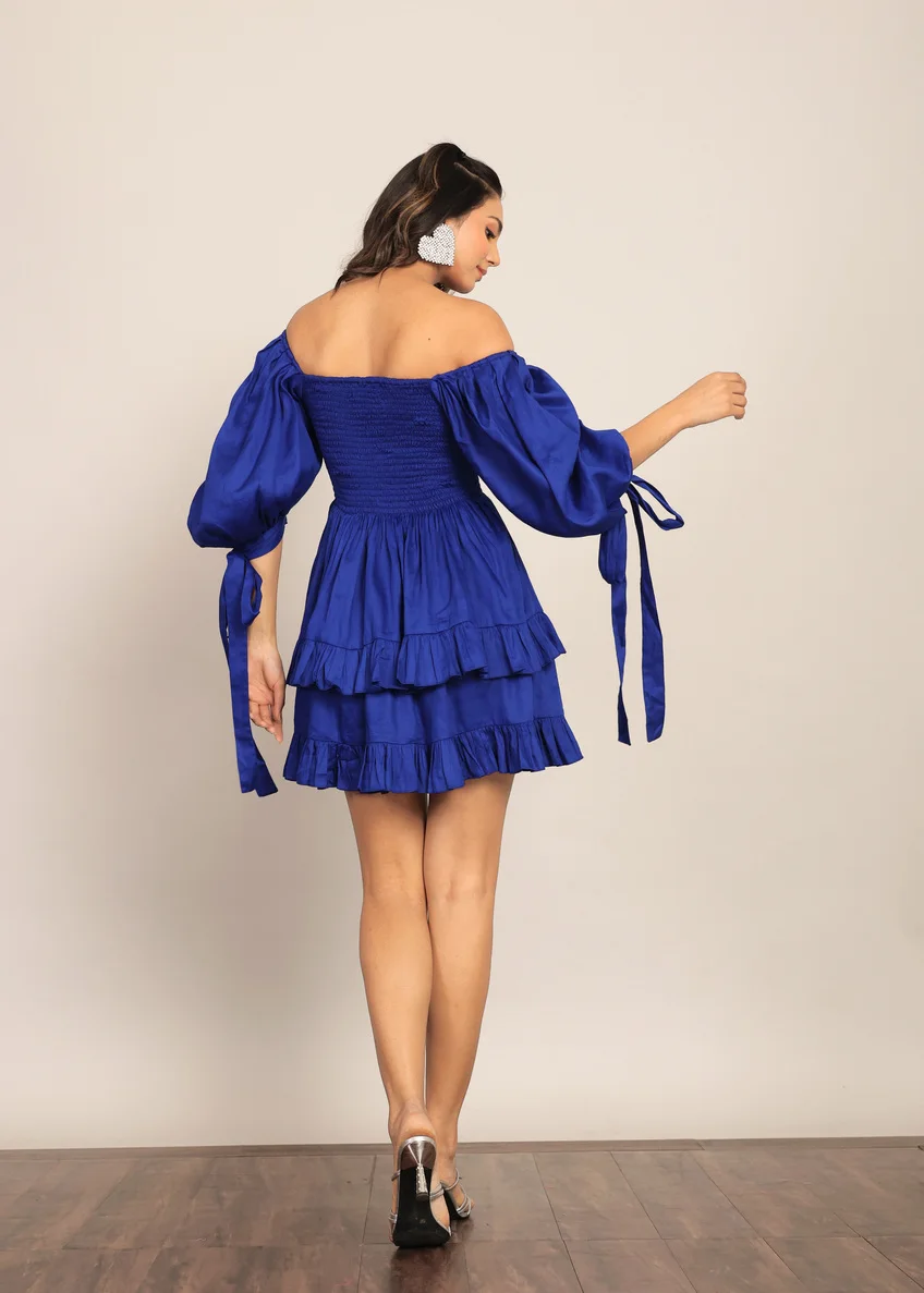 2025 Summer Spring Women's Cotton A-Line Dress Halter-Neck Full Sleeves Blue Solid Skater Bust Fitted Mini Dress Natural Style