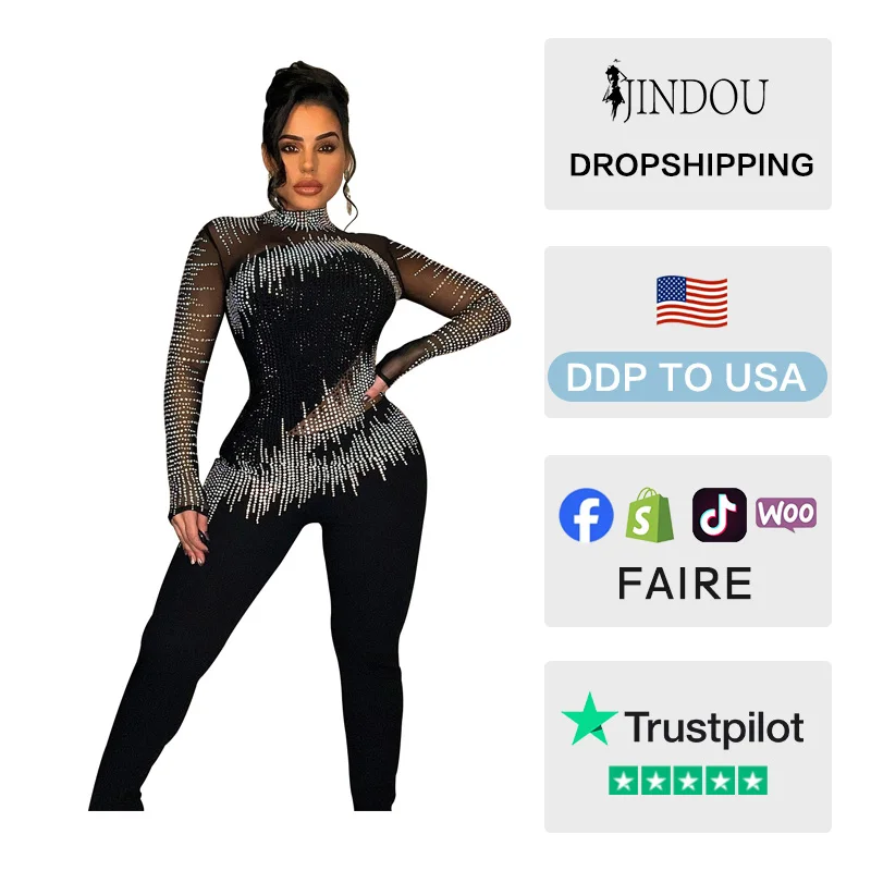 2026 Spring Mesh See Through Solid Casual Rhinestone Beaded Playsuit Club Wear Spring Women Evening Party Jumpsuits