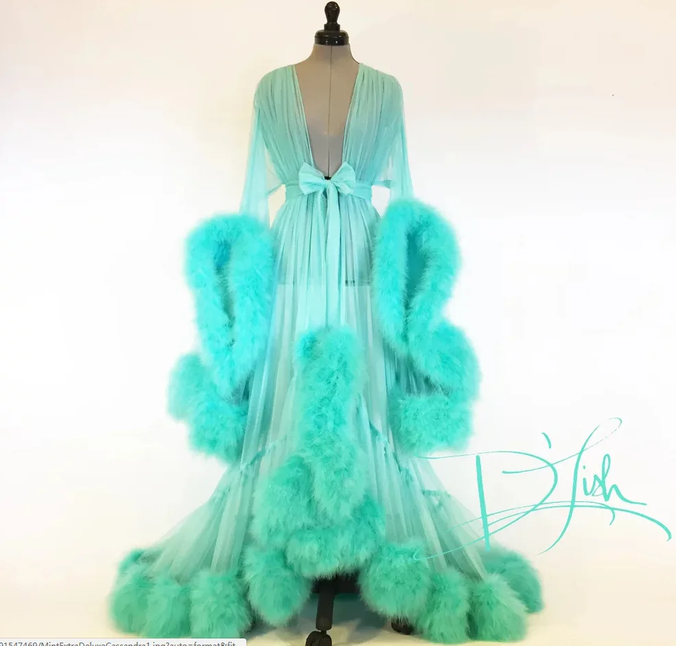 Wholesale Women Sexy Nightgowns Sexy Lingerie Robes Perspective Robe Feathers Women Trumpet Sleeve Trailing See Through Dress