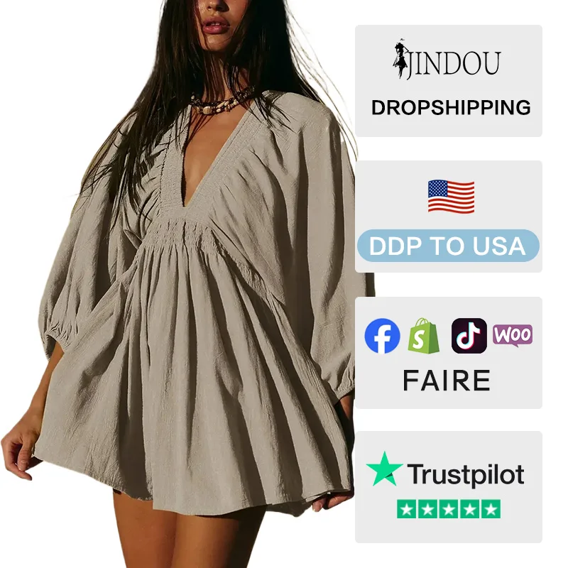 Women's Casual Deep V-neck Mini Dress Long-Sleeved Loose Summer Dress With a Wide Fit at the Waist