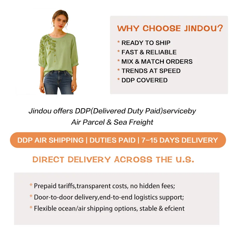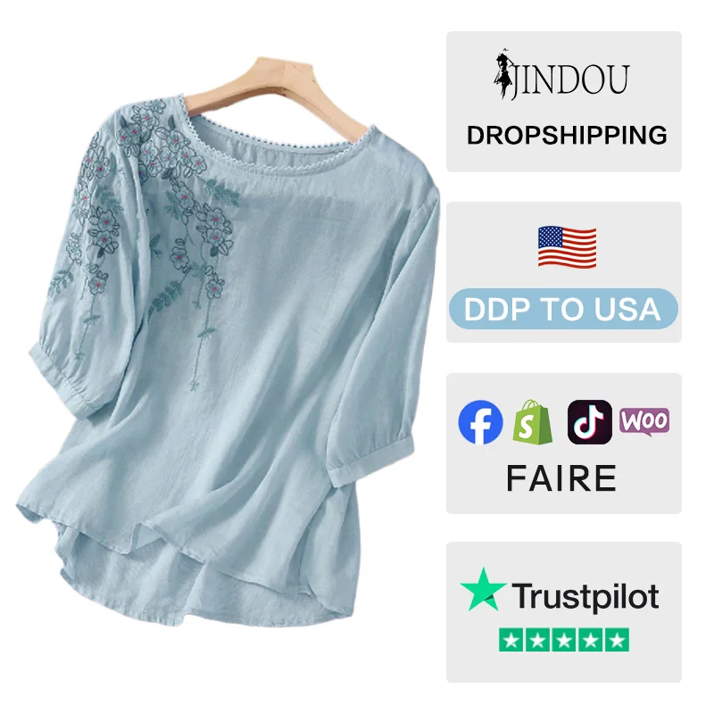 New Fashion Summer Women's Embroidered Casual Summer O-Neck Floral Shirts Women 3 Quater Sleeve Breathable Tops