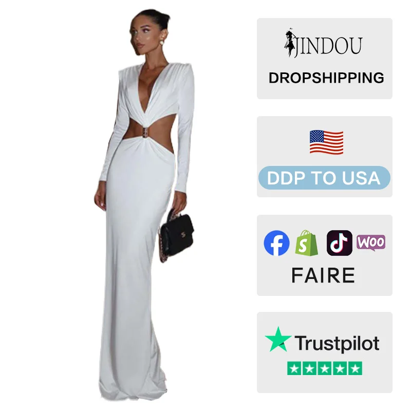 2026 Spring Custom Logo Maxi Dress Women Elegant Deep V Long Sleeve Anti-Static High Waist Sexy Hollow Slim Long Dress